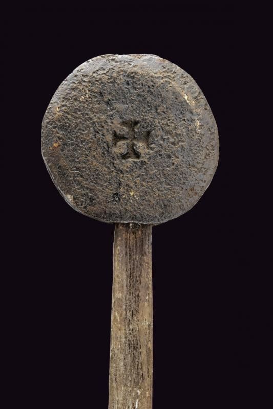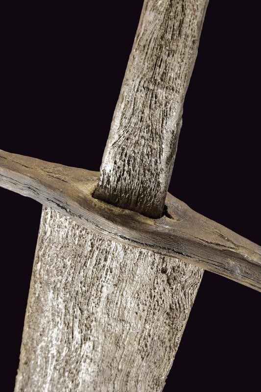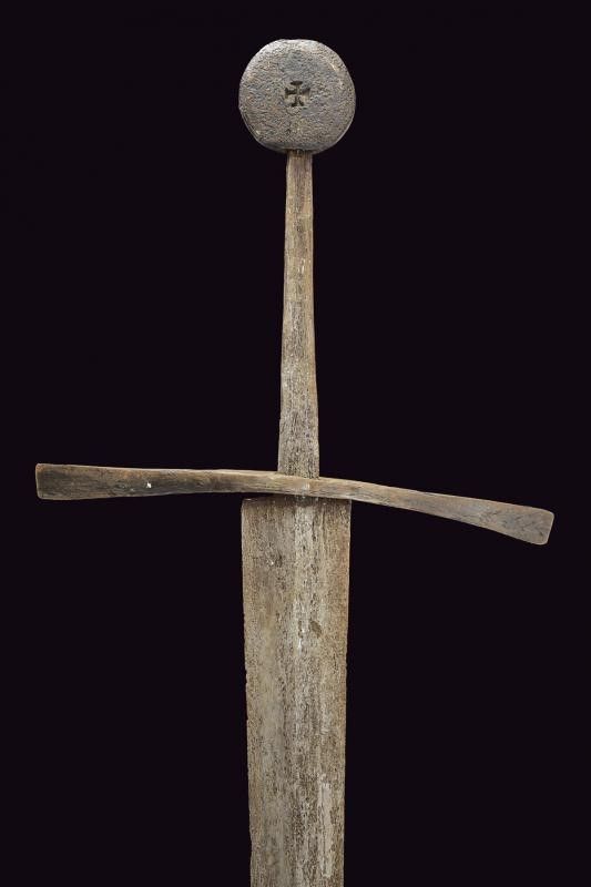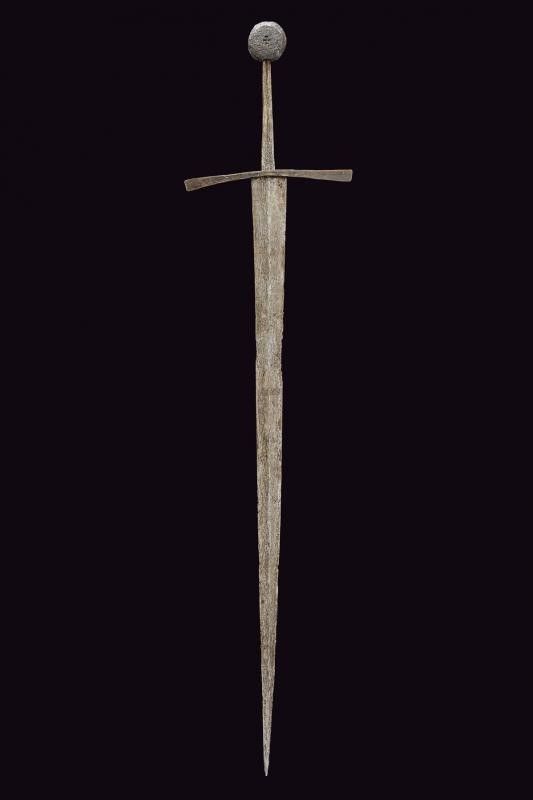 Europa centrale, lunghezza 119 cm. Lama di forma triangolare, a due fili leggermente costolata in mezzeria. Bracci dell'elso piatti, lievemente inclinati verso la lama. Pomo a disco con bordo obliquo e croce al centro su entrambi i lati. Questo lotto è importato da un Paese extra UE e comporta una tassazione aggiuntiva rispetto alla commissione della casa d'aste e alla tassa sul servizio. Di conseguenza, la commissione totale, comprensiva di tutte le tasse, ammonta al 35%.