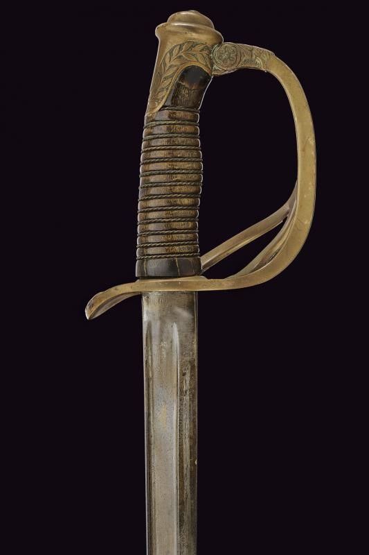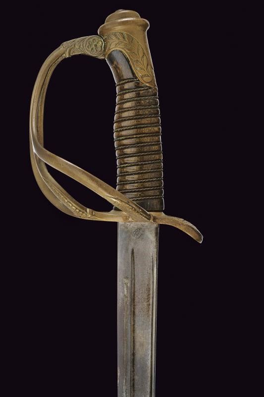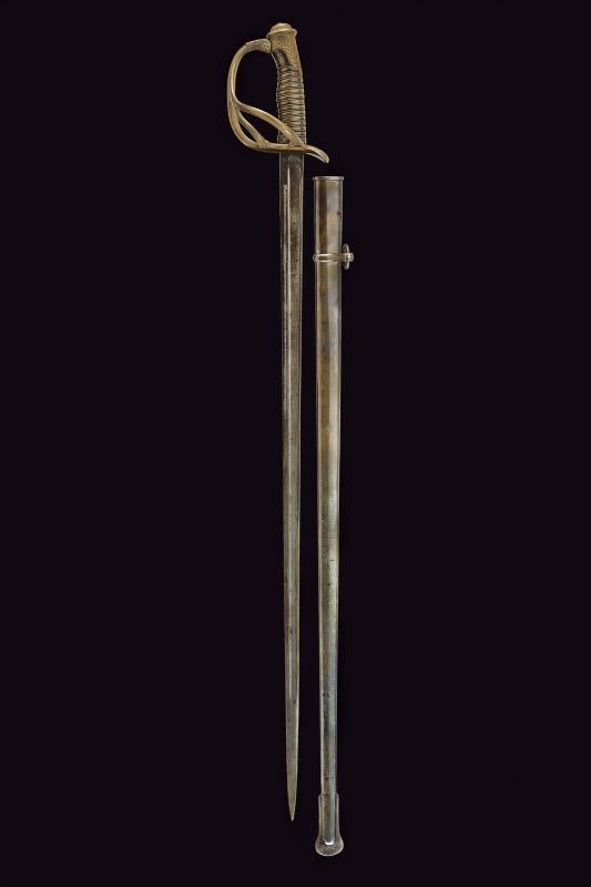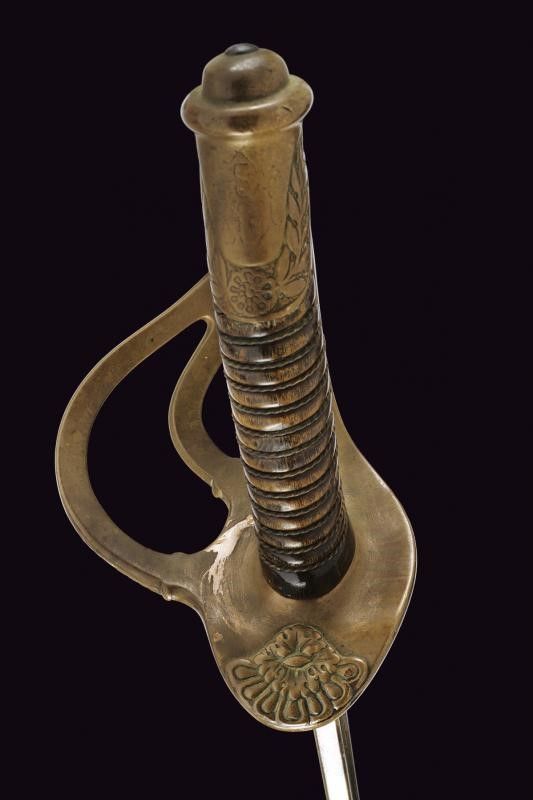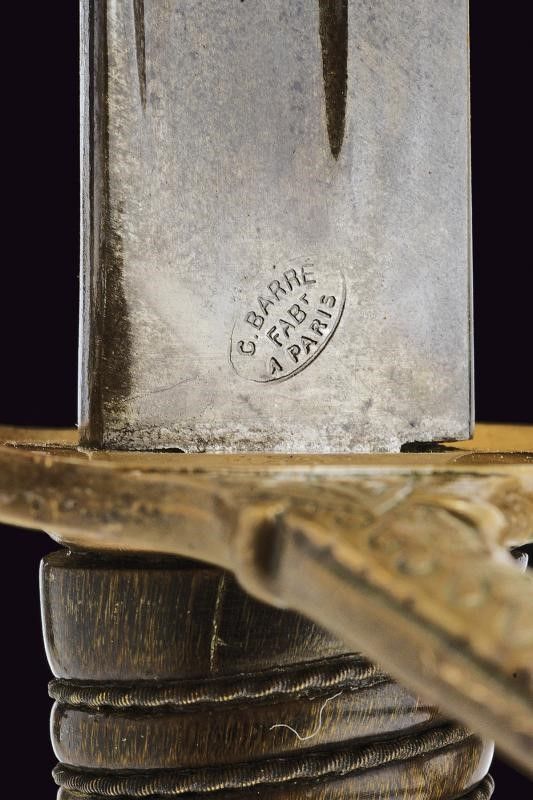 Francia, lunghezza 102 cm. Lama dritta a un filo e controfilo con profonda scanalatura, il dorso con resti di marcatura; tallone marcato 'C. BARRE FAB. A PARIS'. Fornimento in bronzo a tre rami e con cappetta corta; impugnatura in corno a spire con trecciola metallica. Fodero in ferro con un anello di sospensione. Questo lotto è importato da un Paese extra UE e comporta una tassazione aggiuntiva rispetto alla commissione della casa d'aste e alla tassa sul servizio. Di conseguenza, la commissione totale, comprensiva di tutte le tasse, ammonta al 35%.