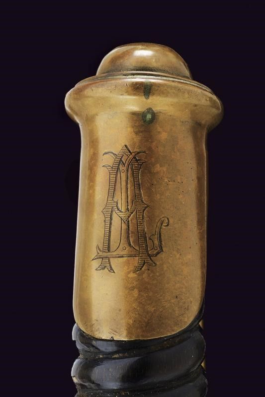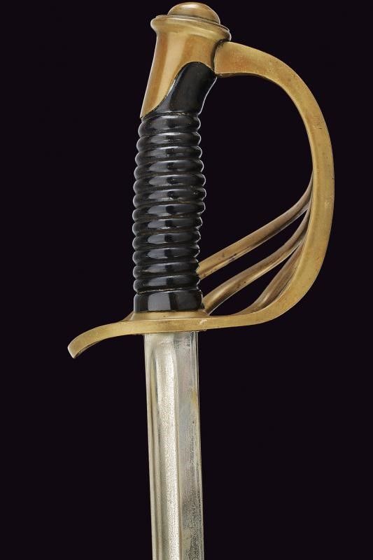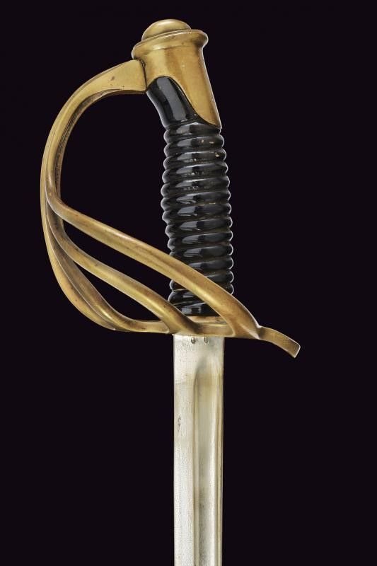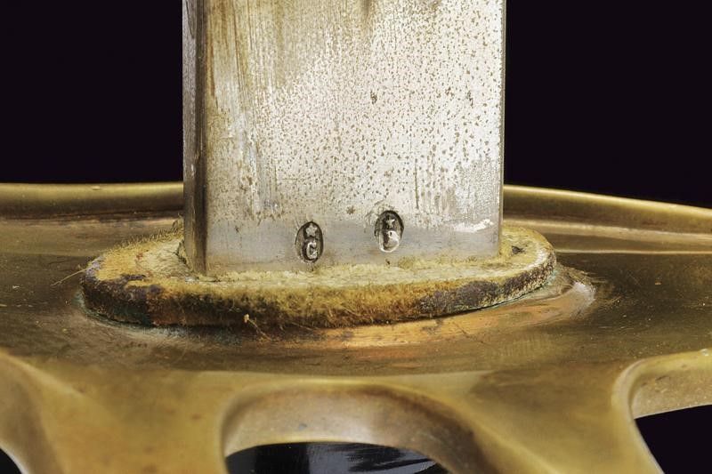 Klingenthal, lunghezza 109 cm. Lama dritta a un filo e controfilo con scanalatura dorsale, il tallone con due punzoni, il dorso marcato 'Coulaux & C. Klingenthal'. Fornimento in bronzo a quattro rami di parata. Cappetta corta, personalizzata con monogramma 'AT'. Impugnatura a spire. Fodero in ferro a una campanella. Questo lotto è importato da un Paese extra UE e comporta una tassazione aggiuntiva rispetto alla commissione della casa d'aste e alla tassa sul servizio. Di conseguenza, la commissione totale, comprensiva di tutte le tasse, ammonta al 35%.
