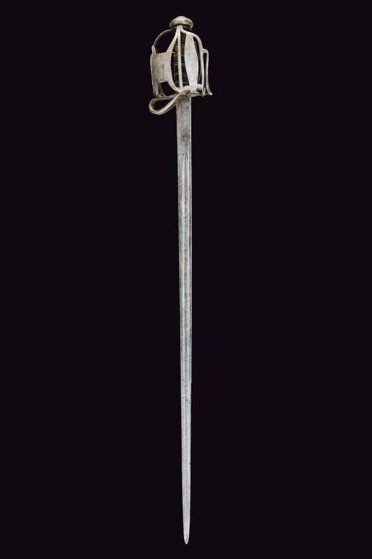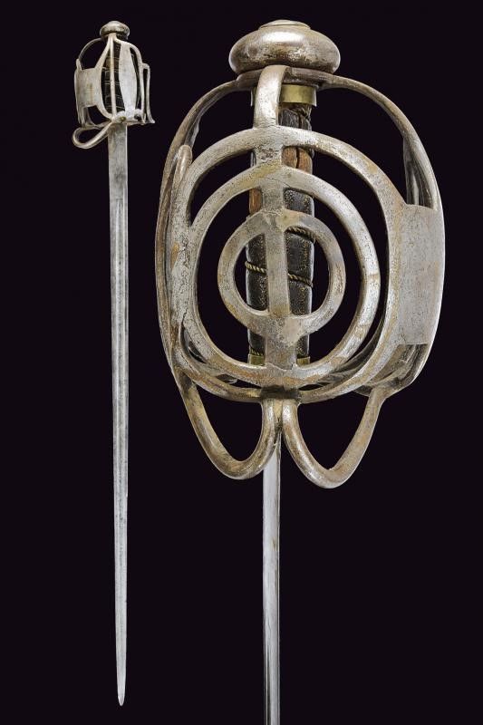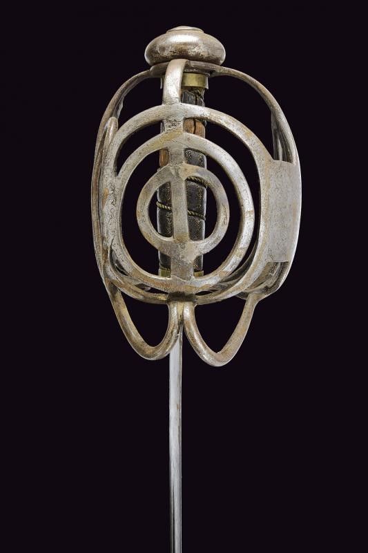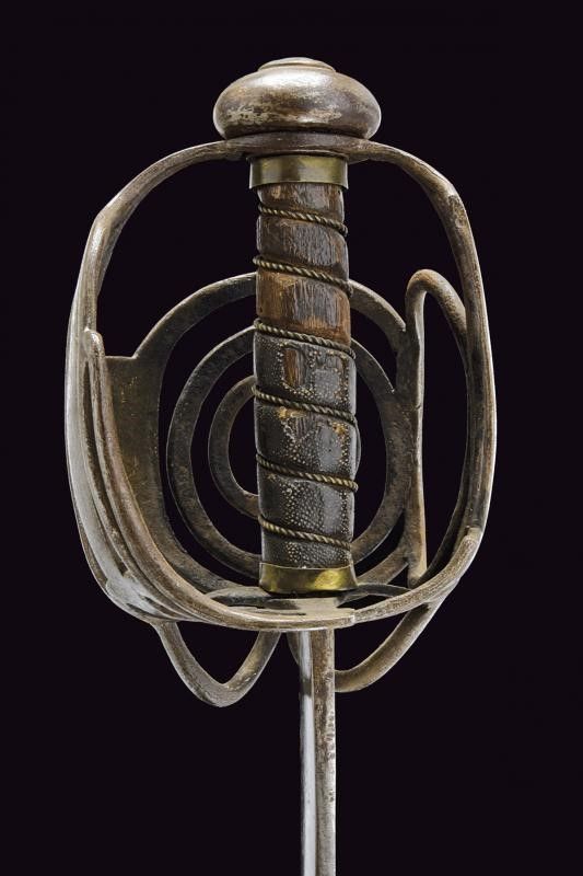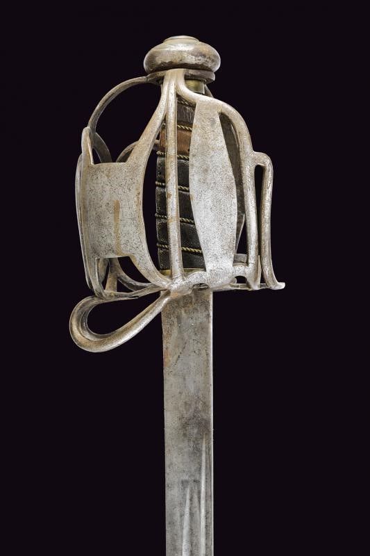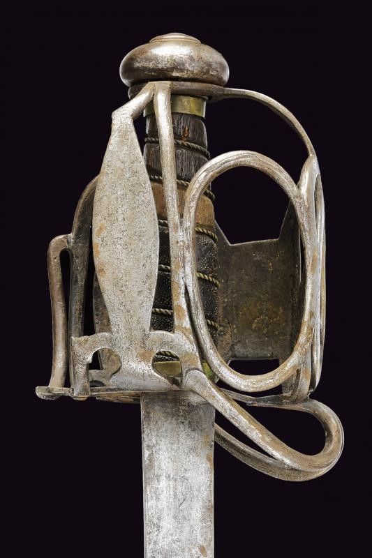Scozia, lunghezza 112.5 cm. Lama dritta a un filo e controfilo, sguscio centrale a tutta lunghezza e sguscio anche sotto il dorso. Fornimento in acciaio con guardia principale ad anelli concentrici fiancheggiata da un ovale e da un pannello di guardia rettangolare, questi a loro volta fiancheggiati da barre e pannelli stretti e rastremati (piccole mancanze e difetti). Pomo ovoidale compresso con bottone largo e basso. Impugnatura scanalata a spirale rivestita con resti di pelle di pesce e trecciola metallica. Questo lotto è importato da un Paese extra UE e comporta una tassazione aggiuntiva rispetto alla commissione della casa d'aste e alla tassa sul servizio. Di conseguenza, la commissione totale, comprensiva di tutte le tasse, ammonta al 35%.