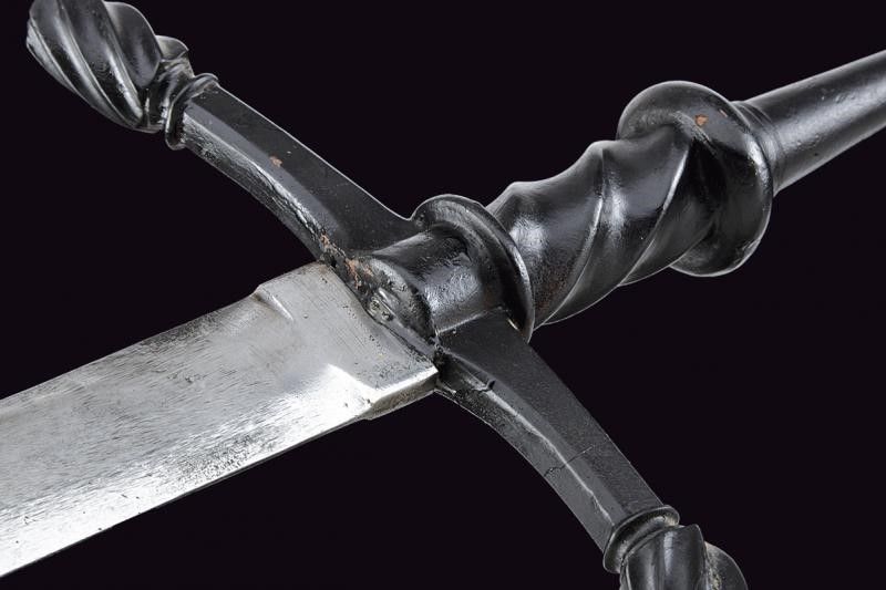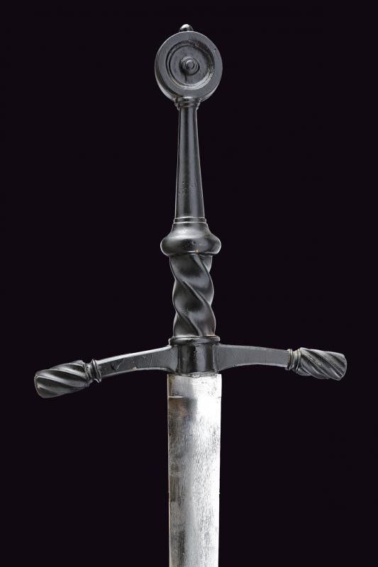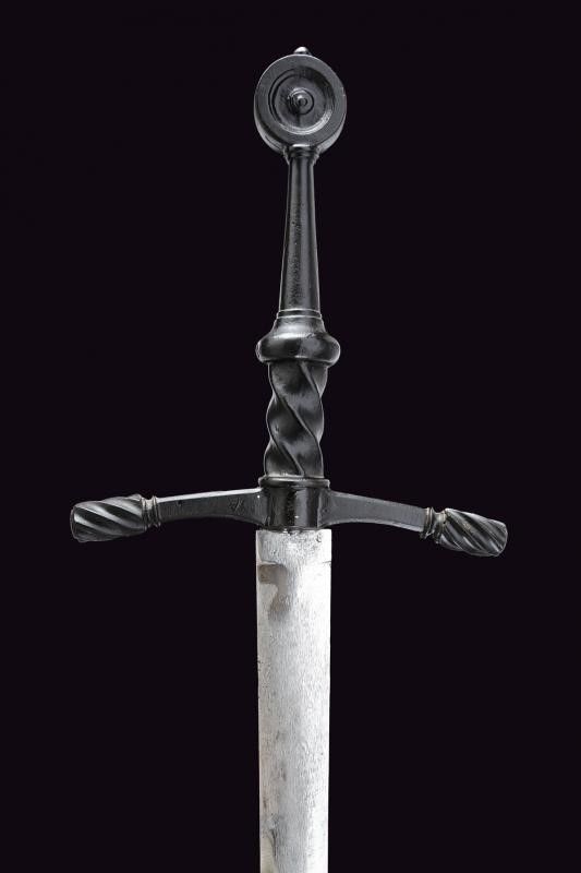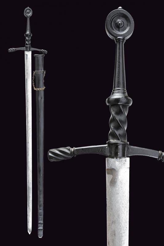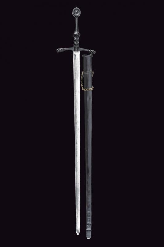 Europa, lunghezza 121.5 cm. Fine del XIX Secolo Lunga lama dritta a due fili di sezione lenticolare con tallone. Fornimento in ferro annerito. Fodero in metallo (qualche intaccatura) annerito e munito di catena. Questo lotto è importato da un Paese extra UE e comporta una tassazione aggiuntiva rispetto alla commissione della casa d'aste e alla tassa sul servizio. Di conseguenza, la commissione totale, comprensiva di tutte le tasse, ammonta al 35%.
