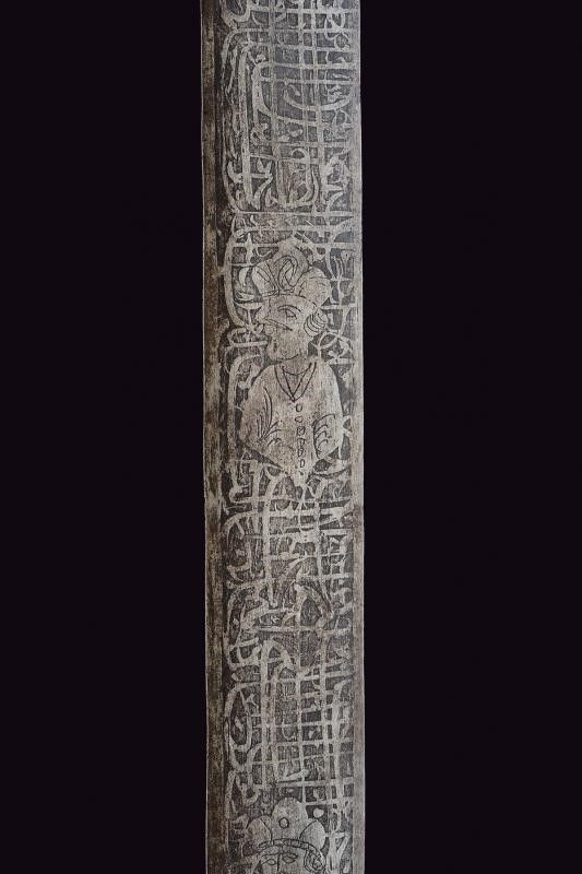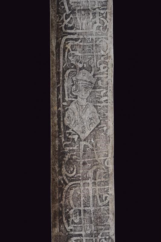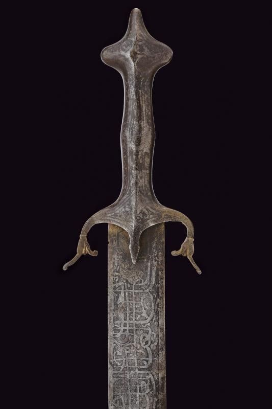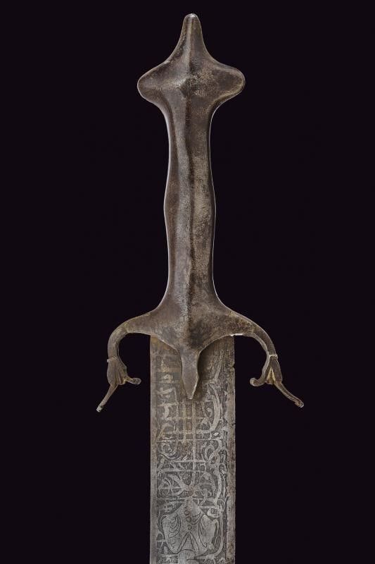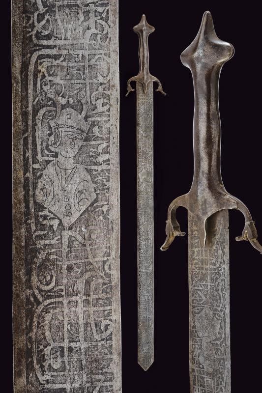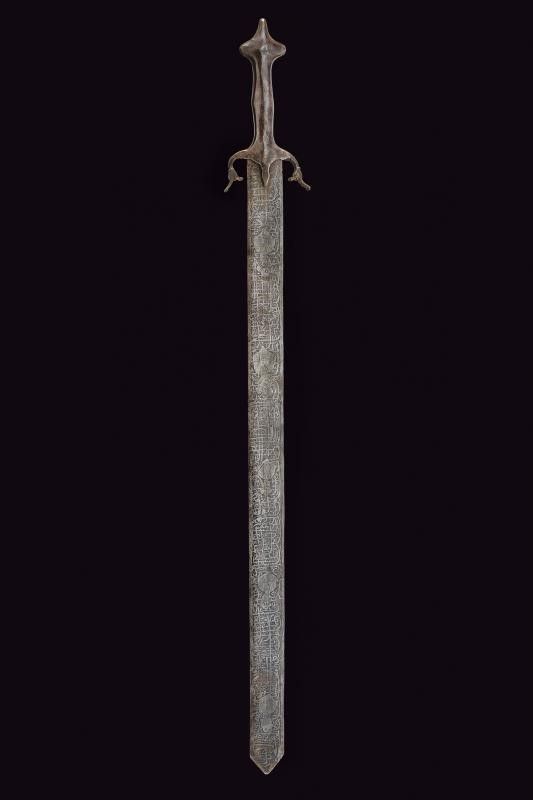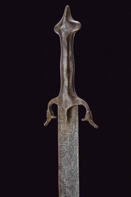 India, lunghezza 85.5 cm. 1900 circa Larga lama dritta a due fili completamente incisa con figure e iscrizioni. Fornimento in ferro. Questo lotto è importato da un Paese extra UE e comporta una tassazione aggiuntiva rispetto alla commissione della casa d'aste e alla tassa sul servizio. Di conseguenza, la commissione totale, comprensiva di tutte le tasse, ammonta al 35%.