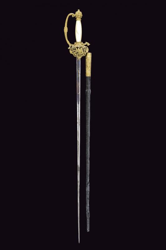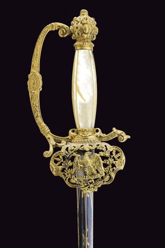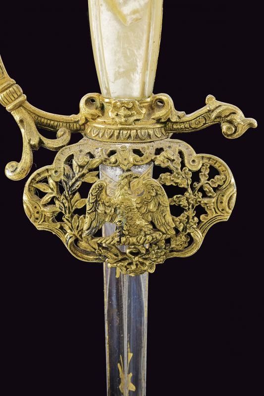 Francia, lunghezza 96 cm. Lama dritta di sezione triangolare con facce incavate, la prima parte incisa e dorata su fondo blu e decorata a trofei e motivi floreali. Fornimento in bronzo con resti di doratura, la pelta traforata con aquila senza corona su fascio tra fronde di alloro e di quercia; il resto con decorazioni floreali. Impugnatura con guancette in madreperla. Resti di fodero (restauri) con cappetta in ottone inciso e dorato. Questo lotto è importato da un Paese extra UE e comporta una tassazione aggiuntiva rispetto alla commissione della casa d'aste e alla tassa sul servizio. Di conseguenza, la commissione totale, comprensiva di tutte le tasse, ammonta al 35%.