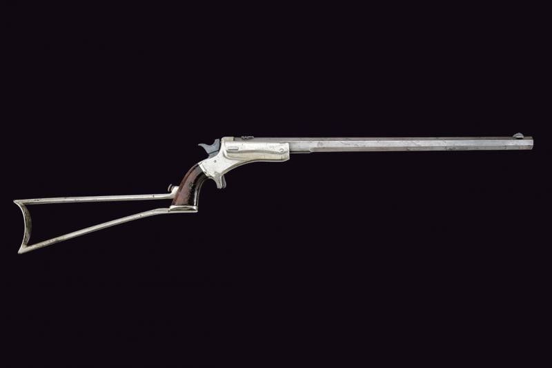 1875 circa Canna rigata (anima pulita, rigatura visibile), ottagonale, marcata 'J. STEVENS A&T CO CHICCPEE FALLS MASS. U.S.A. PAT. SEPT. 6. 1864'; alzo a due foglie, mirino, cal. 36. Castello in ferro con resti di nichelatura. Cane e grilletto a sprone bruniti. Guancette in legno. Completo del calciolo in ferro. Questo lotto è importato da un Paese extra UE e comporta una tassazione aggiuntiva rispetto alla commissione della casa d'aste e alla tassa sul servizio. Di conseguenza, la commissione totale, comprensiva di tutte le tasse, ammonta al 35%.