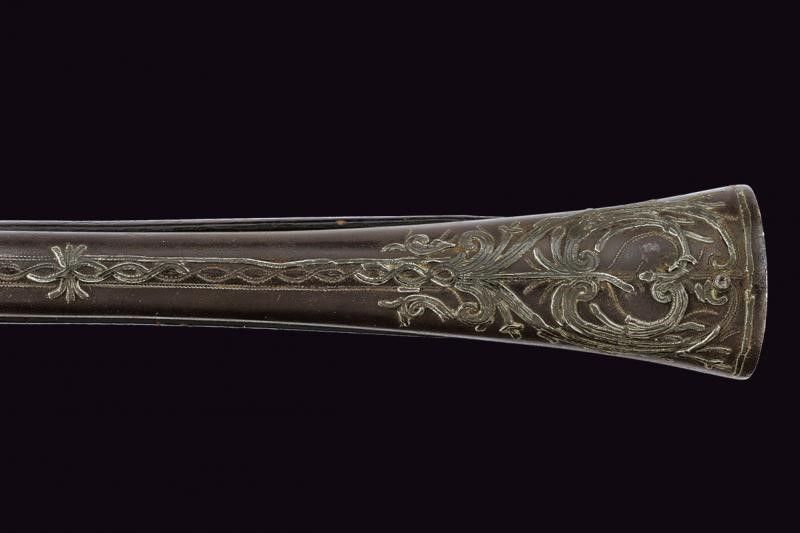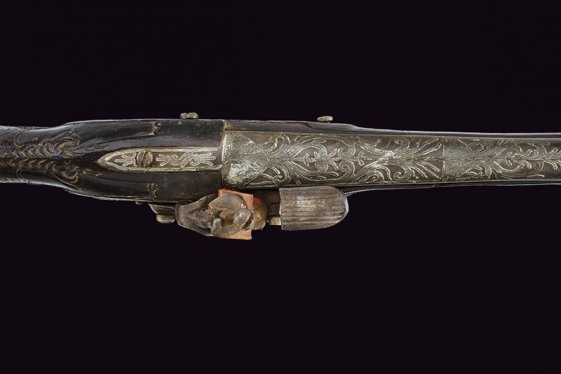 Turchia, lunghezza 72 cm. Secondo quarto del XIX Secolo Canna tonda liscia, fortemente strombata a modo circolare, rivestita con bellissime decorazioni in argento inciso e traforato, munita di mirino. La codetta e la batteria decorate en suite. Cassa intera in legno scolpito a motivi floreali in bassorilievo. Il ponticello in ottone sostituito in tempi d'uso. Piccole mancanze e restauri. Raro. Questo lotto è importato da un Paese extra UE e comporta una tassazione aggiuntiva rispetto alla commissione della casa d'aste e alla tassa sul servizio. Di conseguenza, la commissione totale, comprensiva di tutte le tasse, ammonta al 35%.