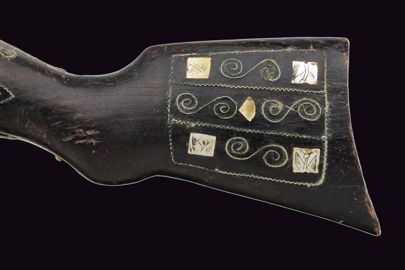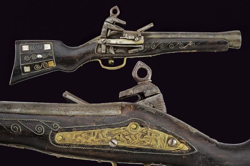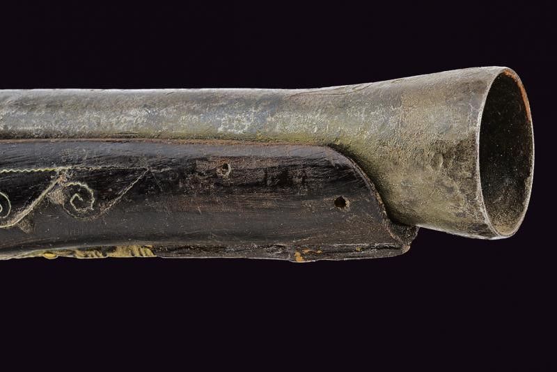 Balcani, lunghezza 47 cm. Metà del XIX Secolo Canna liscia, tonda, incisa motivi floreali e geometrici, la volata strombata. Batteria a pietra focaia con resti di decorazioni in argento, meccanica funzionante. Cassa in legno con decorazioni in madreperla e in filigrana. Ponticello e contropiastra in ottone inciso. Piccoli danni e mancanze. Questo lotto è importato da un Paese extra UE e comporta una tassazione aggiuntiva rispetto alla commissione della casa d'aste e alla tassa sul servizio. Di conseguenza, la commissione totale, comprensiva di tutte le tasse, ammonta al 35%.