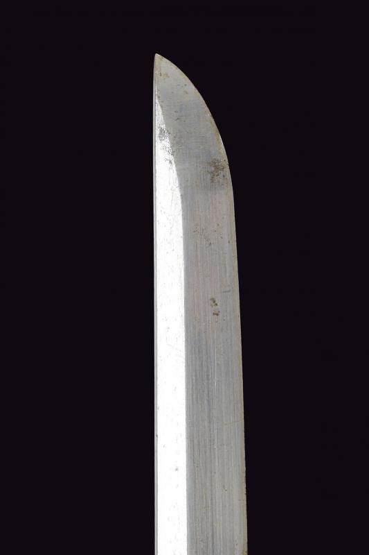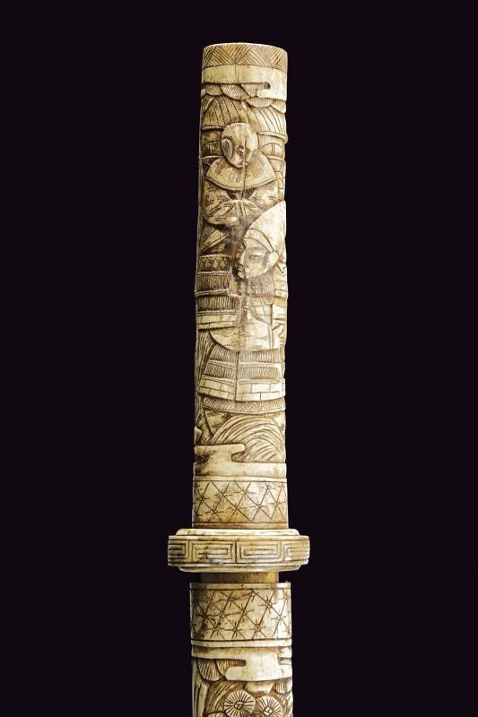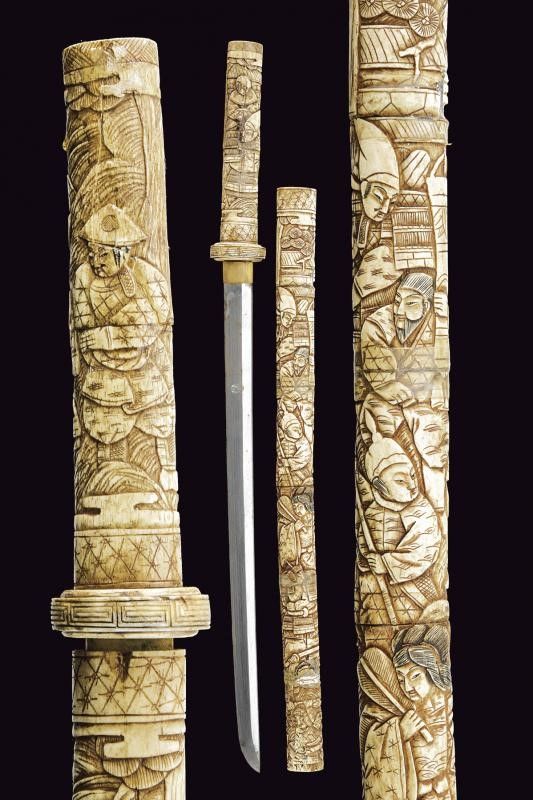Giappone, lunghezza 68.4 cm. 1900 circa Lama leggermente curva con hamon e hada non visibili, piccole abrasioni su un lato. Habaki in rame dorato. Impugnatura e fodero in osso intagliati con figure e motivi floreali. Difetti e piccoli restauri. Questo lotto è importato da un Paese extra UE e comporta una tassazione aggiuntiva rispetto alla commissione della casa d'aste e alla tassa sul servizio. Di conseguenza, la commissione totale, comprensiva di tutte le tasse, ammonta al 35%.