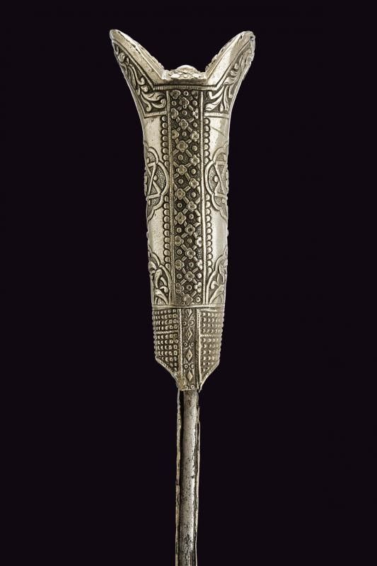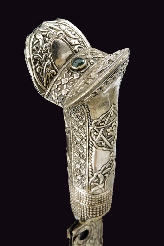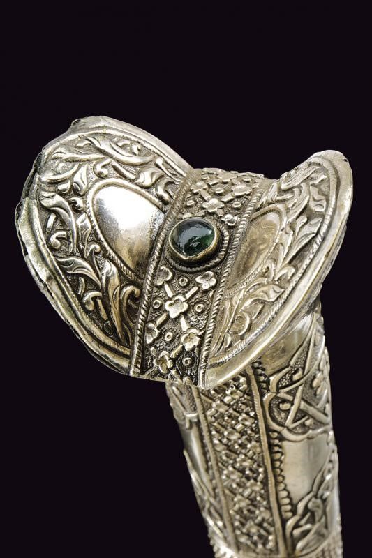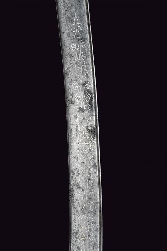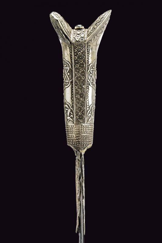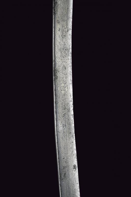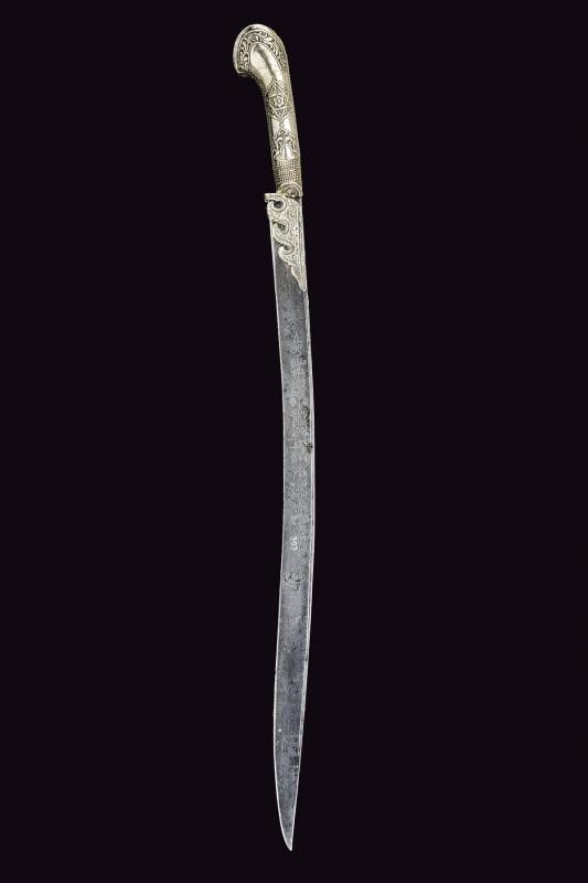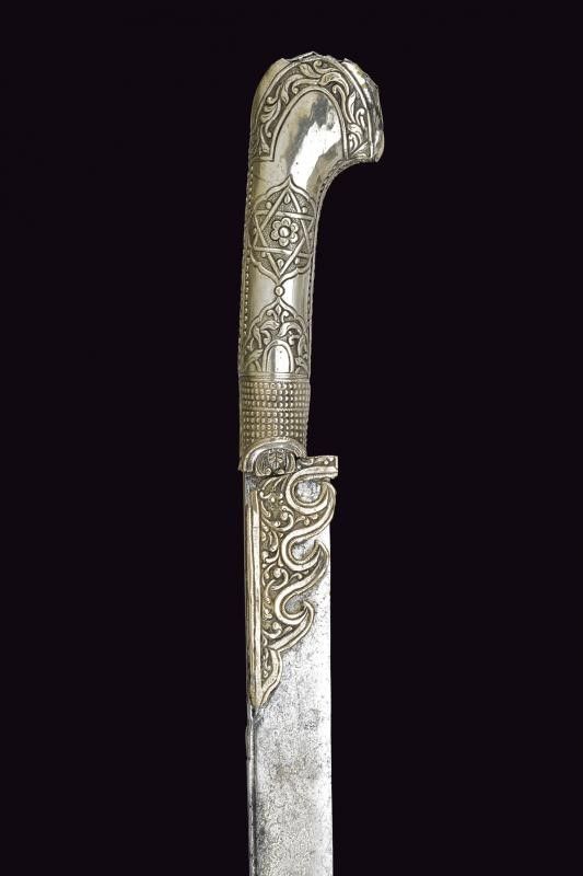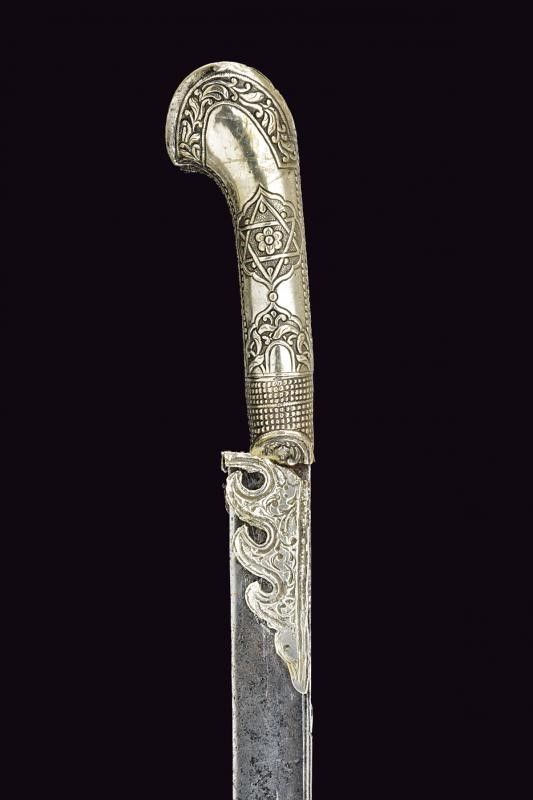 Turchia, lunghezza 72 cm. XIX Secolo Lama di tipica forma leggermente curva a un filo e con sottile scanalatura dorsale. Un lato con lunga iscrizione in Arabo e decorata a motivi floreali, il lato opposto con decorazioni floreali. Il fornimento e le alette ferma-lama in lamina d'argento finemente sbalzati a motivi floreali. Piccoli difetti e mancanze. Questo lotto è importato da un Paese extra UE e comporta una tassazione aggiuntiva rispetto alla commissione della casa d'aste e alla tassa sul servizio. Di conseguenza, la commissione totale, comprensiva di tutte le tasse, ammonta al 35%.
