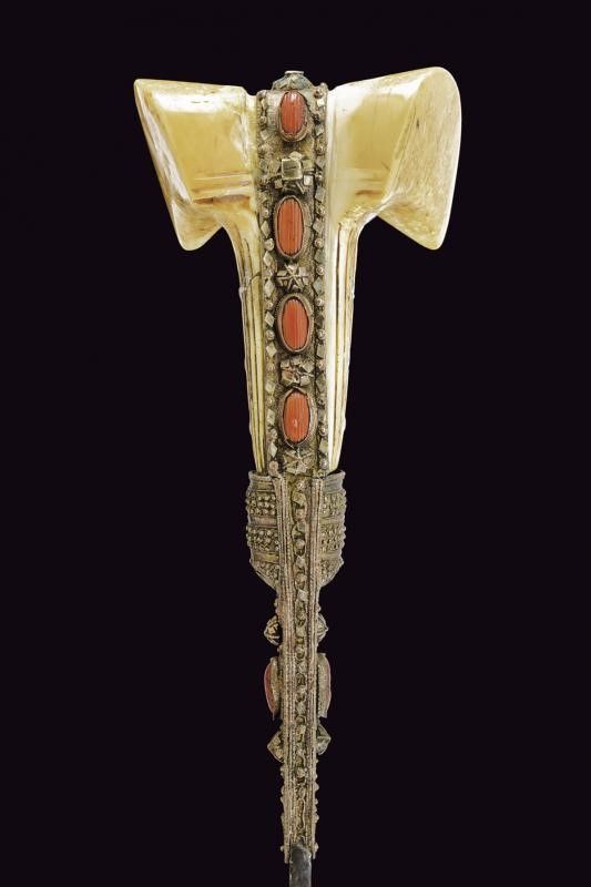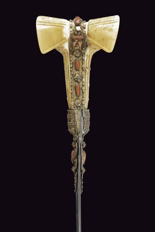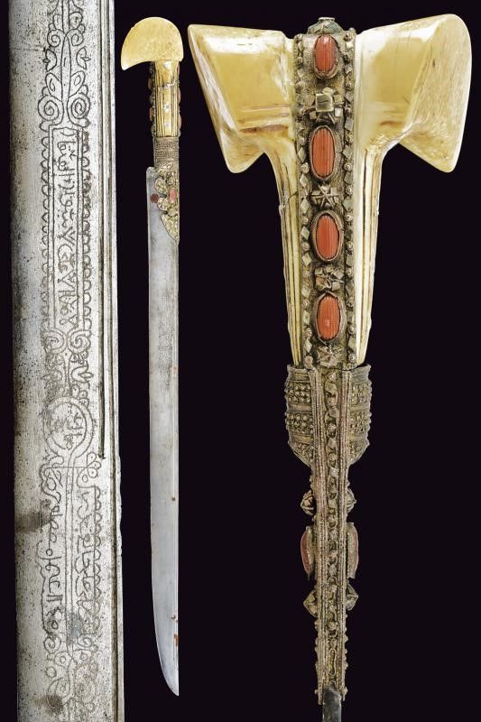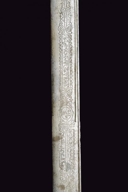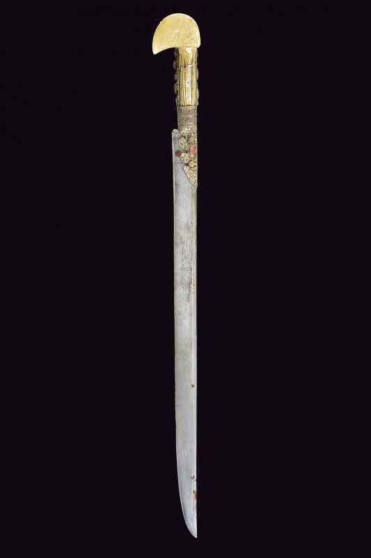 Turchia, lunghezza 75.5 cm. Prima metà del XIX Secolo Lama dritta a un filo con sottile duplice scanalatura dorsale, decorata con incisioni ed iscrizioni in arabo su un lato e con decorazioni floreali sull'altro. Fornimento in ottone decorato in filigrana e con pietre rosse a cabochon. Guancette con grandi orecchie in avorio di tricheco. Piccoli difetti e restauri. Privo di fodero. Questo lotto è importato da un Paese extra UE e comporta una tassazione aggiuntiva rispetto alla commissione della casa d'aste e alla tassa sul servizio. Di conseguenza, la commissione totale, comprensiva di tutte le tasse, ammonta al 35%.