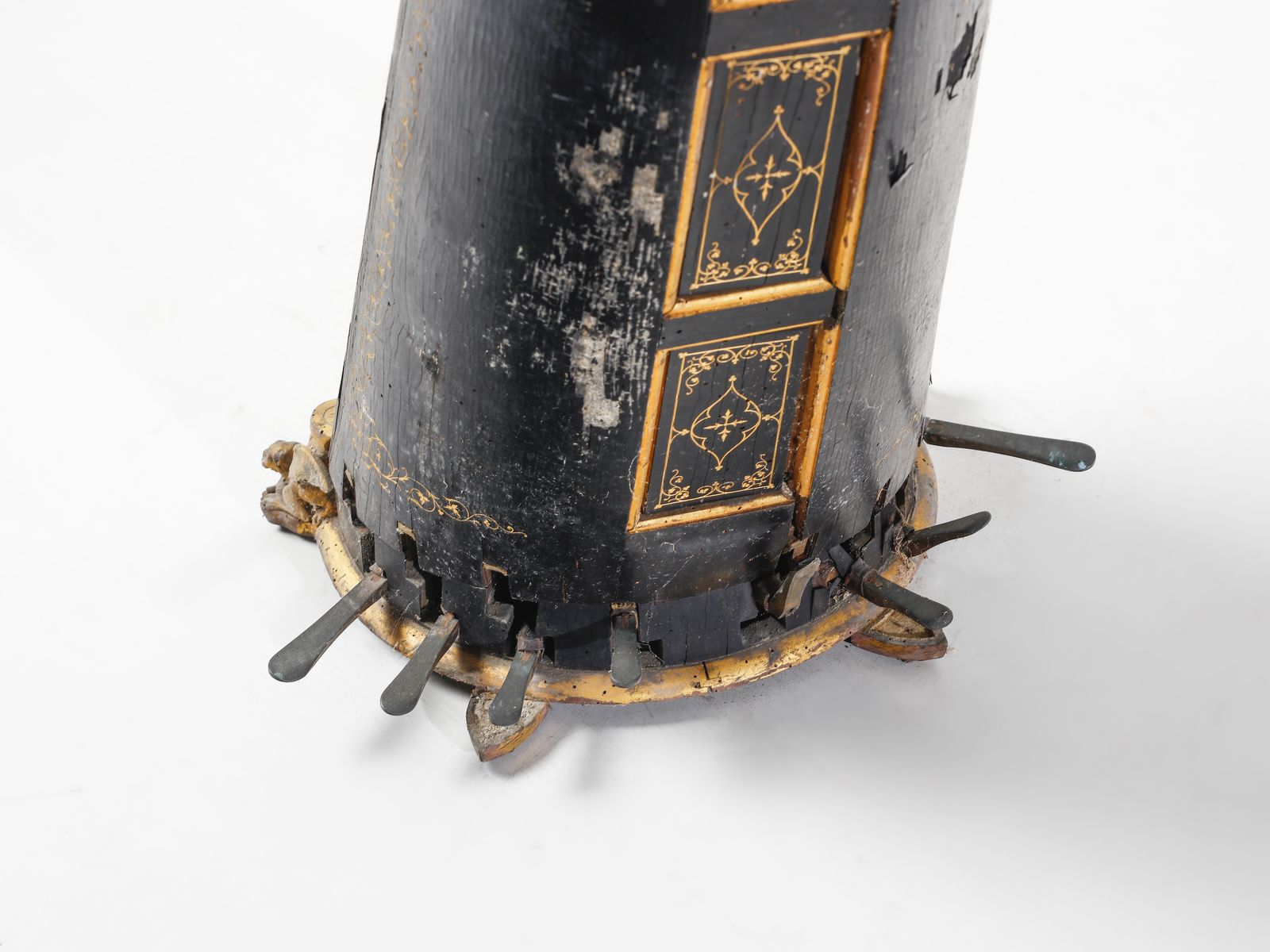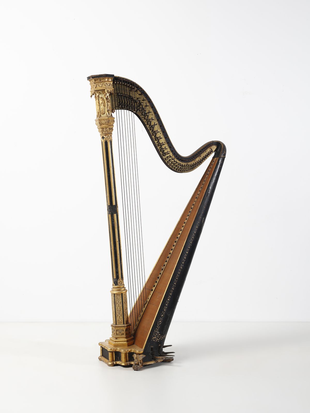 Arpa in legno intagliato, parzialmente dorato ed ebanizzato, inserti in ottone