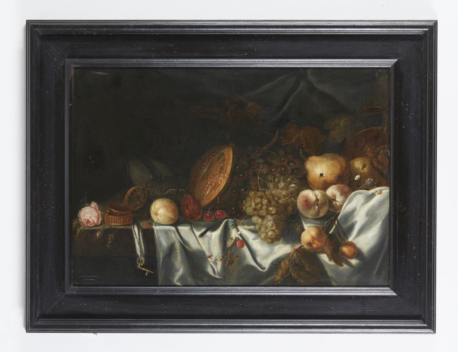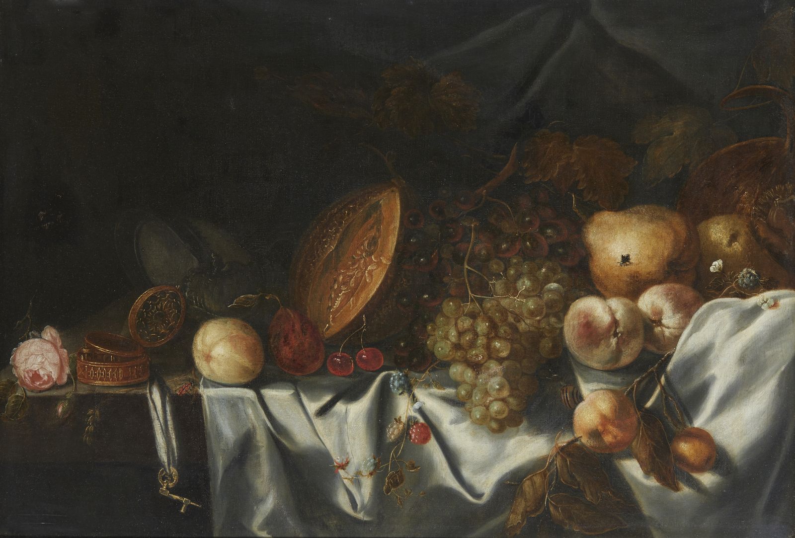 Attribuito a. Natura morta con melone, frutta e nautilus