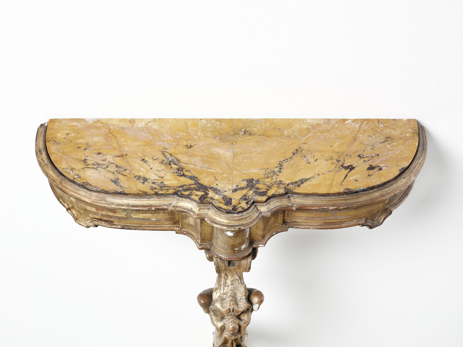Consolle in legno intagliato e dorato, fusto con decoro a maschera grottesca, piano [..]