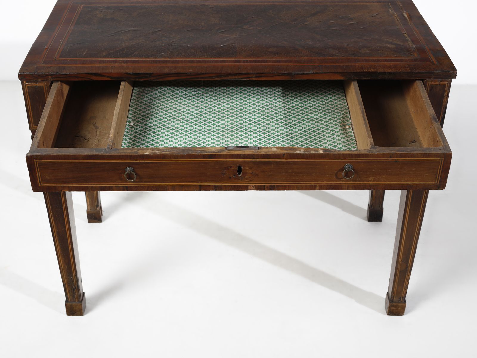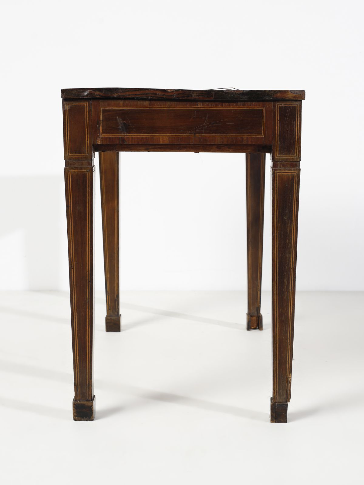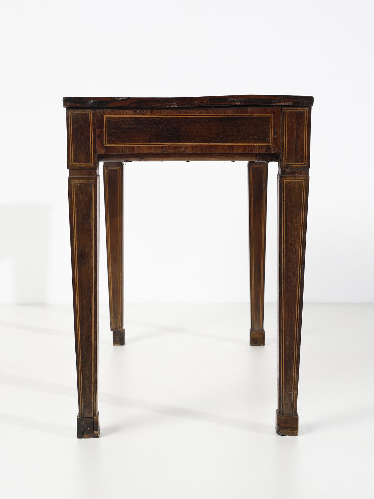 Consolle lastronata e filettata, cassetto sul fronte e gambe troncopiramidali