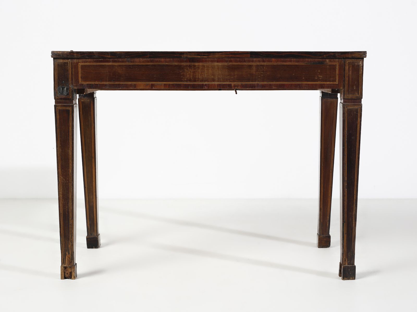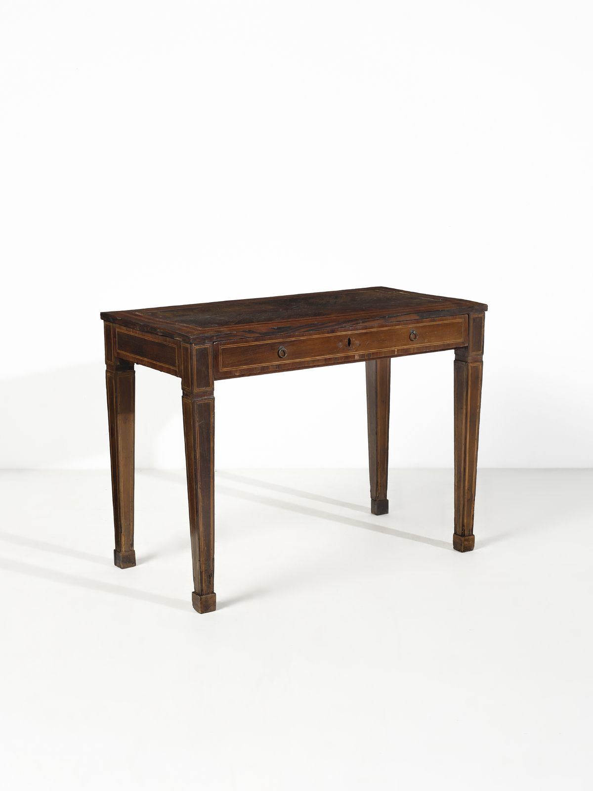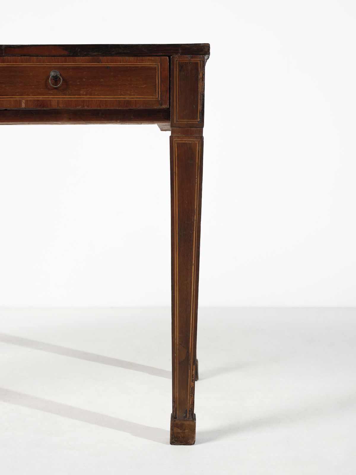Consolle lastronata e filettata, cassetto sul fronte e gambe troncopiramidali