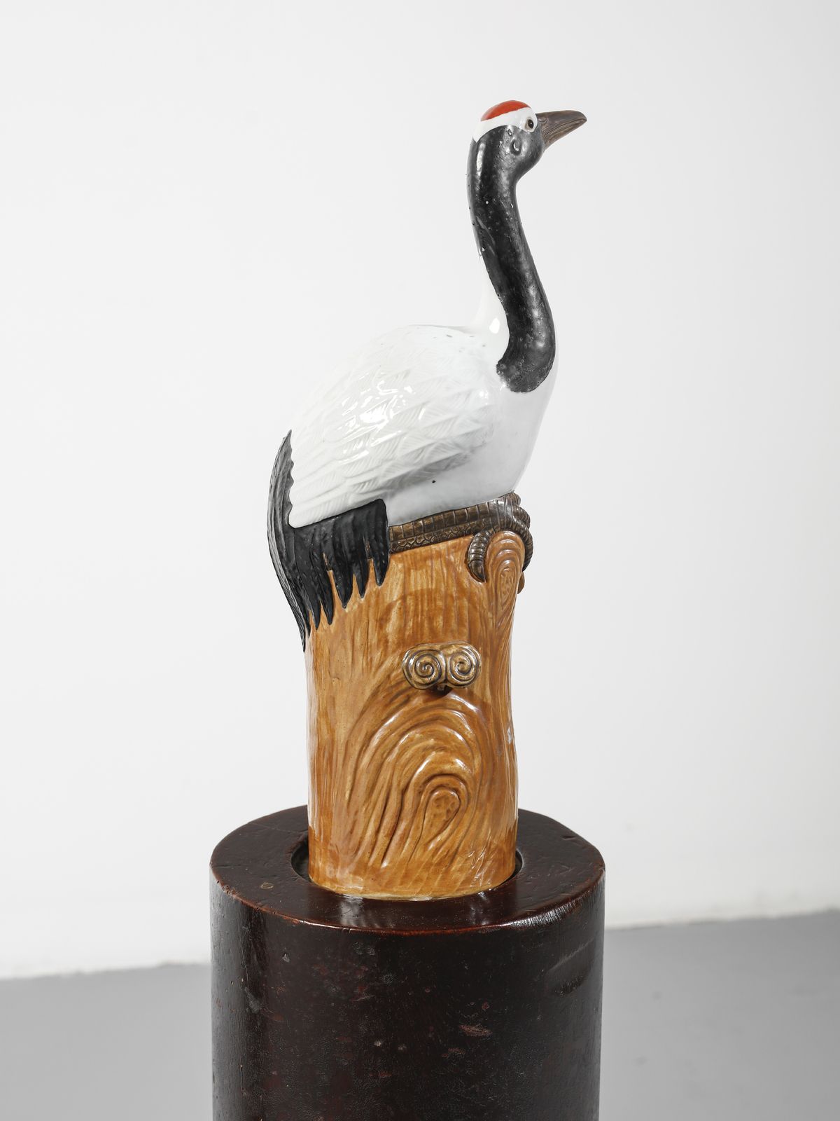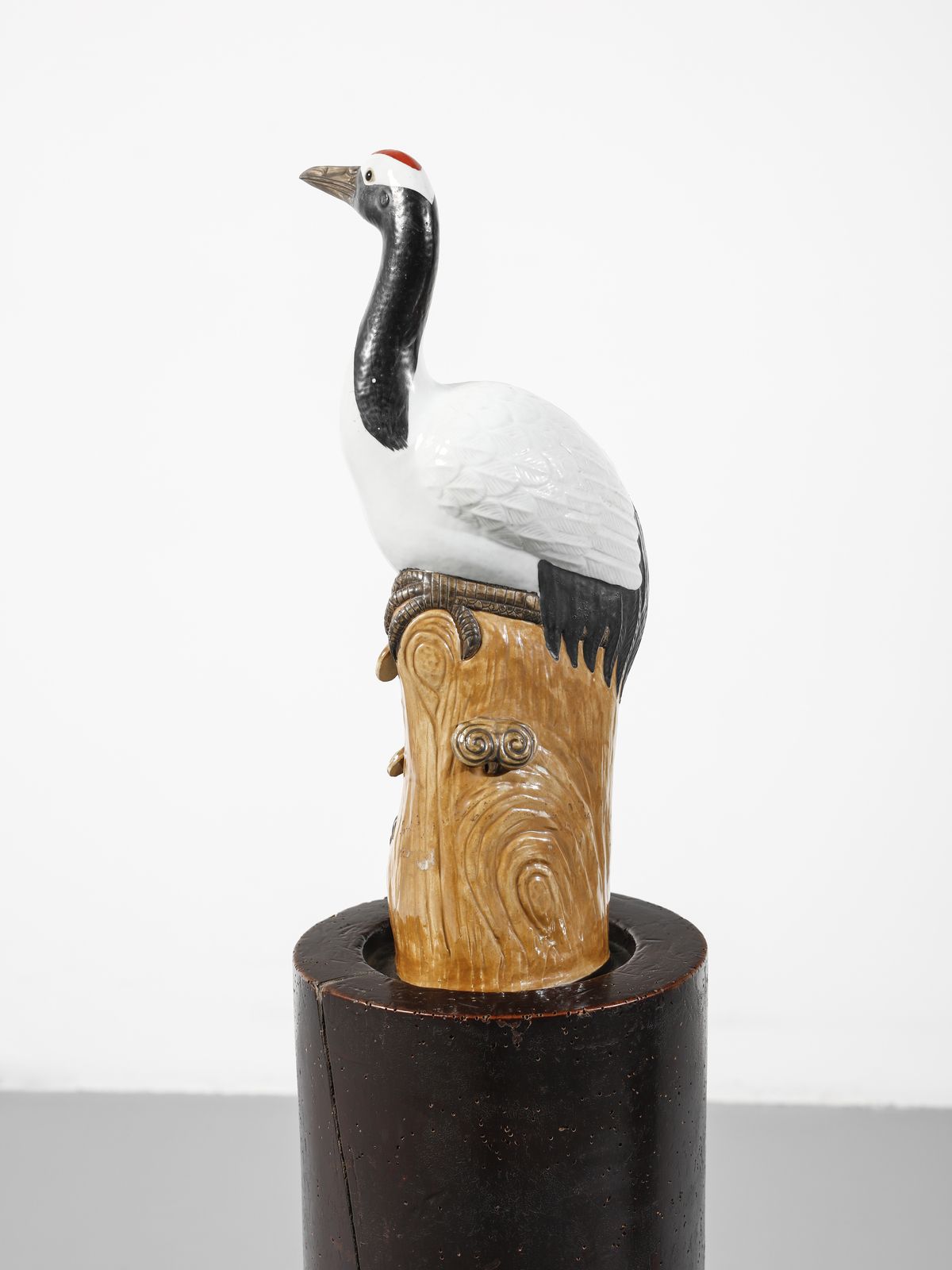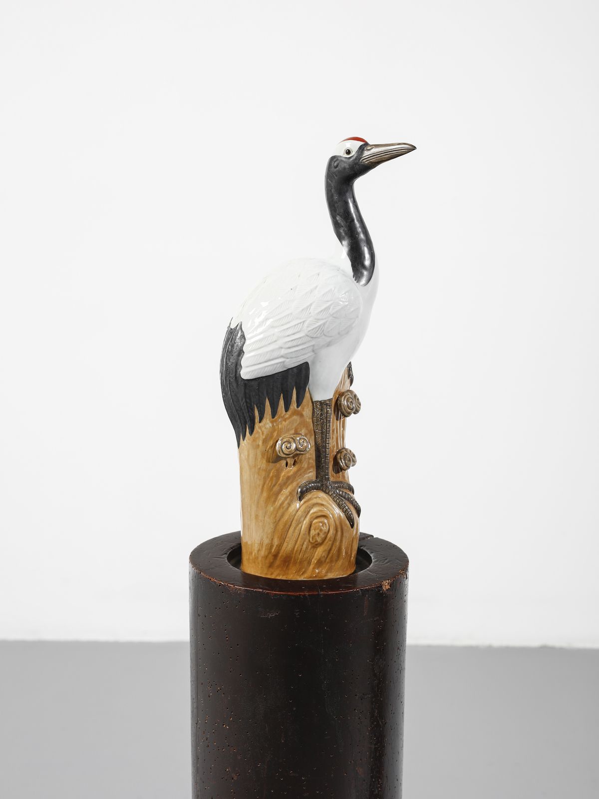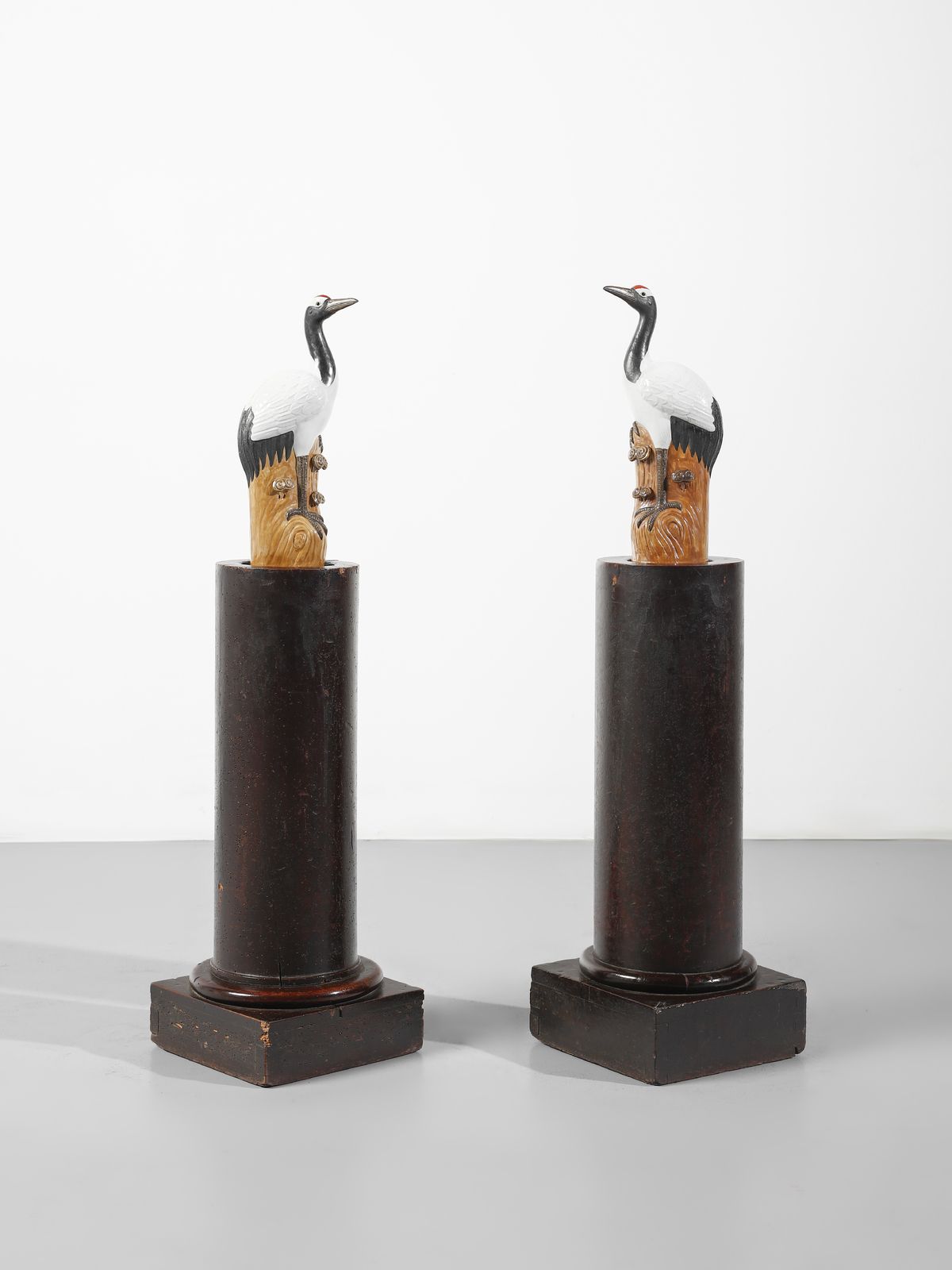 Coppia di aironi in ceramica policroma e invetriata, assemblati su colonne in legno [..]