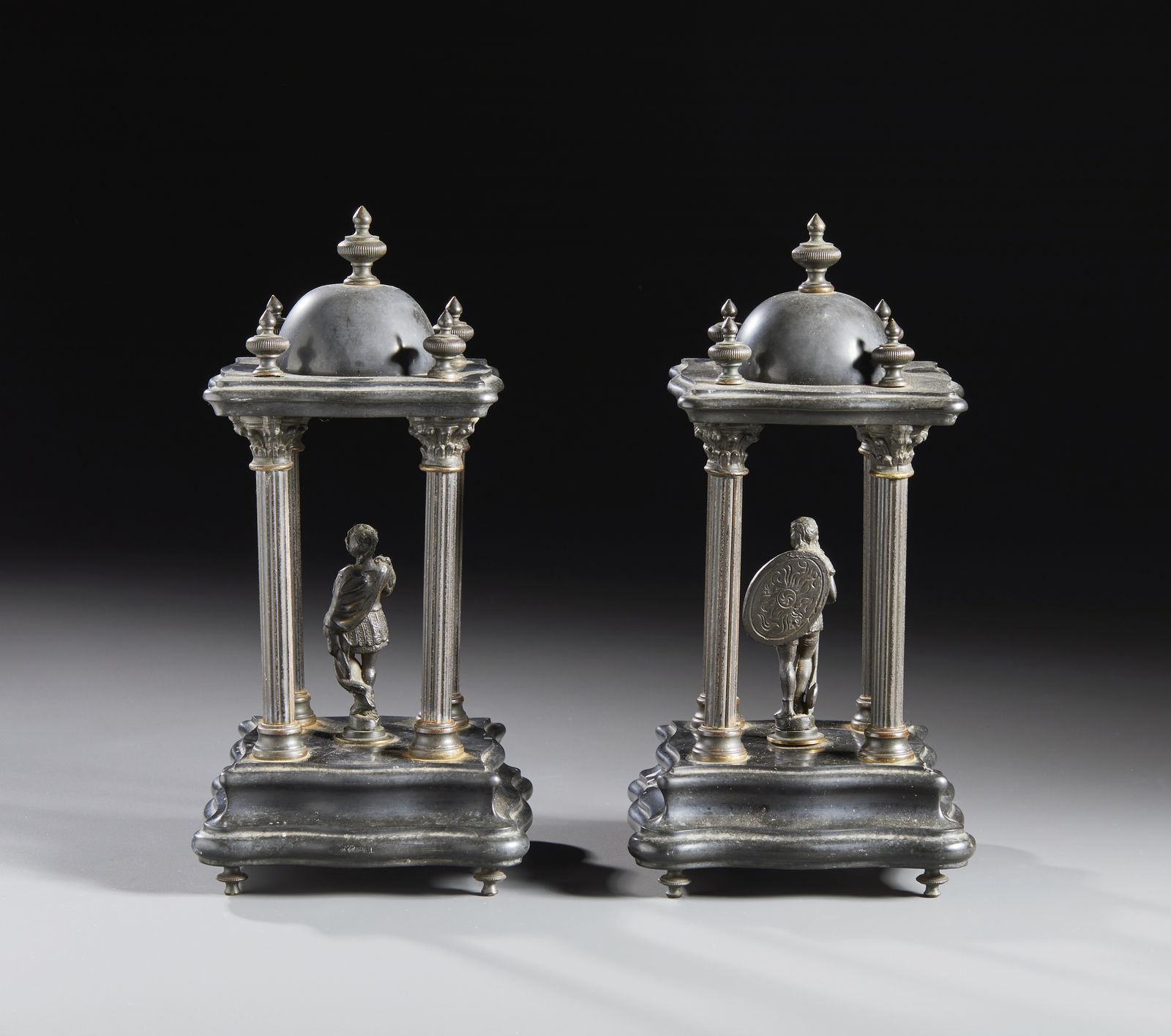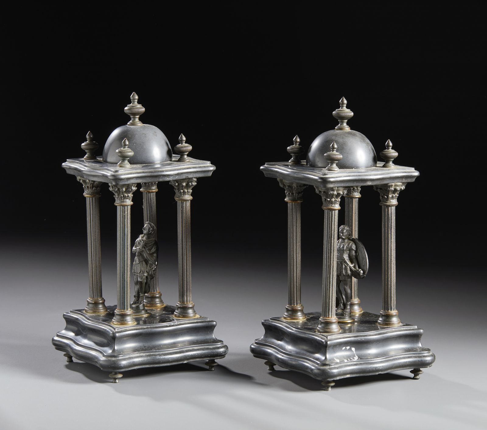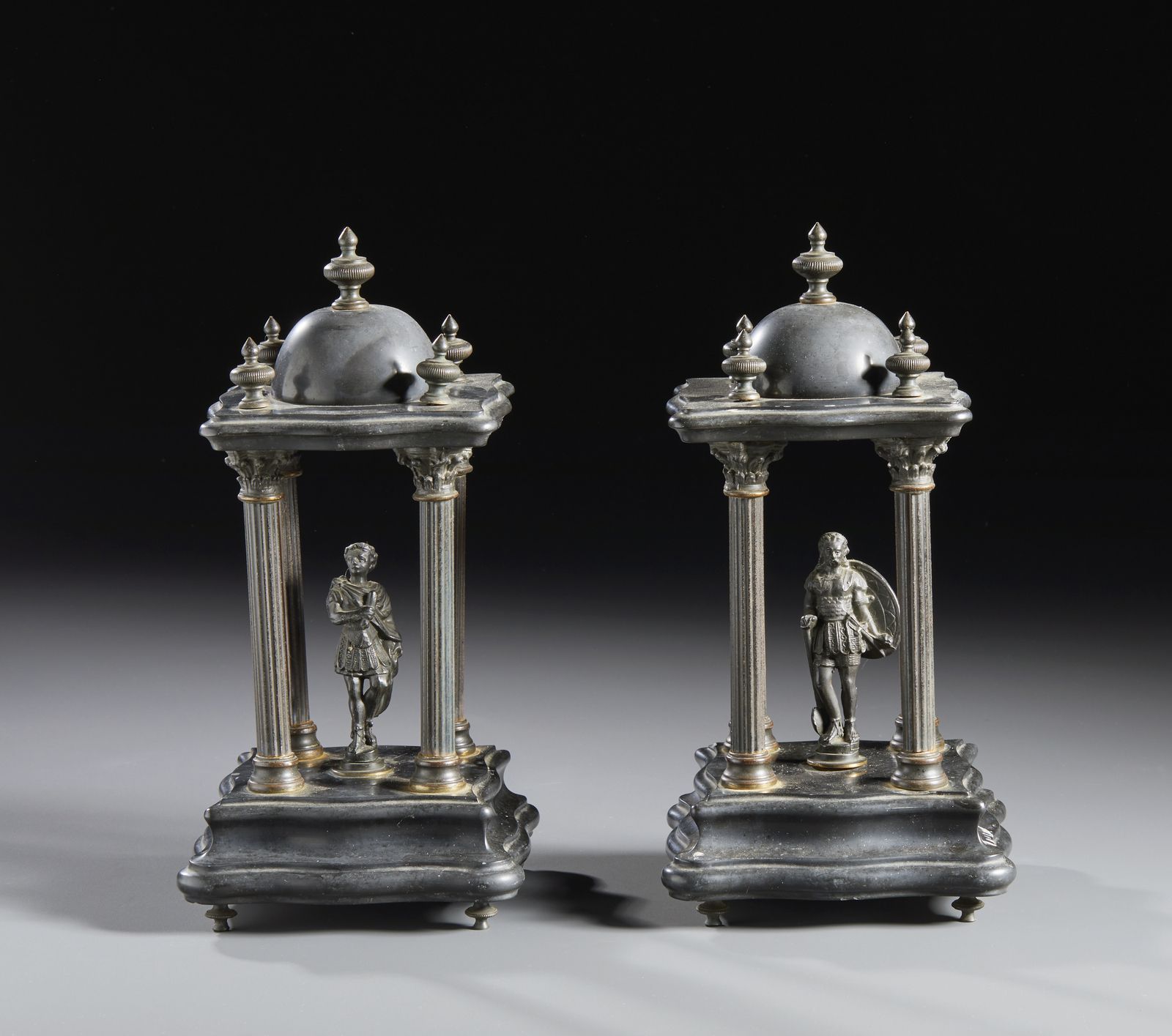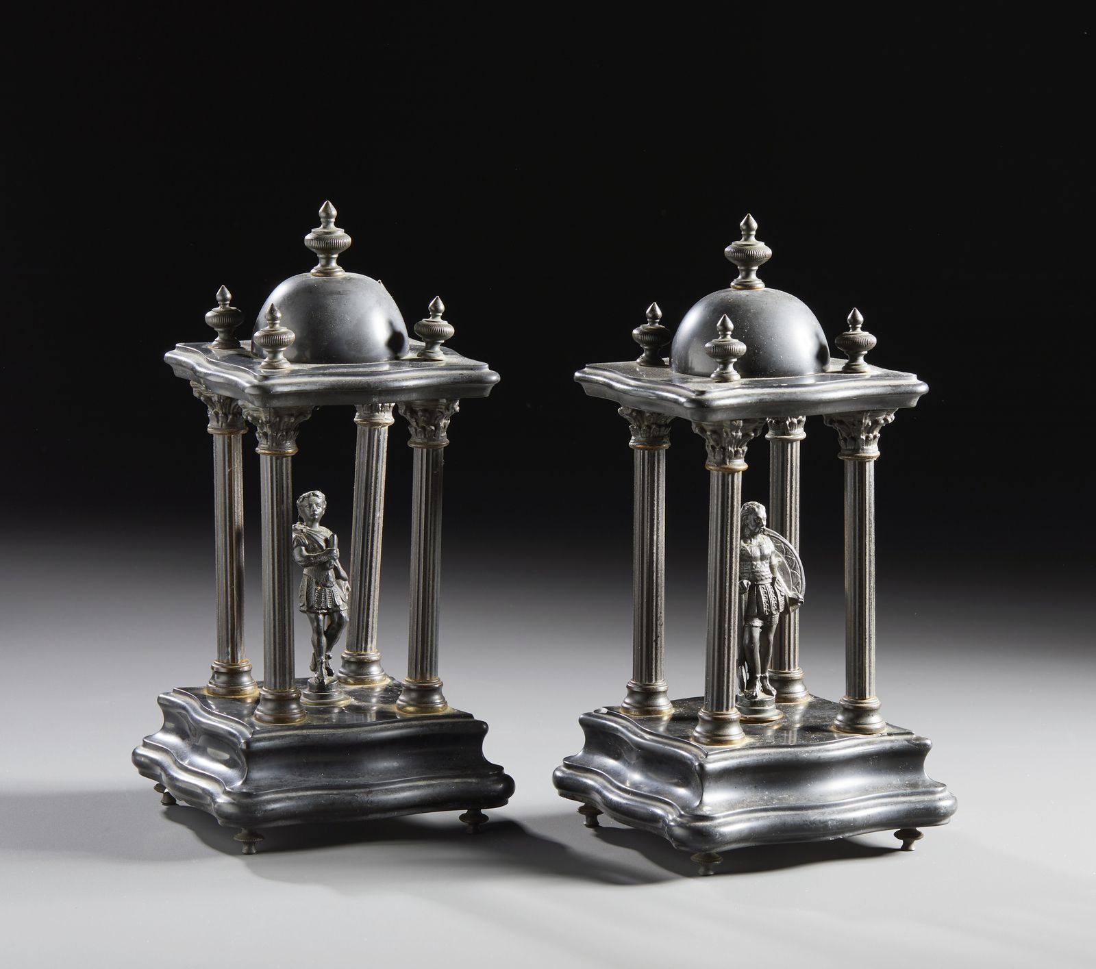 Coppia di edicole in bronzo e legno ebanizzato, struttura a quattro colonne corinzie [..]