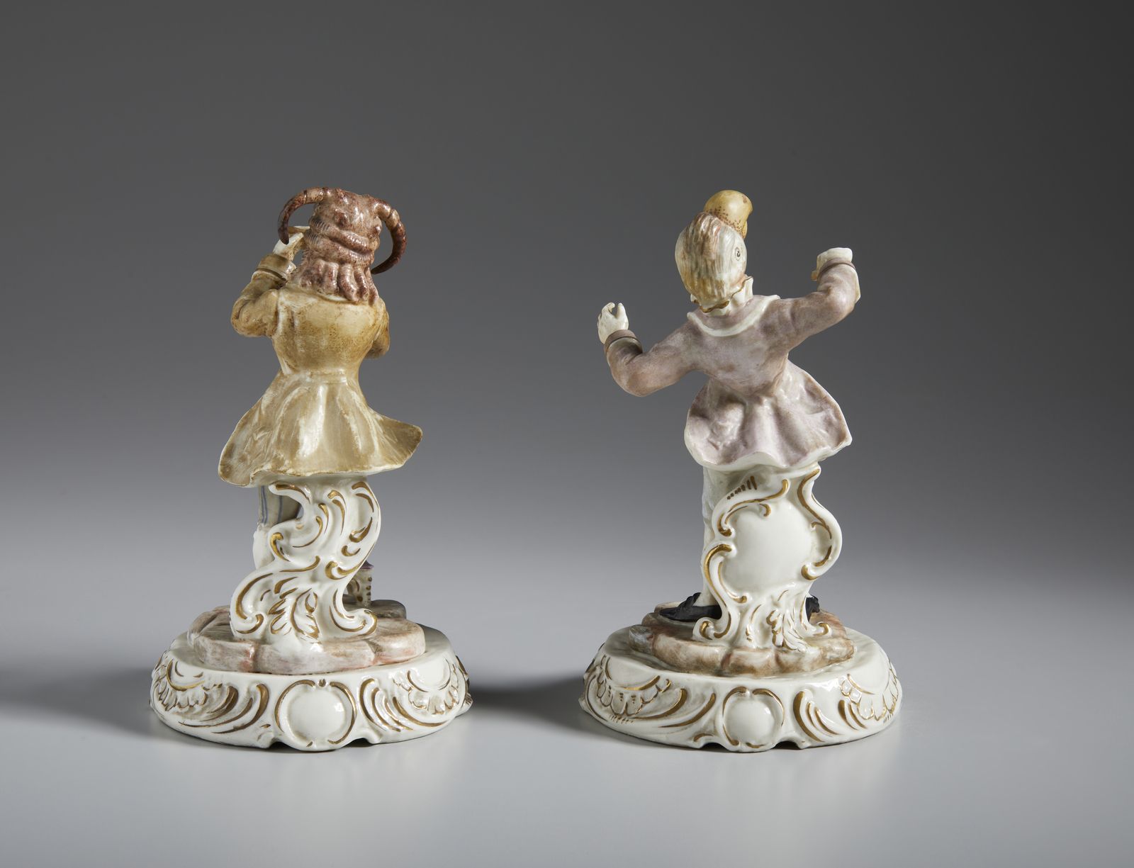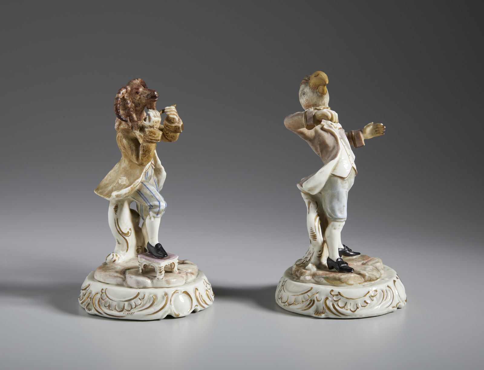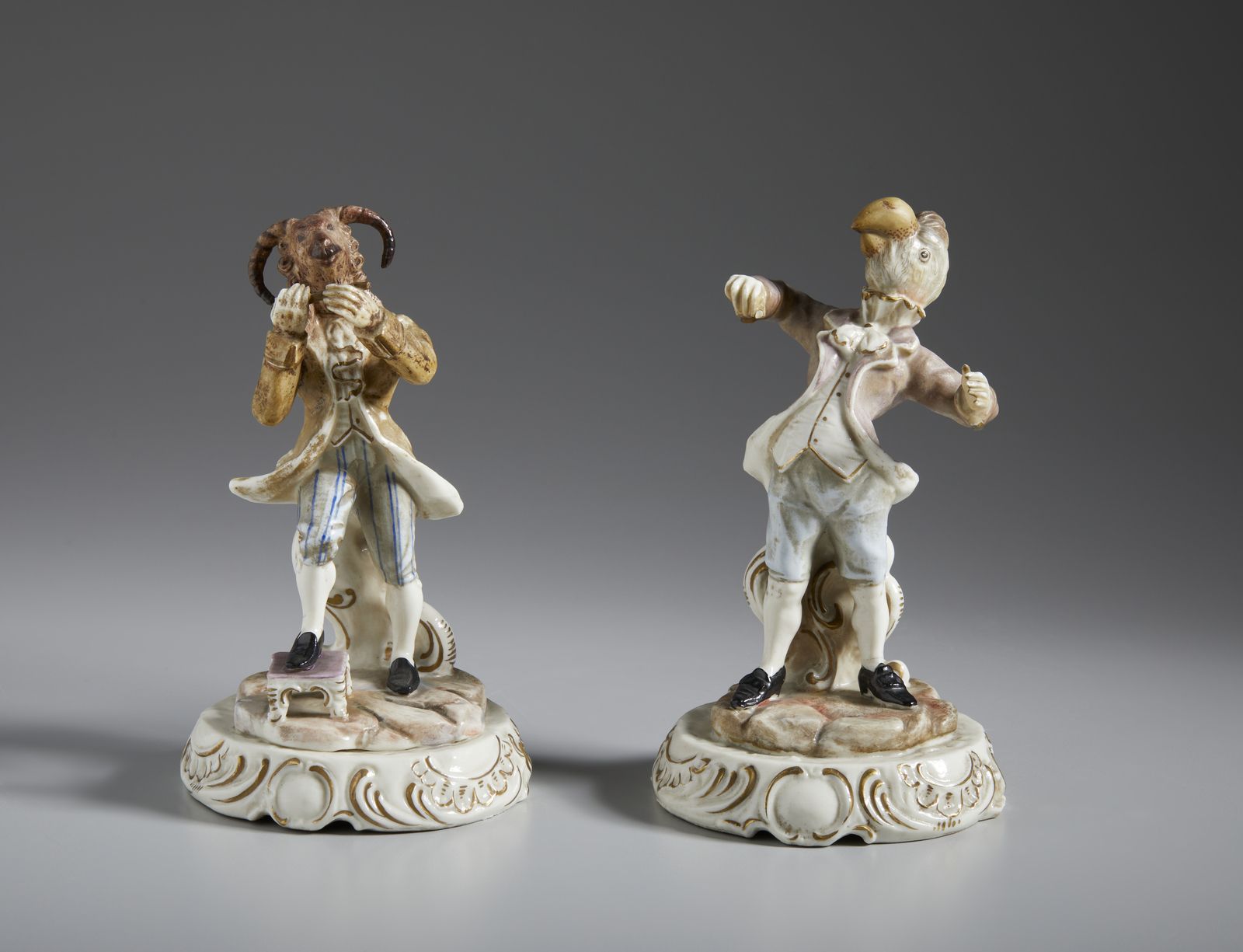 Coppia di figure di musicanti zoomorfi in porcellana policroma