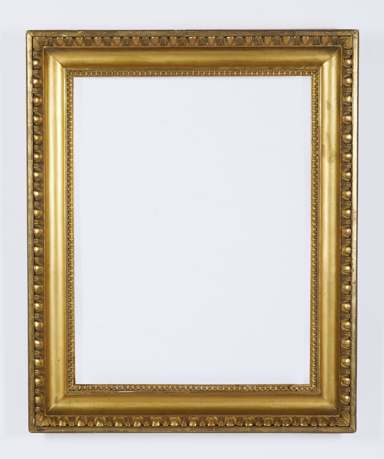Cornice neoclassica in legno intagliato e dorato con decorazione a ovuli