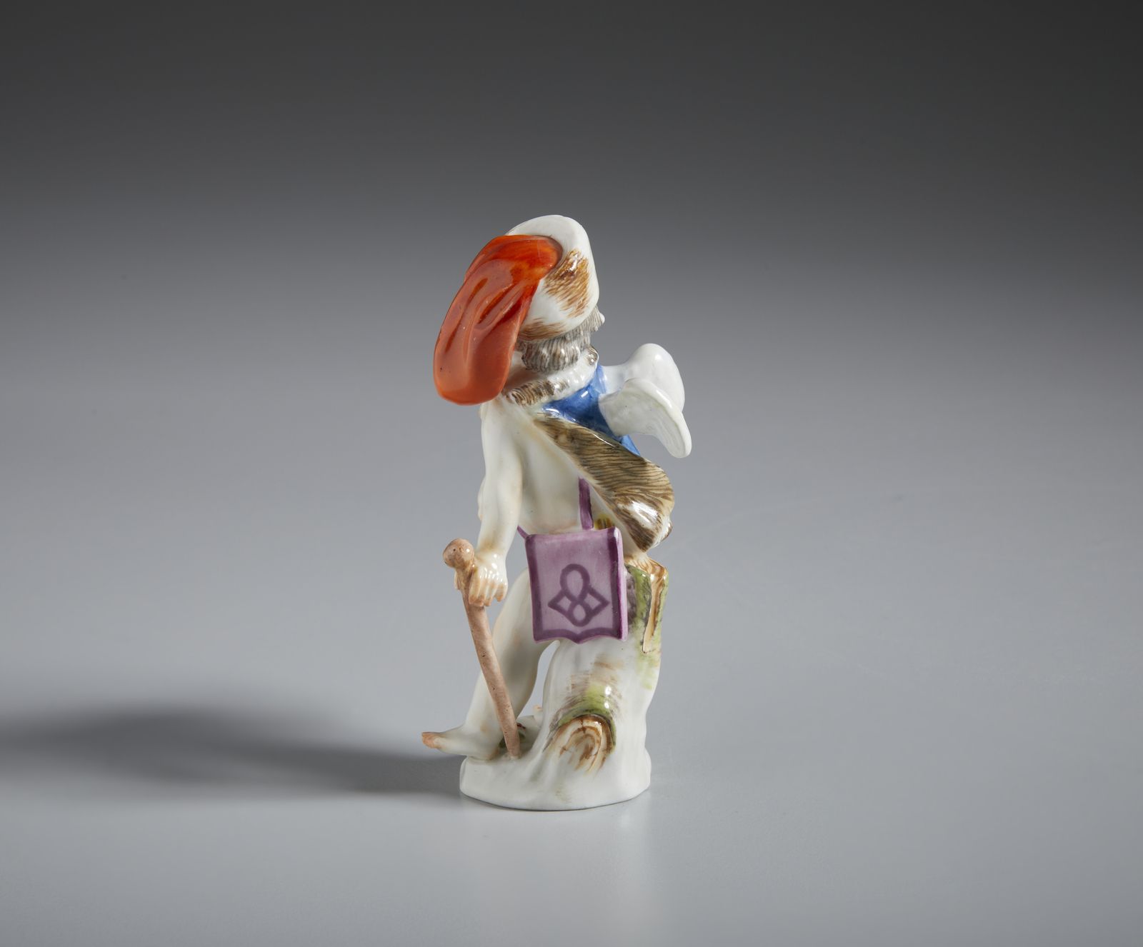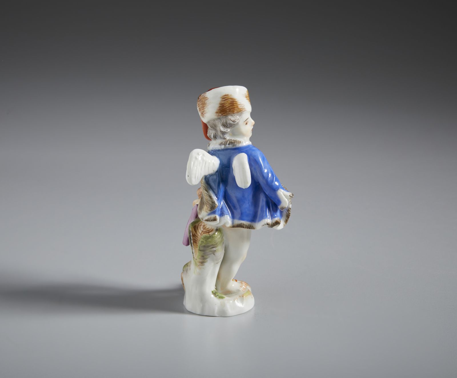 Cupido alato in porcellana policroma con cappello di pelliccia, mantello e basto [..]