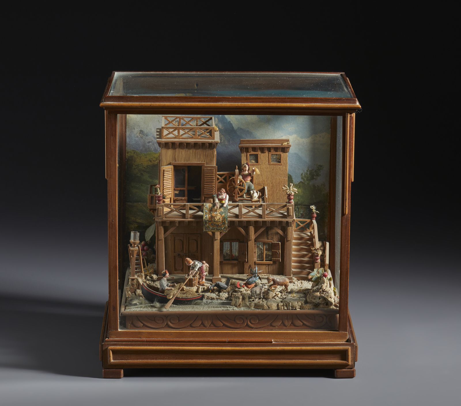 Diorama animato in teca di legno e vetro