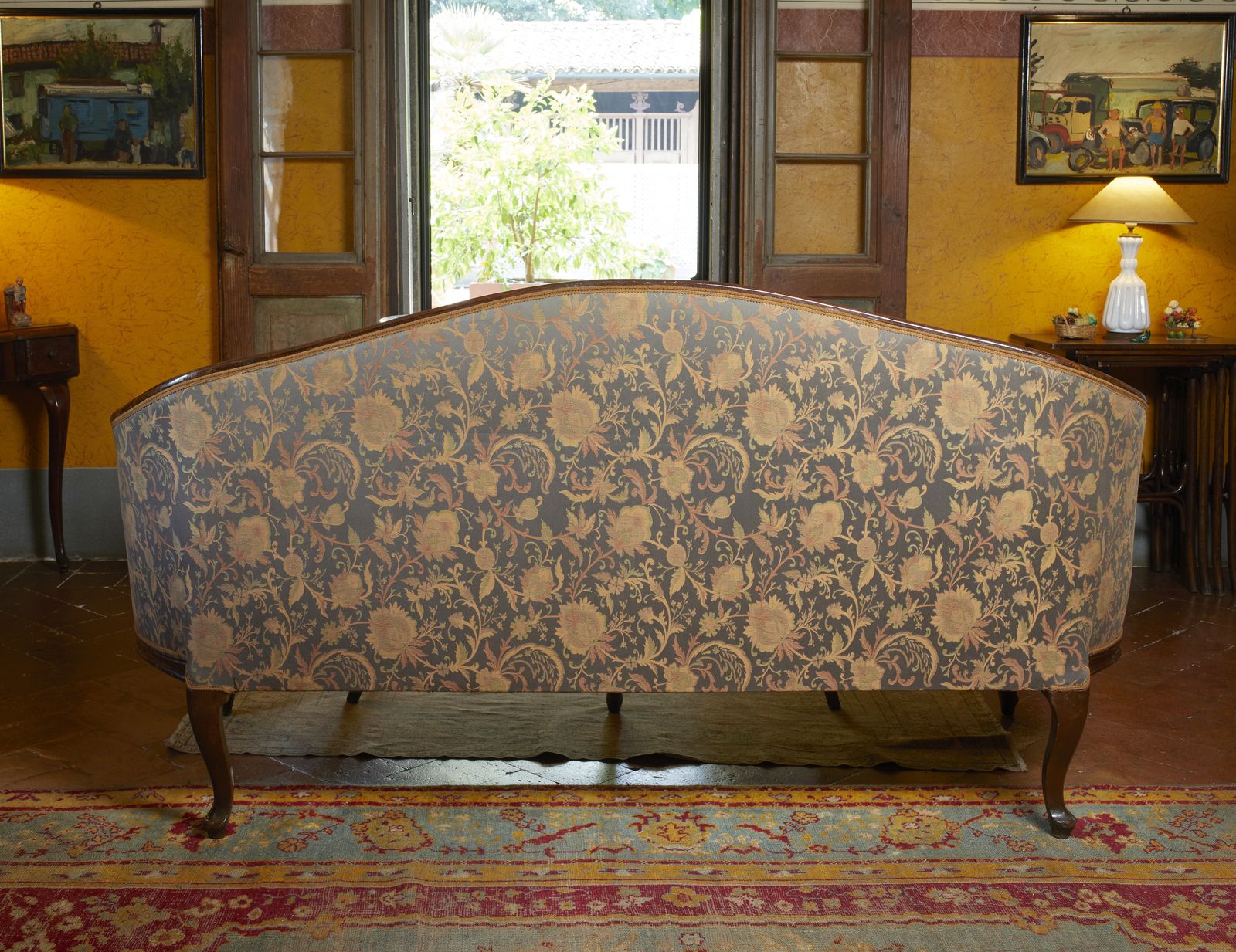 Divano 'a pozzetto' in legno di noce, seduta e schienale imbottiti in tessuto a [..]
