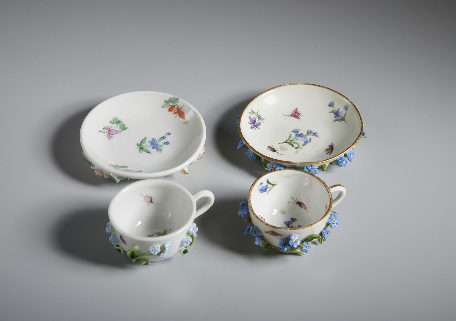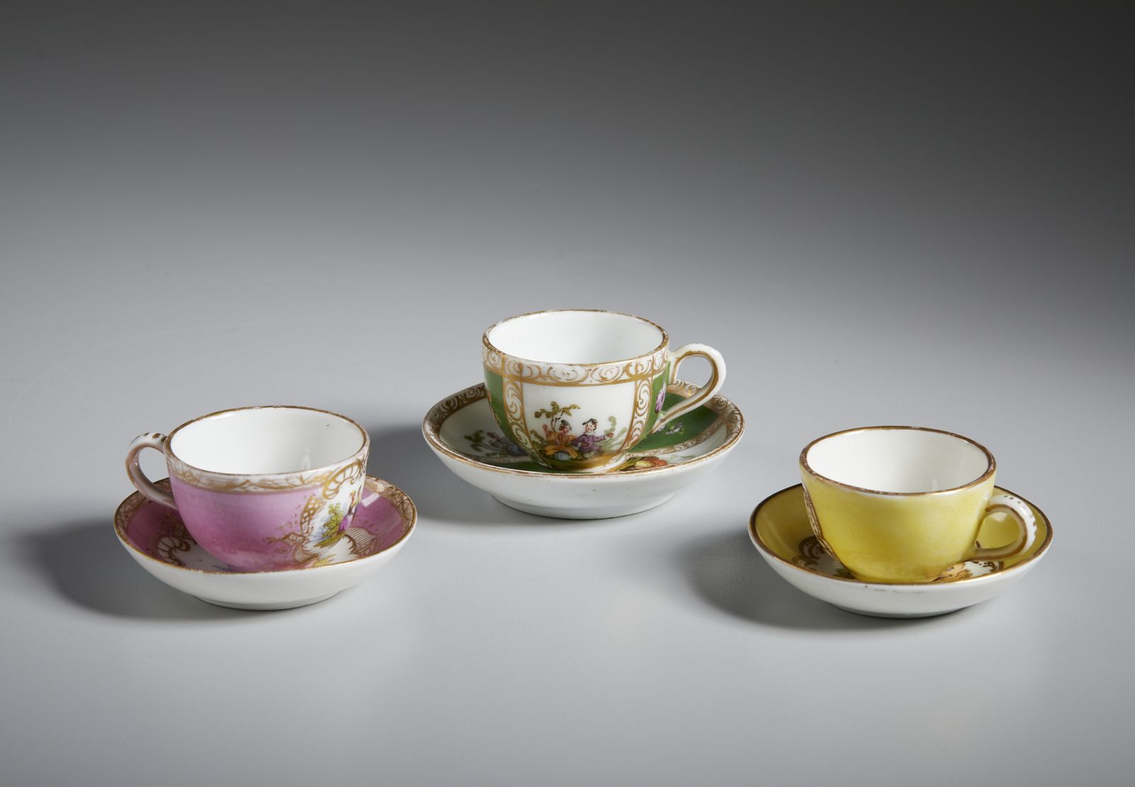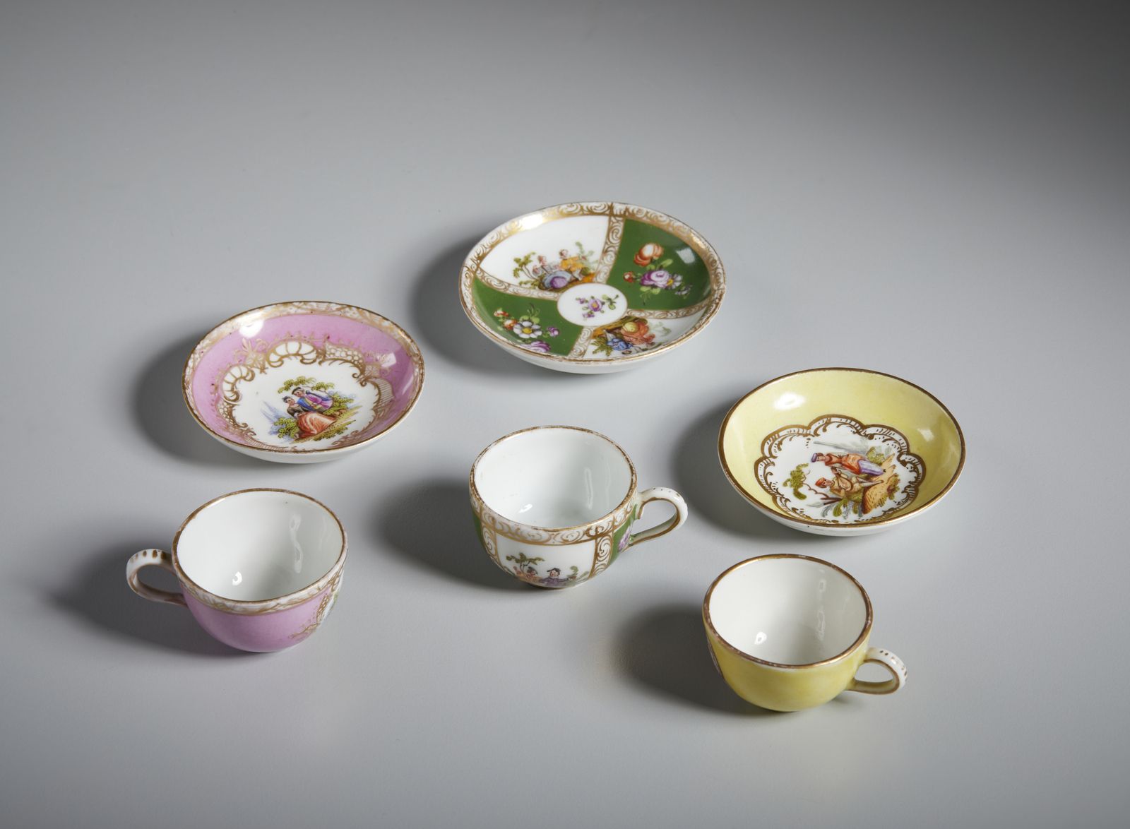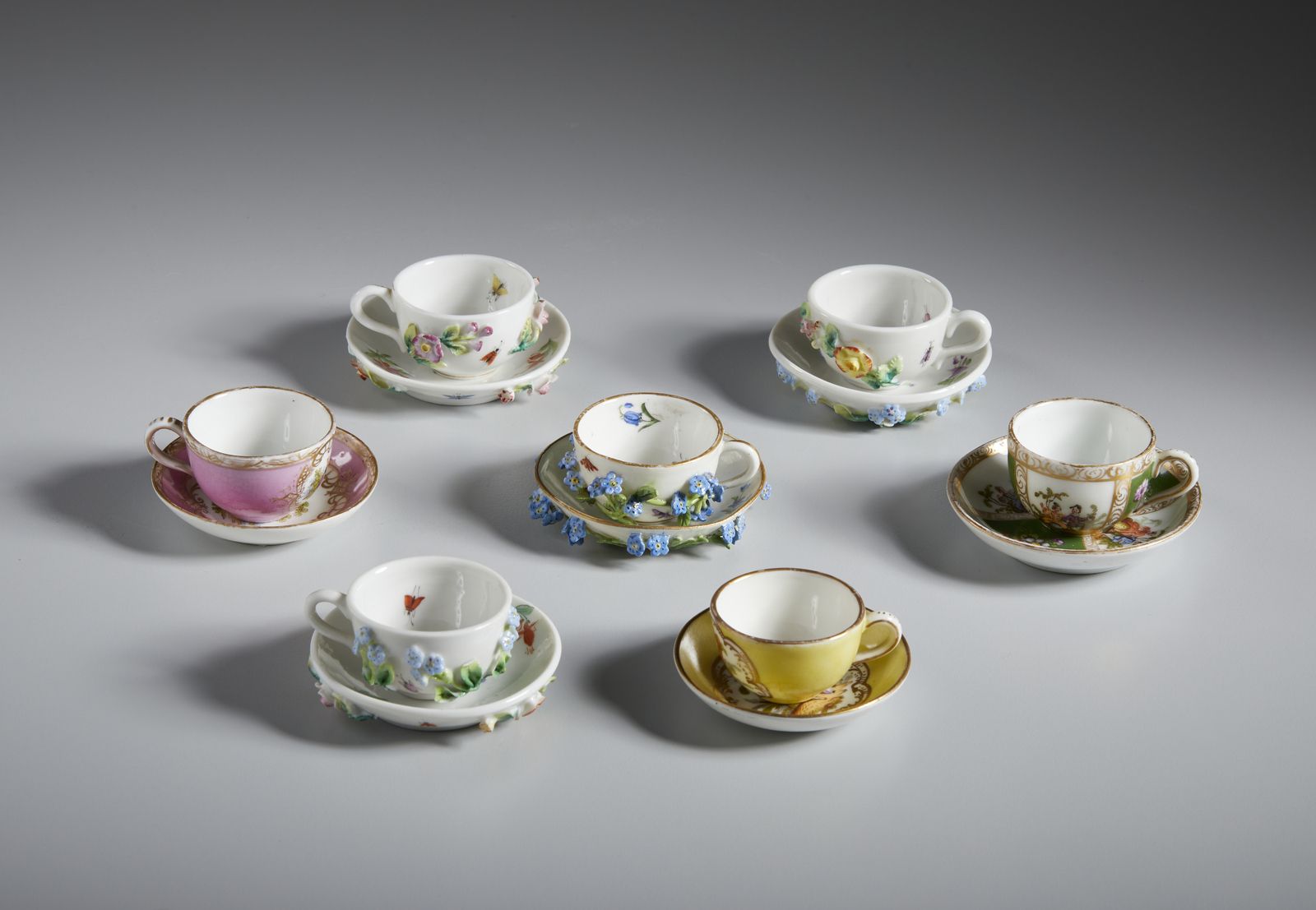 Gruppo di sette tazzine in porcellana in miniatura, varie manifatture