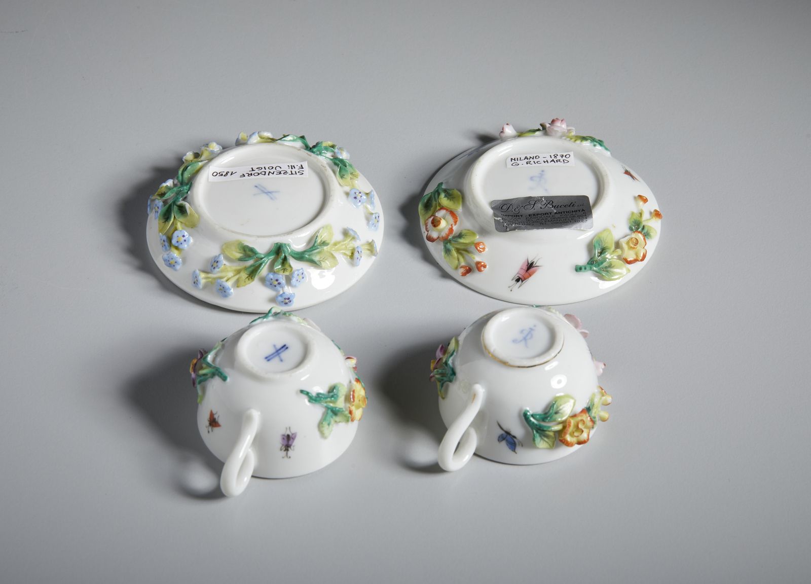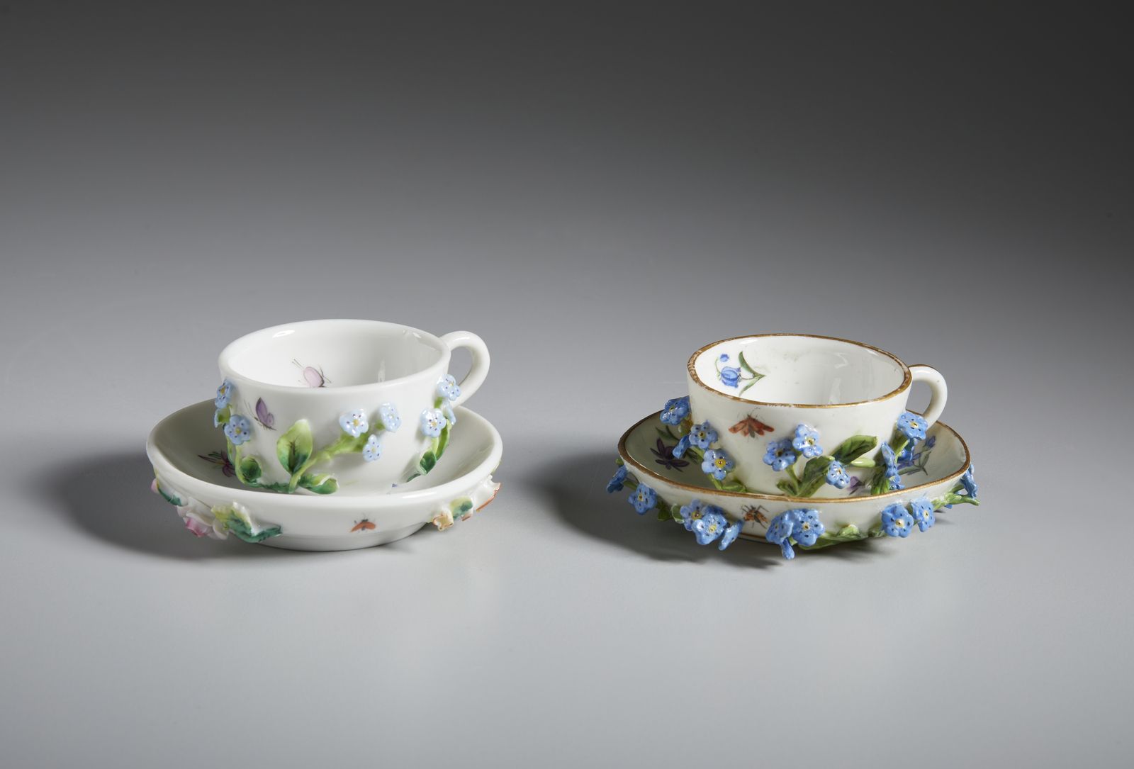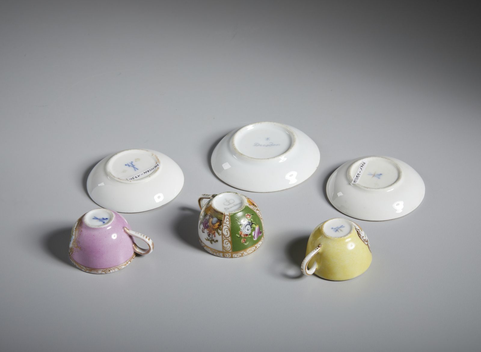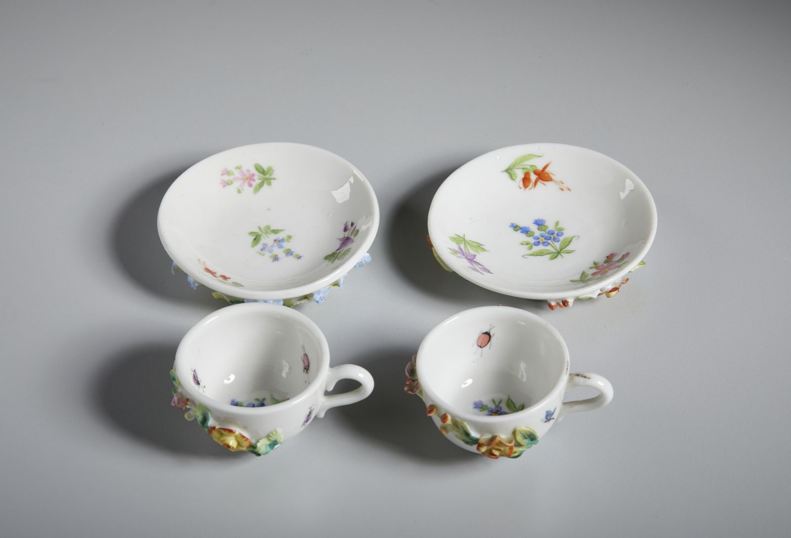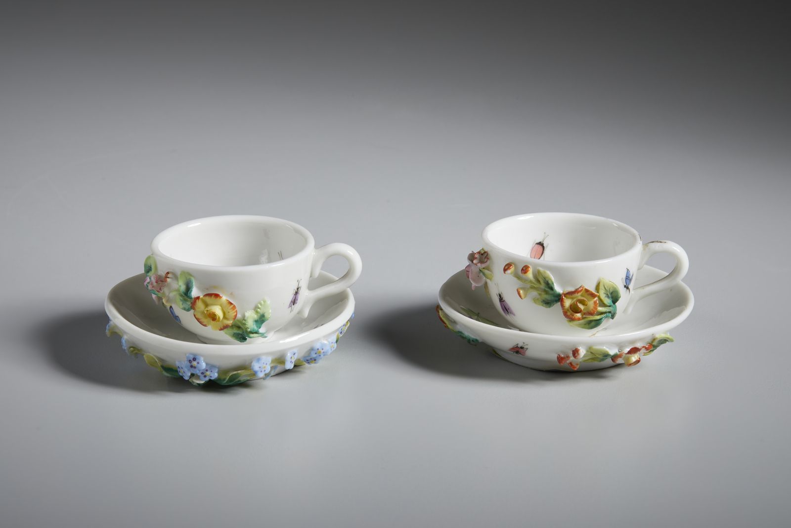 Gruppo di sette tazzine in porcellana in miniatura, varie manifatture
