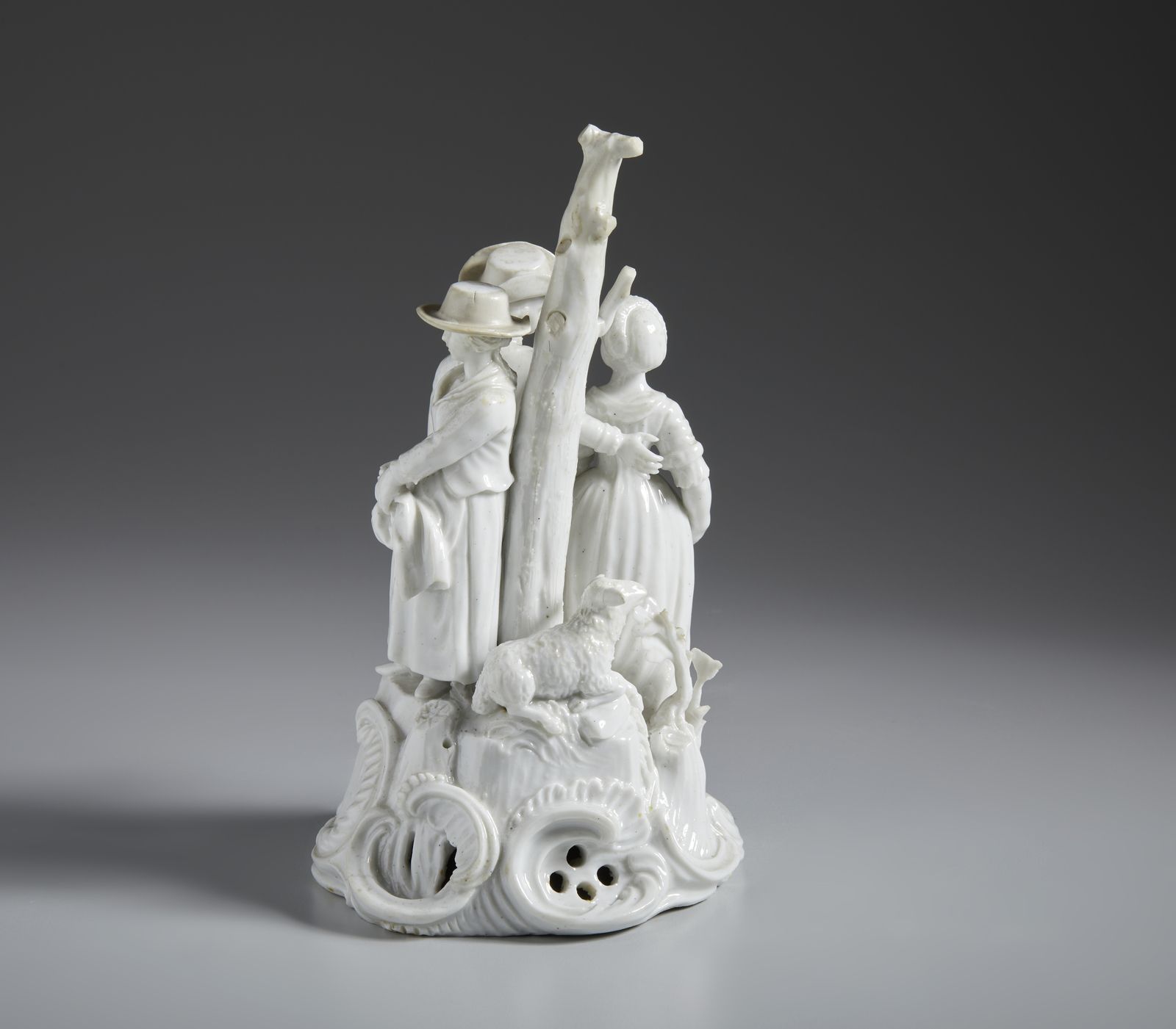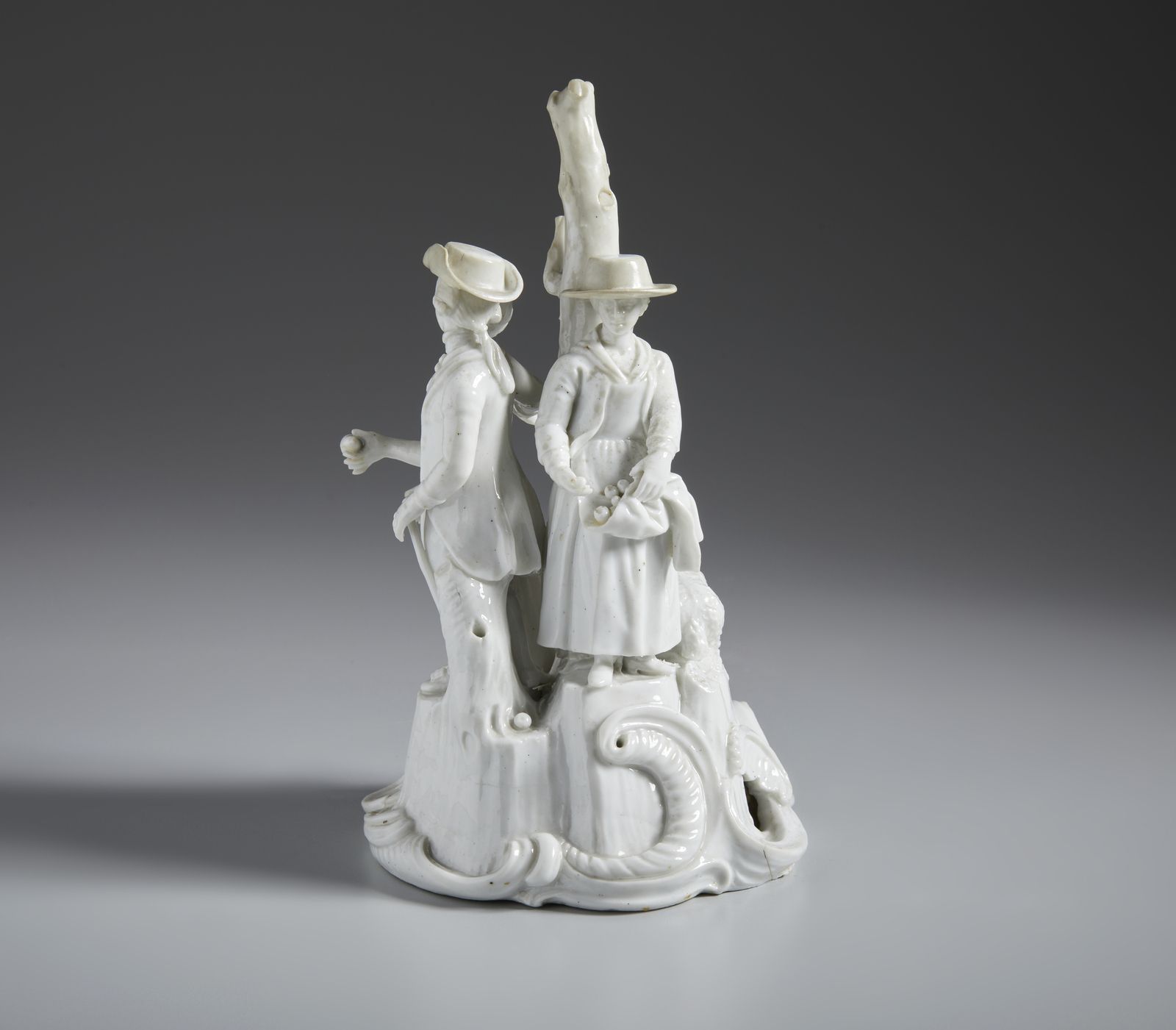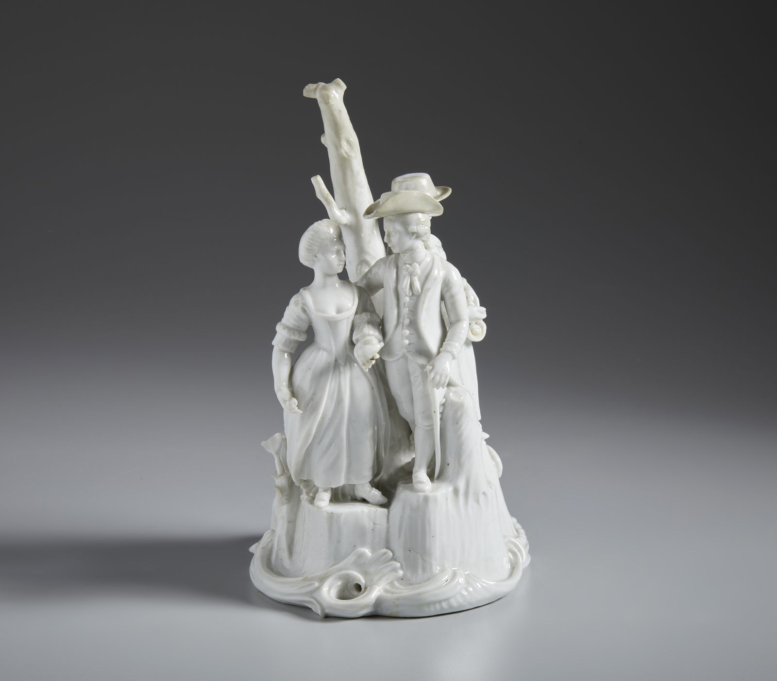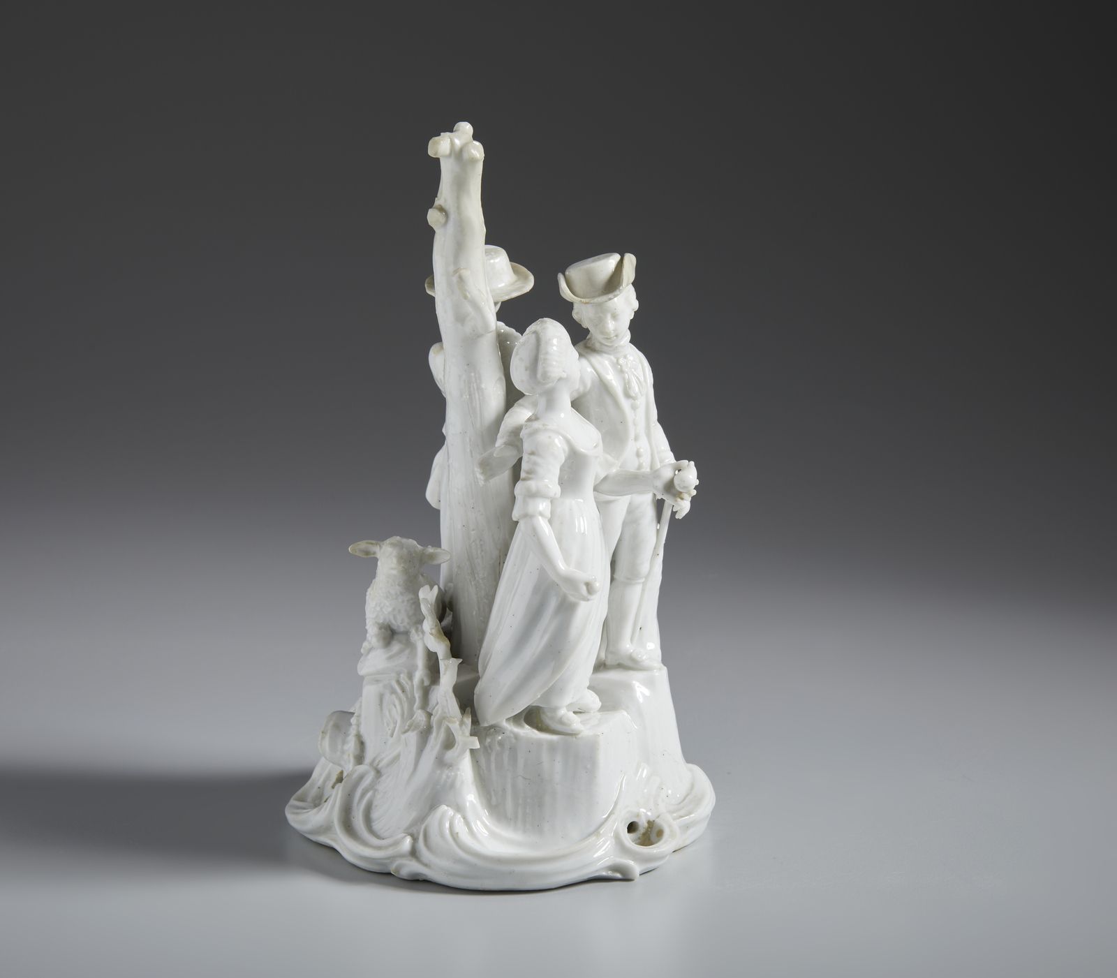 Gruppo in porcellana bianca raffigurante tre personaggi in un ambientazione agre [..]