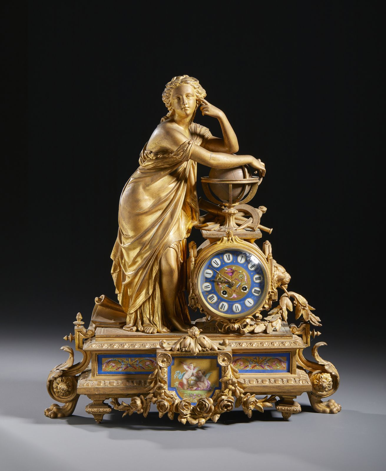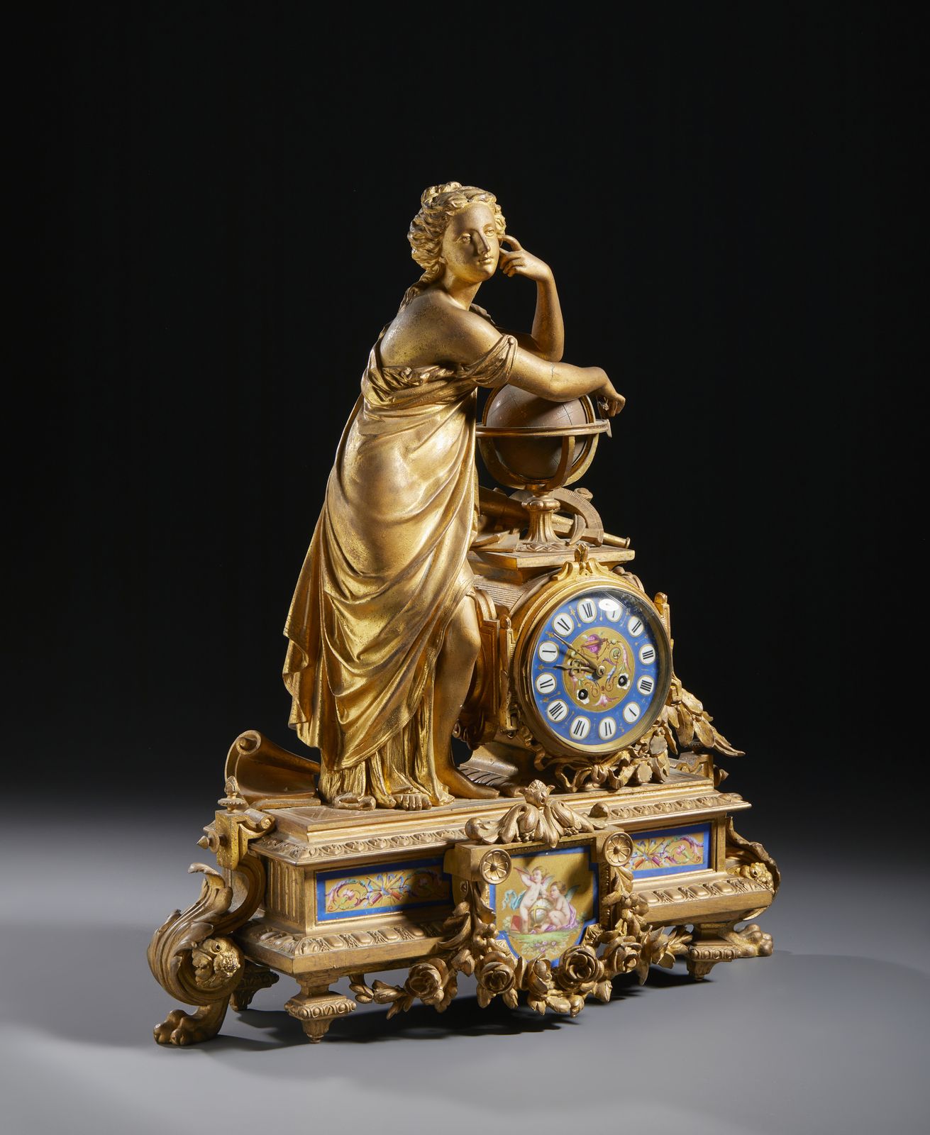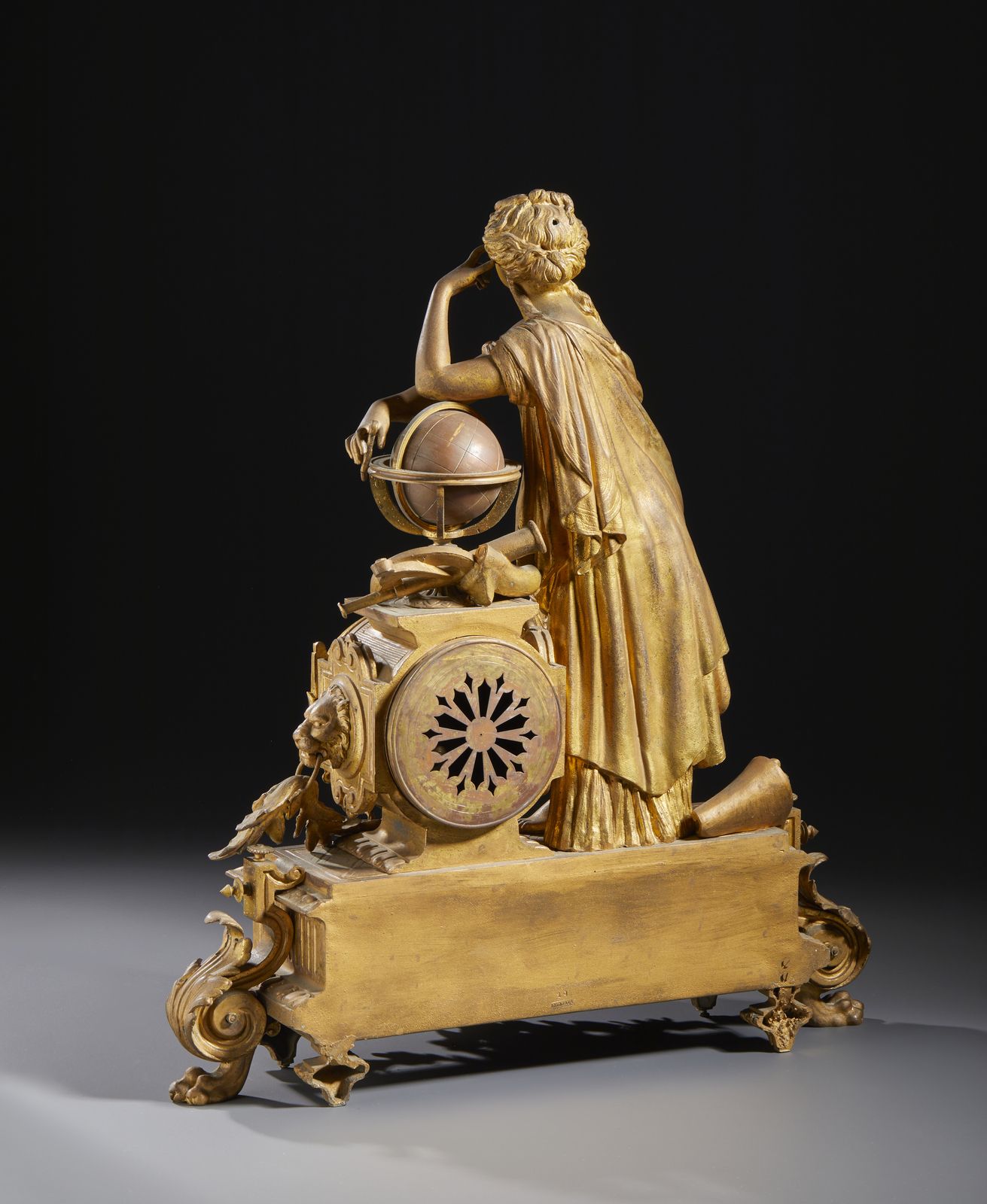Orologio da tavolo in metallo dorato con allegoria dell'Astronomia, quadrante e [..]