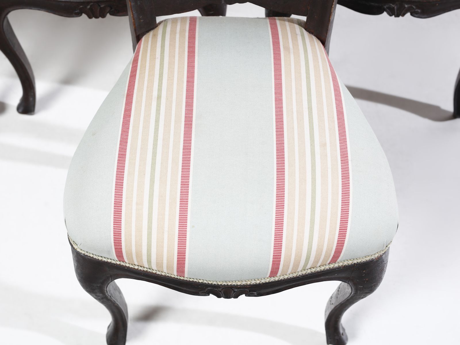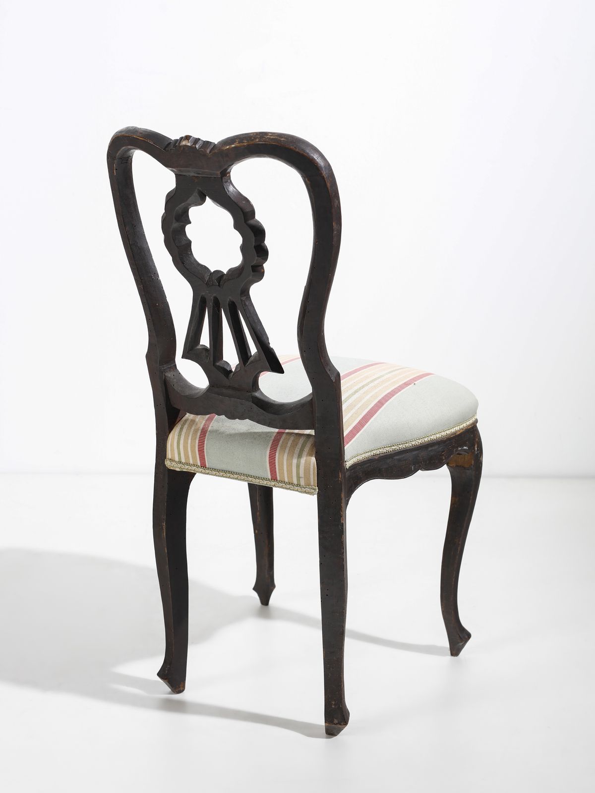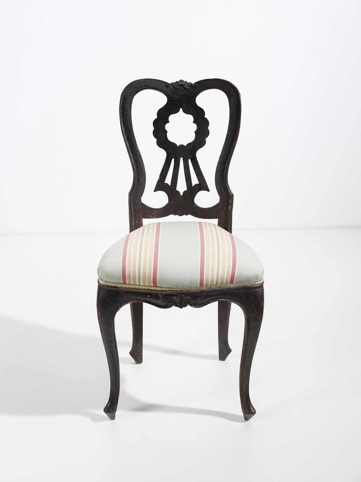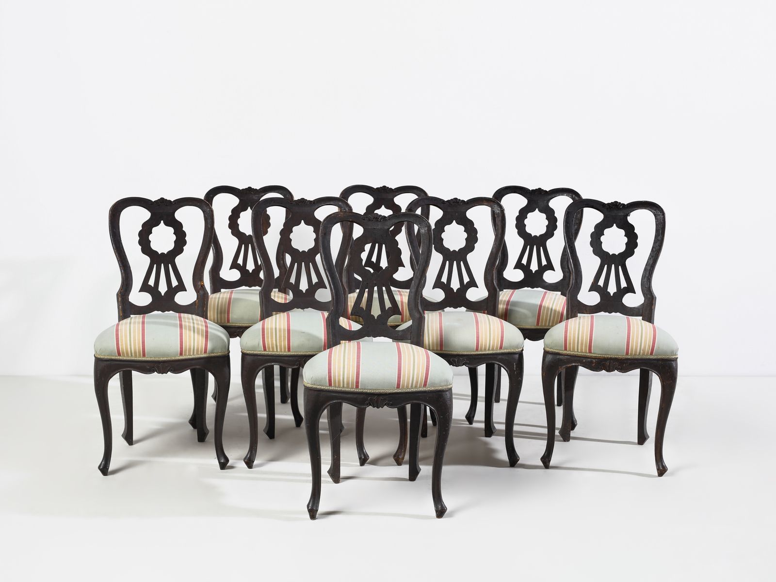 Otto sedie in legno intagliato, schienale a giorno, seduta imbottita e gambe arc [..]