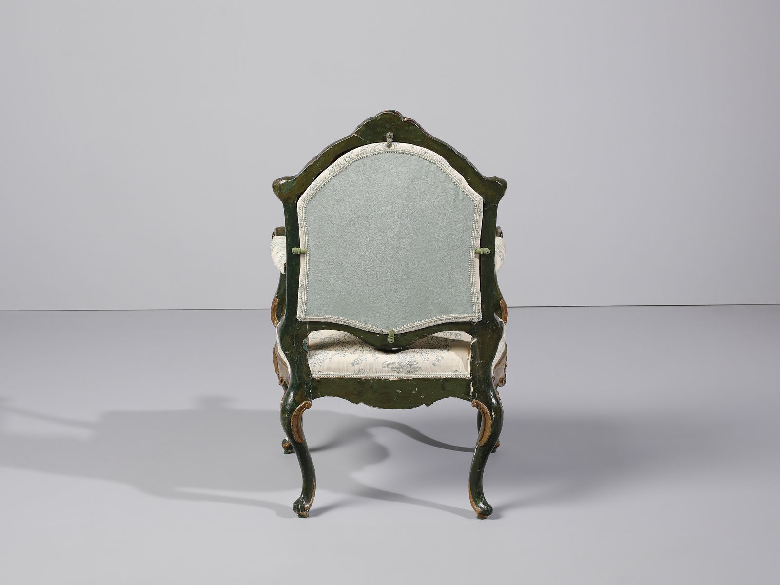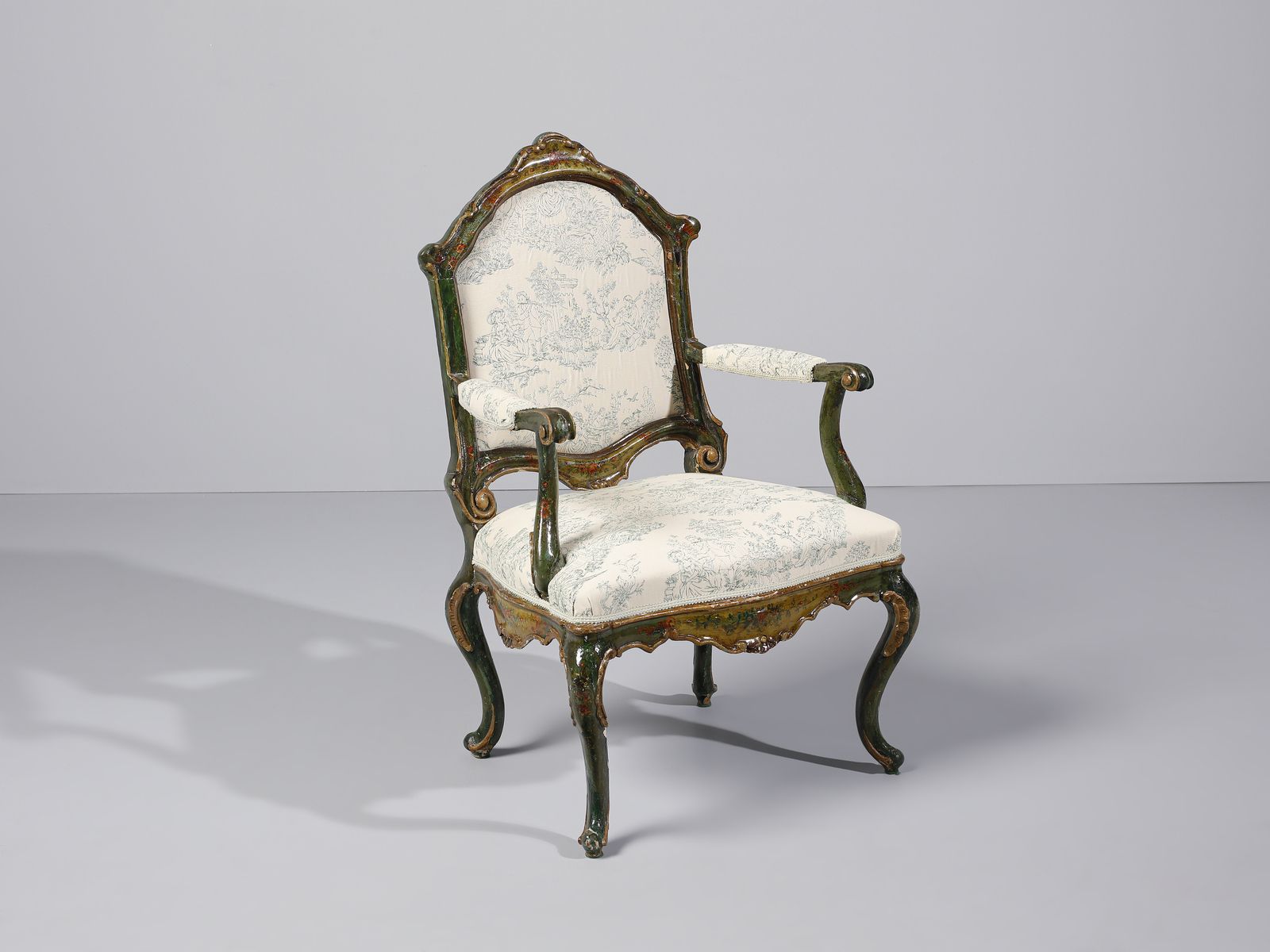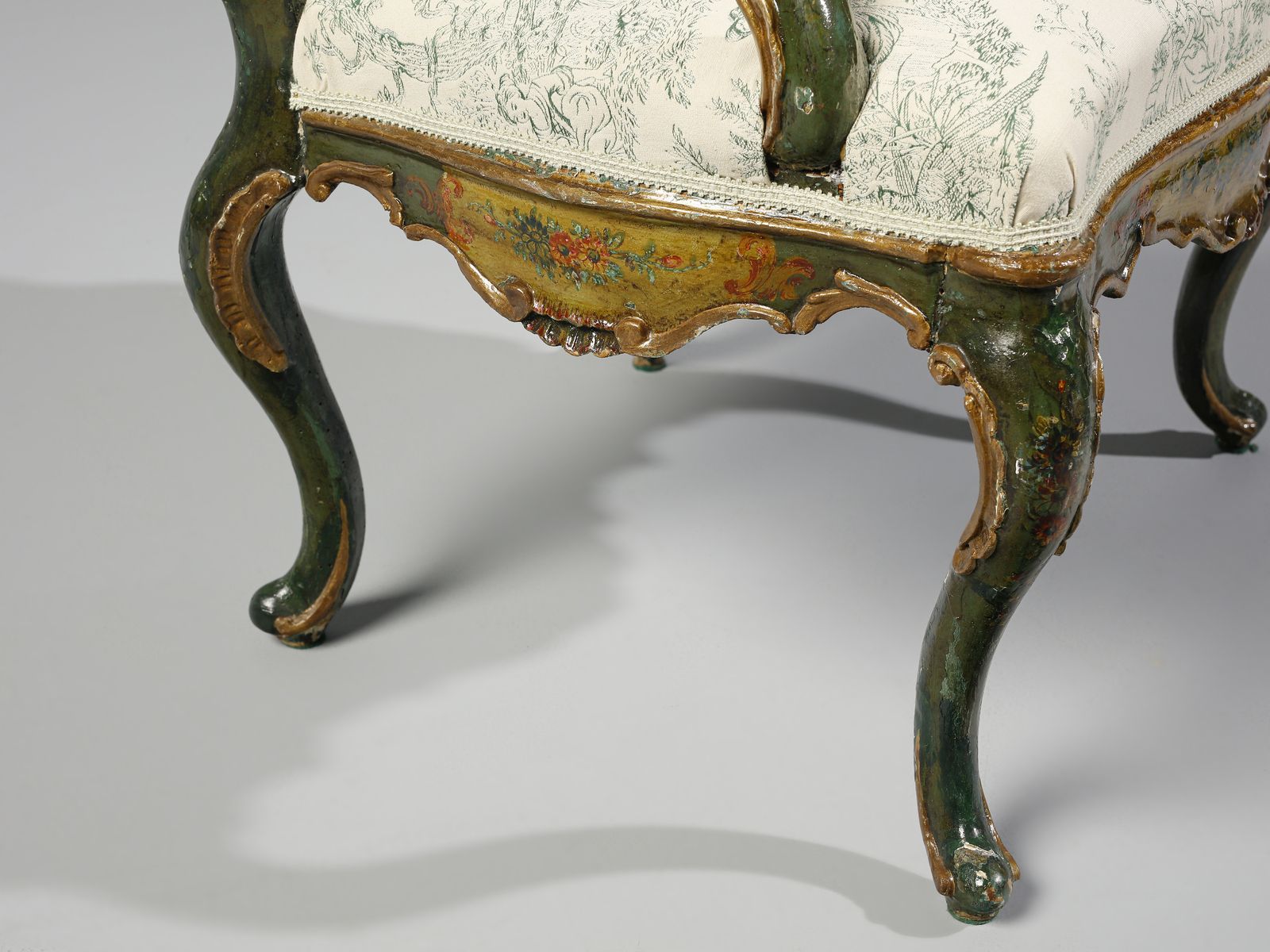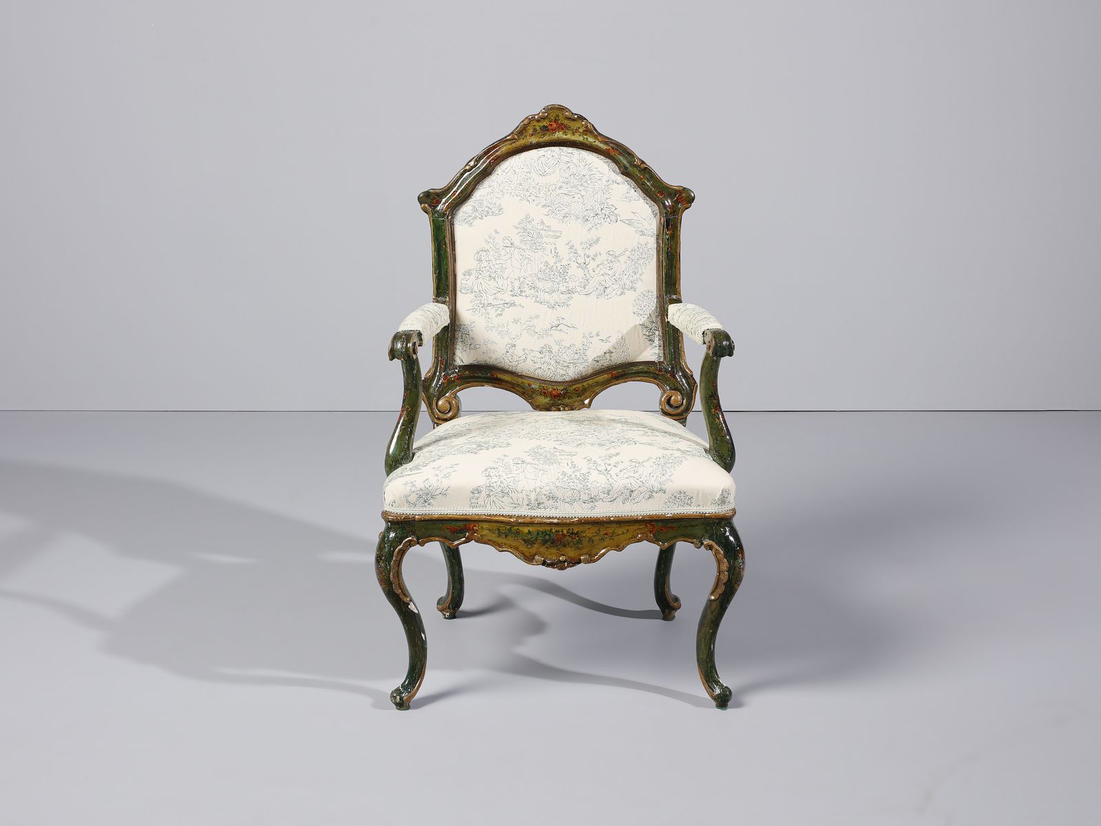 Poltrona in legno laccato e decorato a motivi floreali policromi su fondo verde [..]