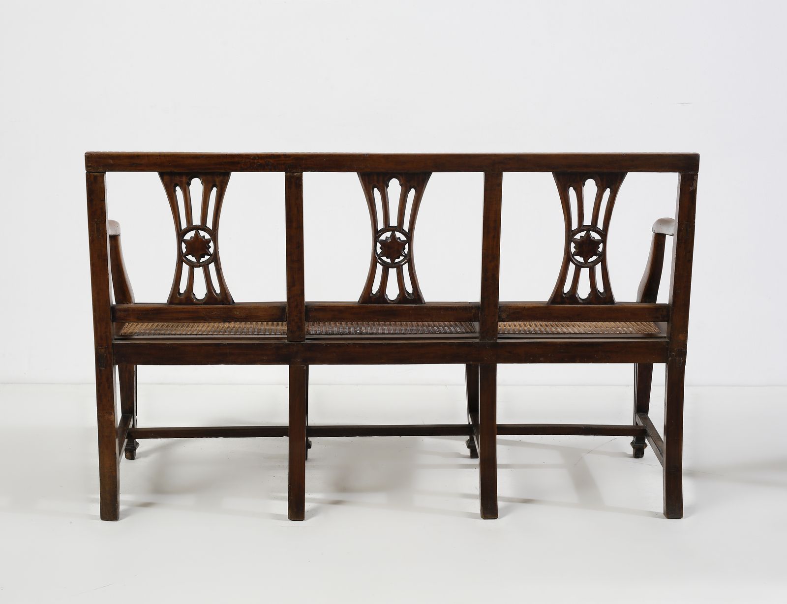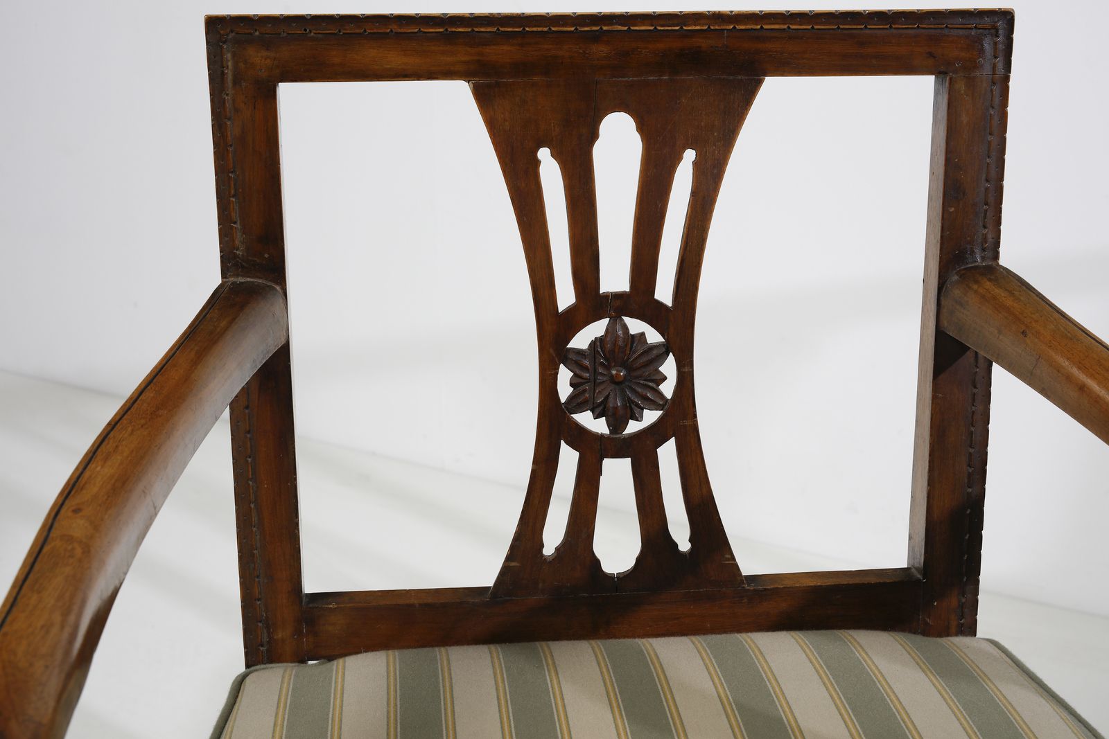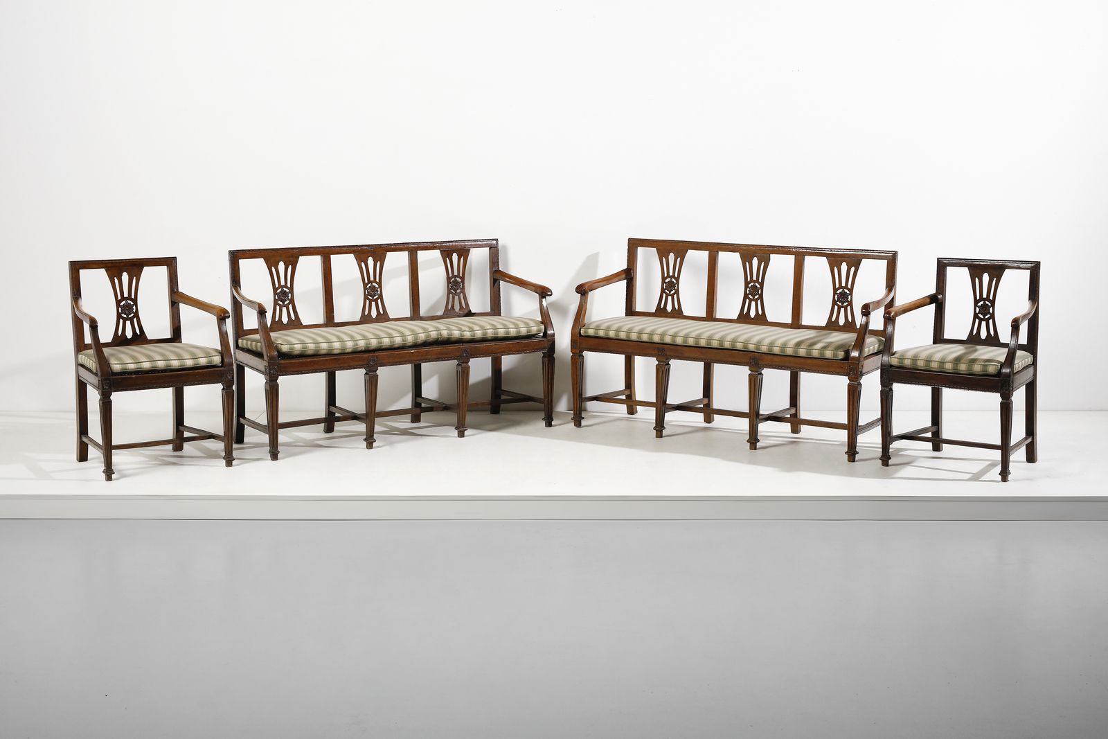 Salotto composto da due divanetti e coppia di poltrone in noce, schienali a giorno, [..]