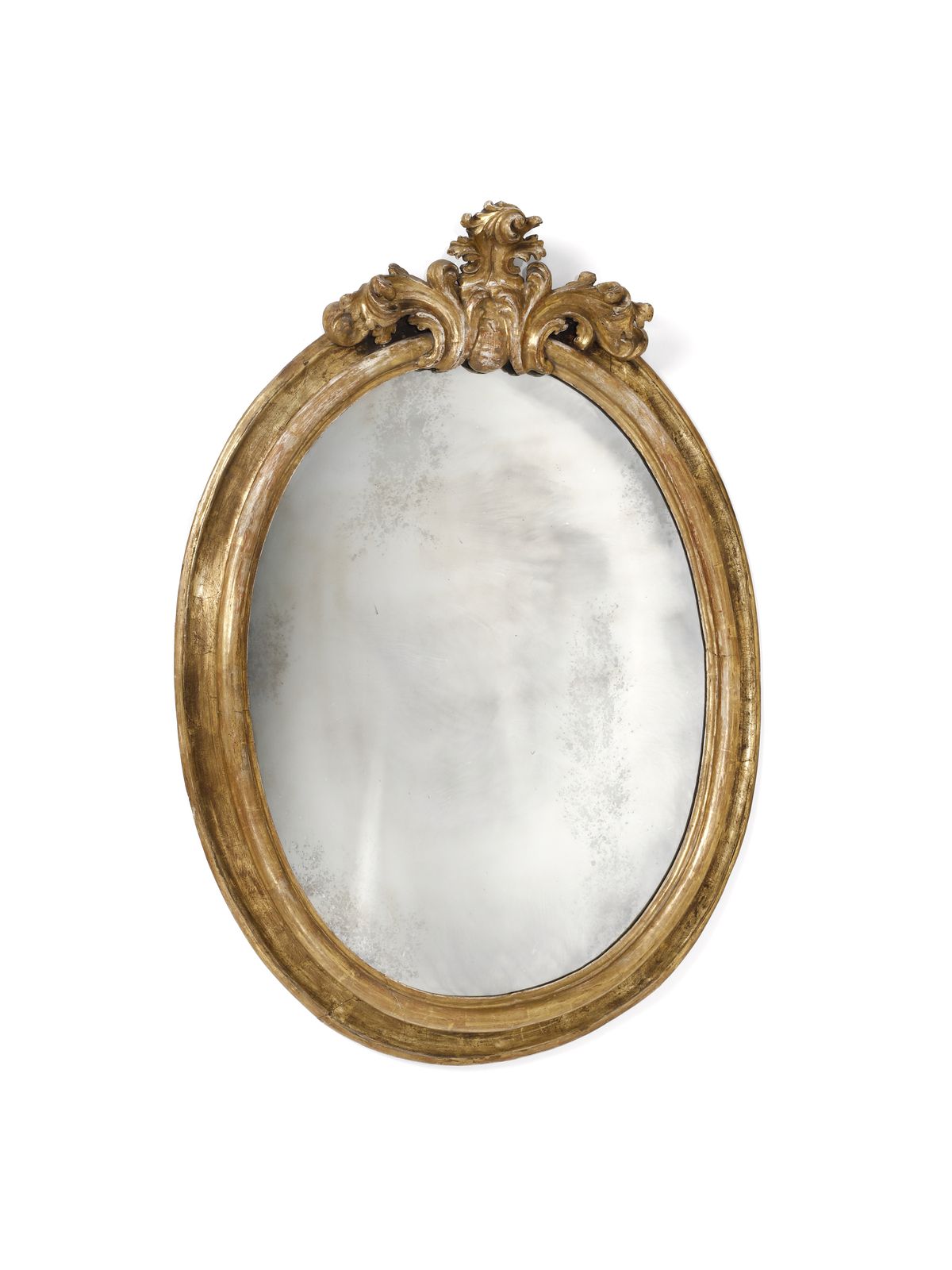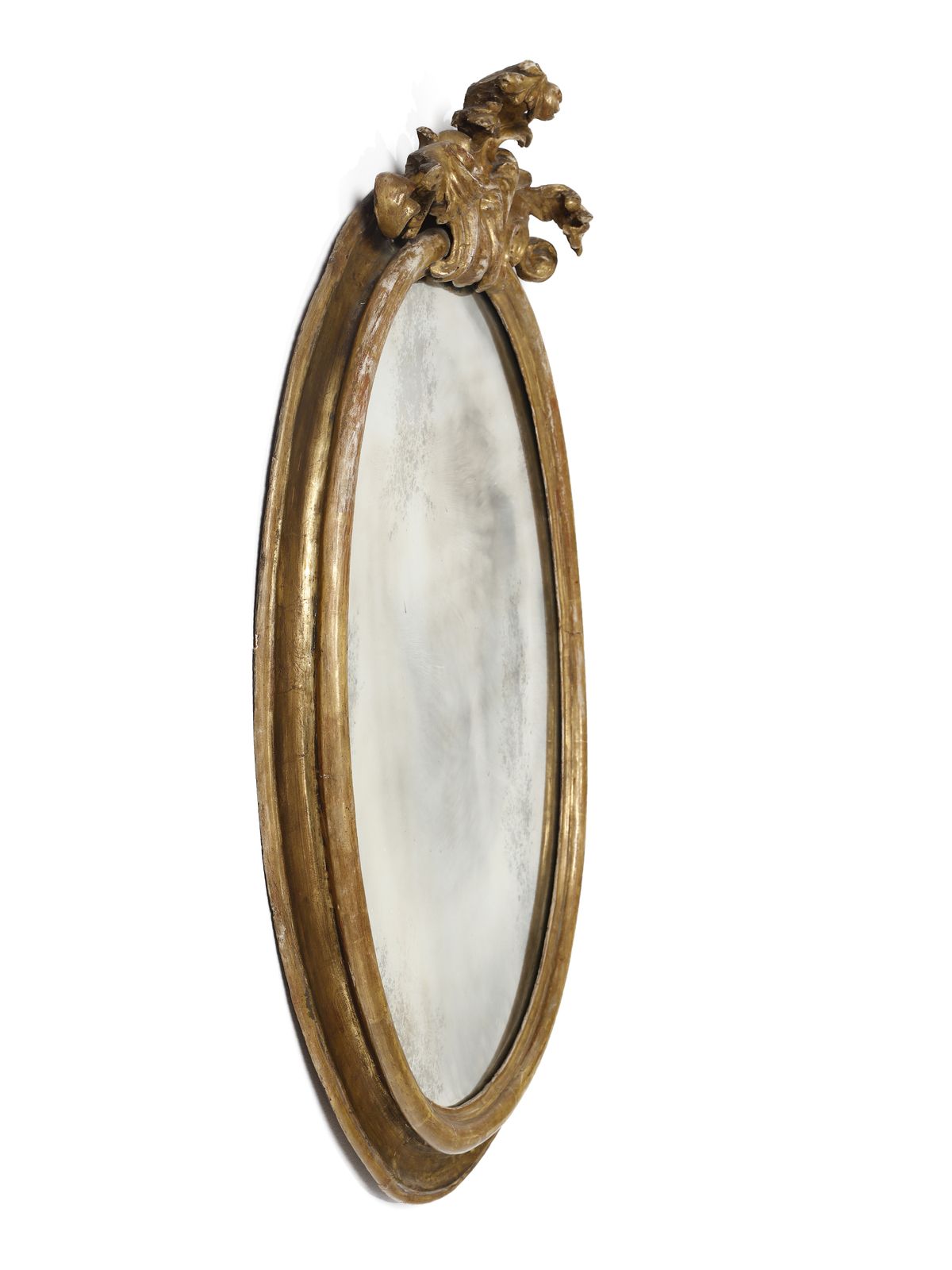 Specchiera di forma ovale in legno intagliato e dorato con cimasa a decoro fitom [..]