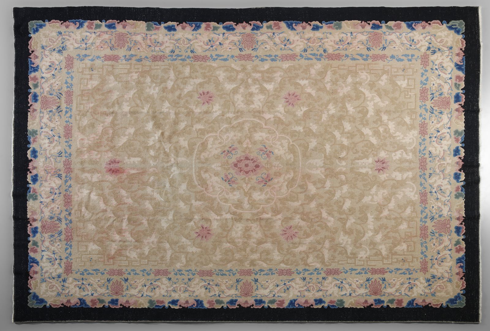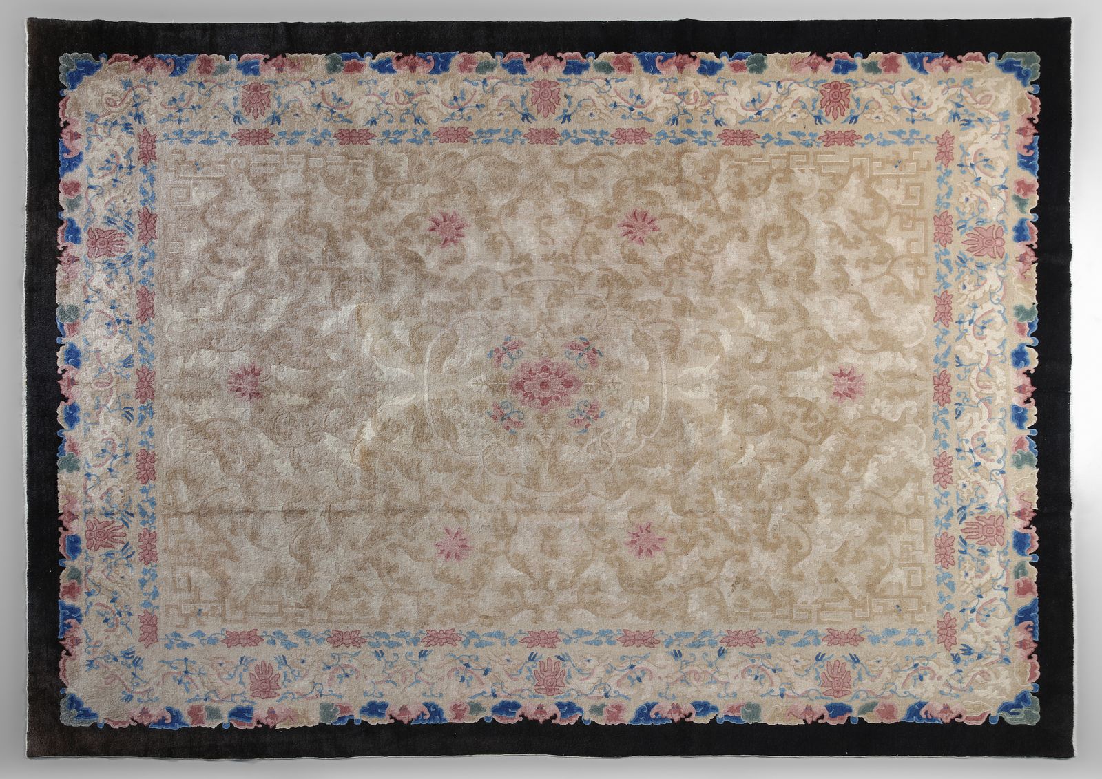 Tappeto con ordito in cotone, trama e vello in lana, con bordura principale a draghi, [..]
