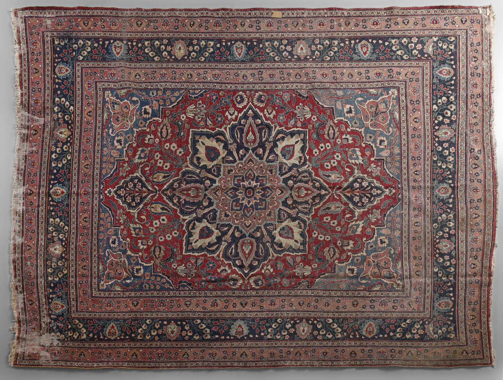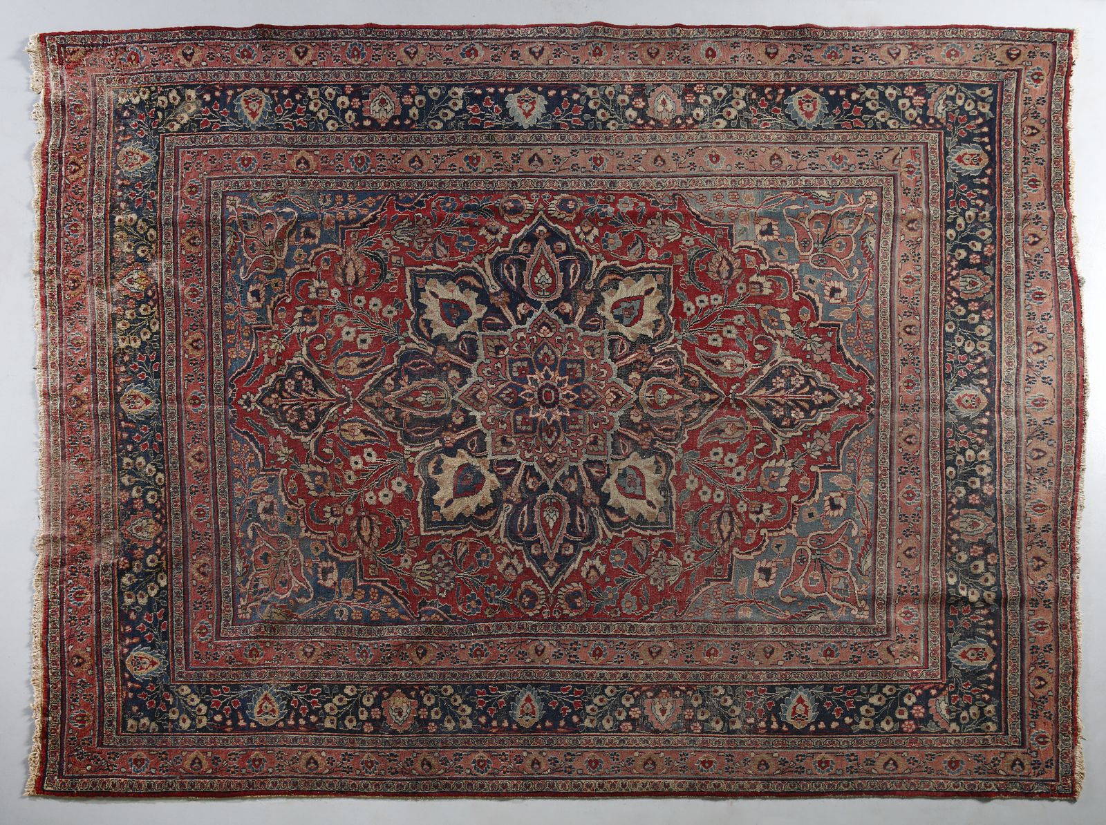 Tappeto fondo blu/rosso con decoro floreale stilizzato