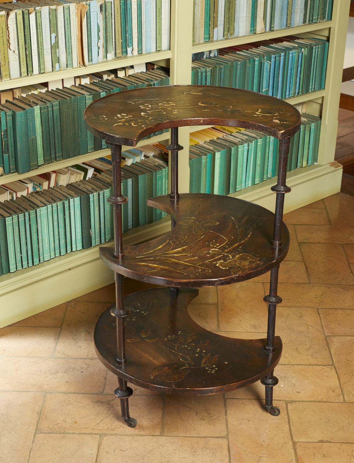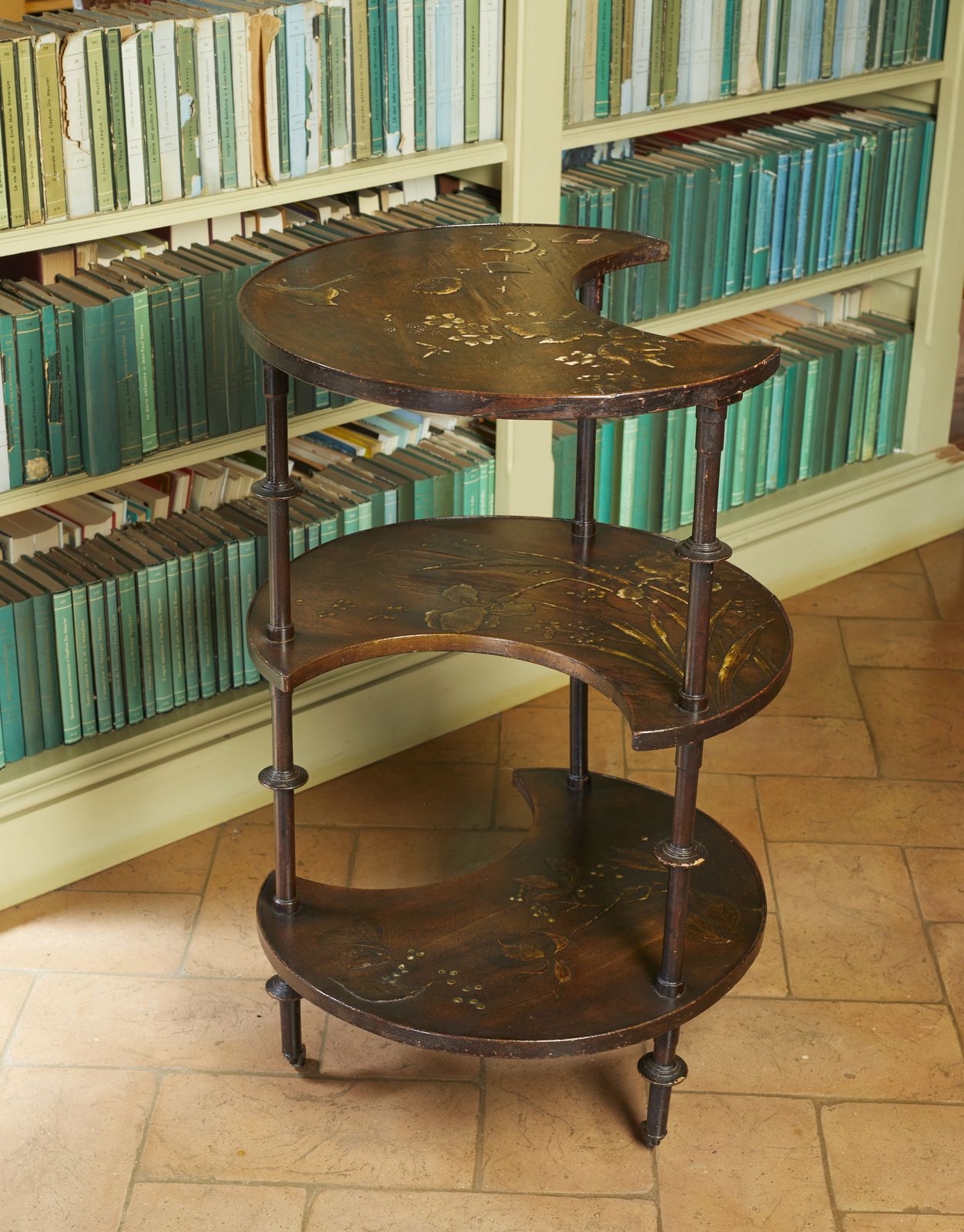 Tavolino in legno con ripiani a mezzaluna e decorazioni fitomorfe a rilievo