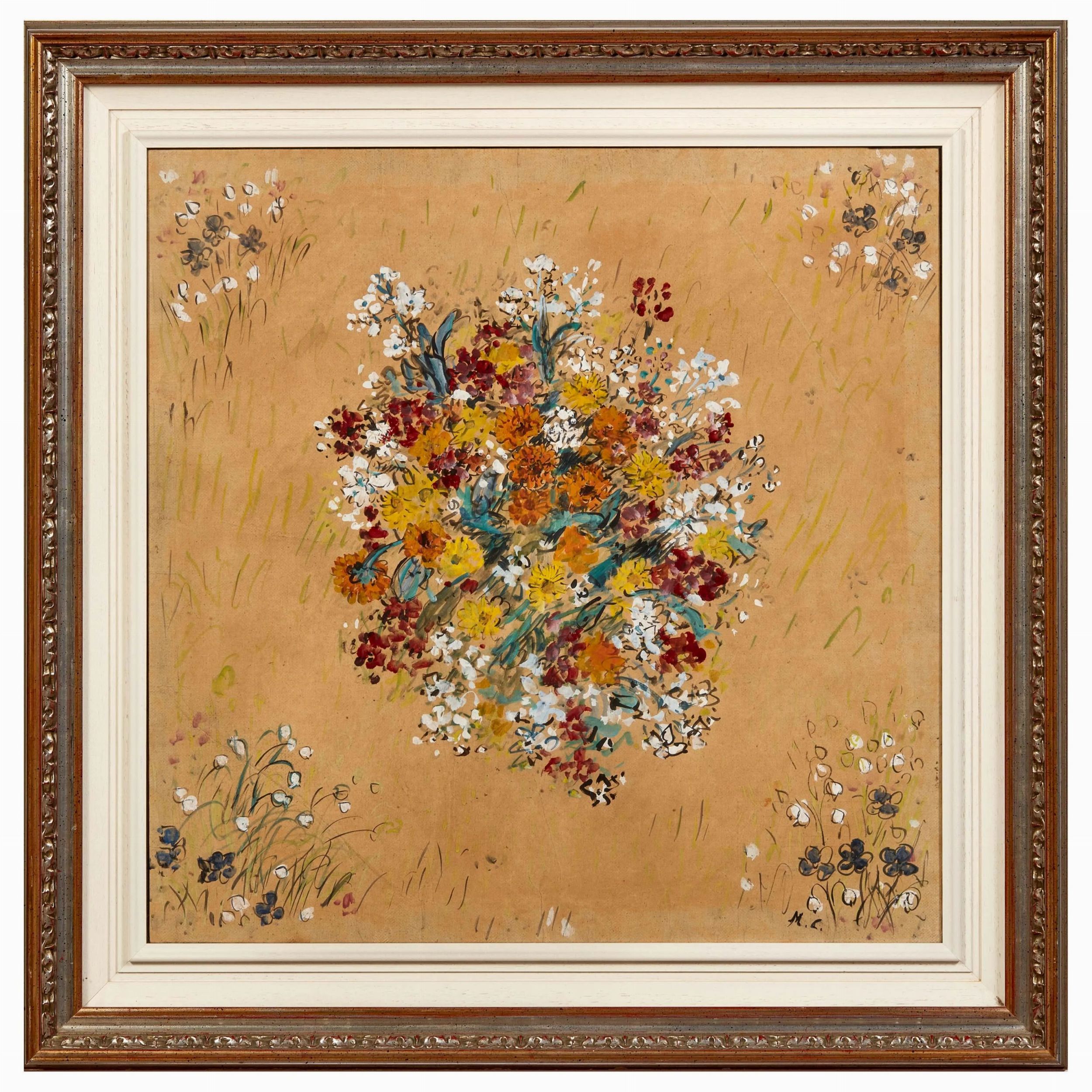 MICHELE CASCELLA (Ortona 1892 - Milano 1989) Fiori tecnica mista su cartone telato cm 65x65 siglato in basso a destra al retro firmato e autenticato al retro della tela timbro illeggibile