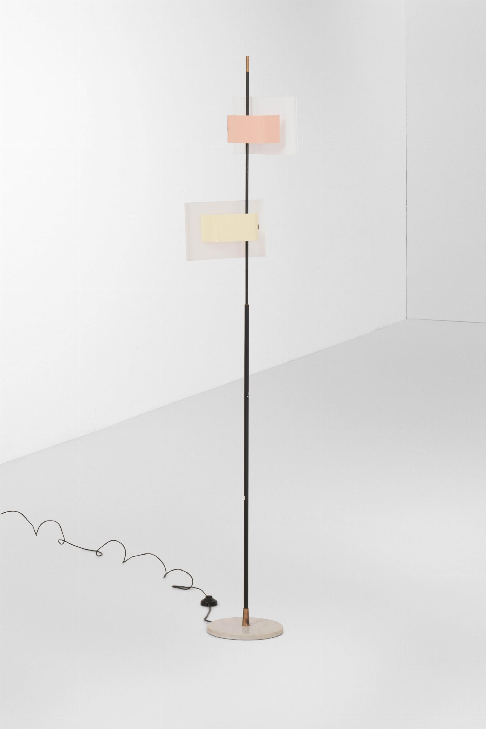 Struttura in metallo laccato, ottone e diffusori orientabili in metacrilato colorato. Base in marmo. Etichetta originale. Prod. Stilnovo, Italia, 1960 ca.