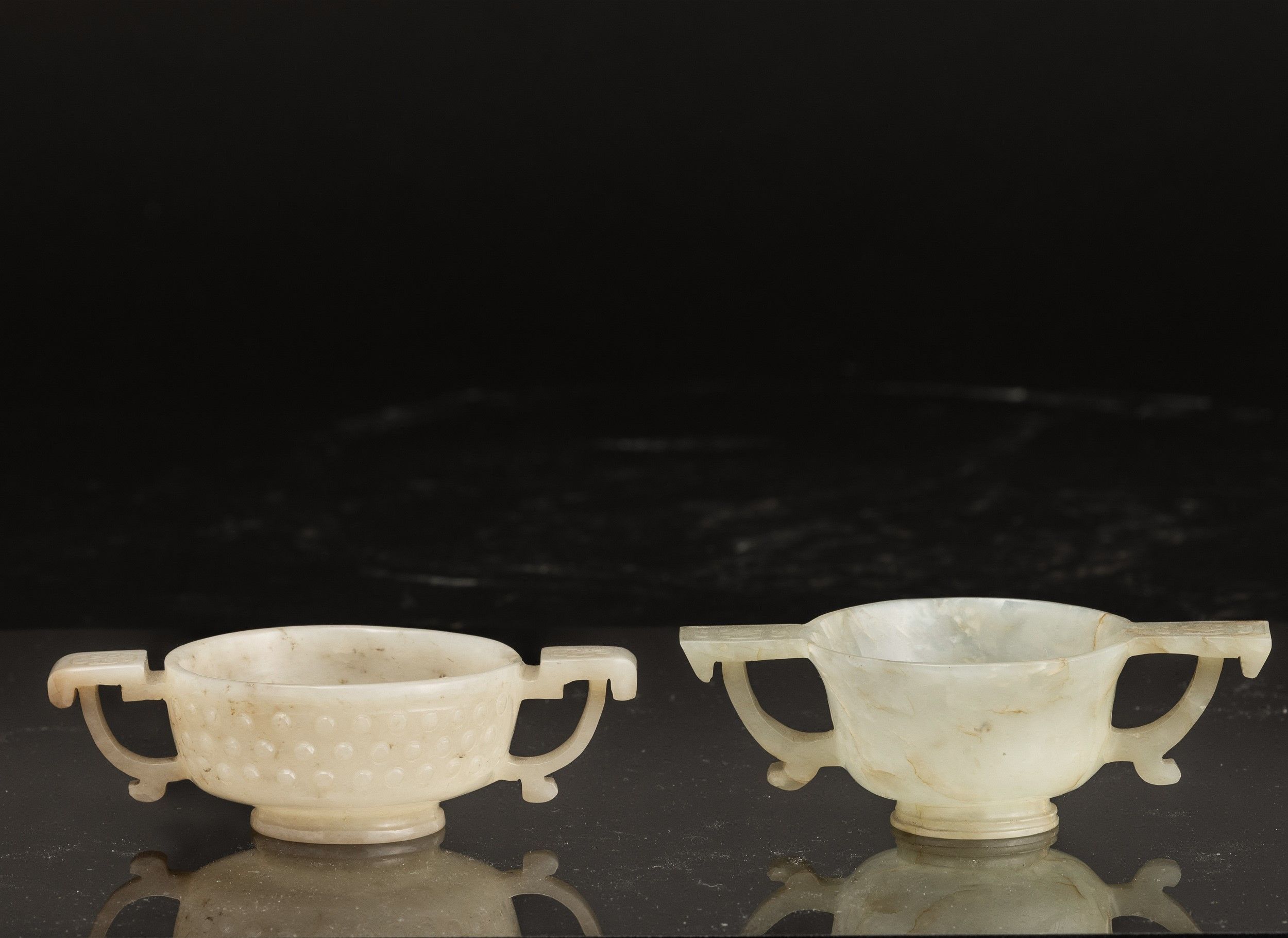 Lotto di due coppette cerimoniale in giada bianca e russet con manici e decori geometrici [..]