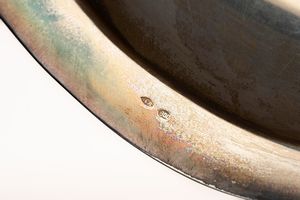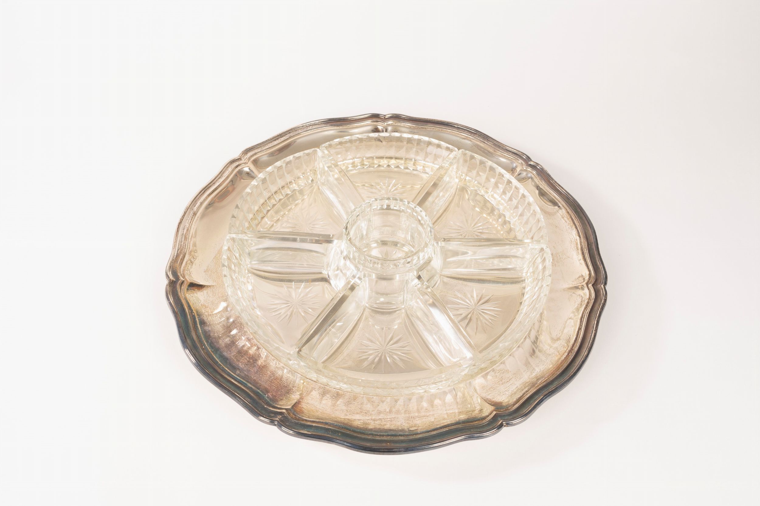 vassoio a bordo polilobato in argento titolo 800, argentiere A. Cesa, con sette contenitori in cristallo molato