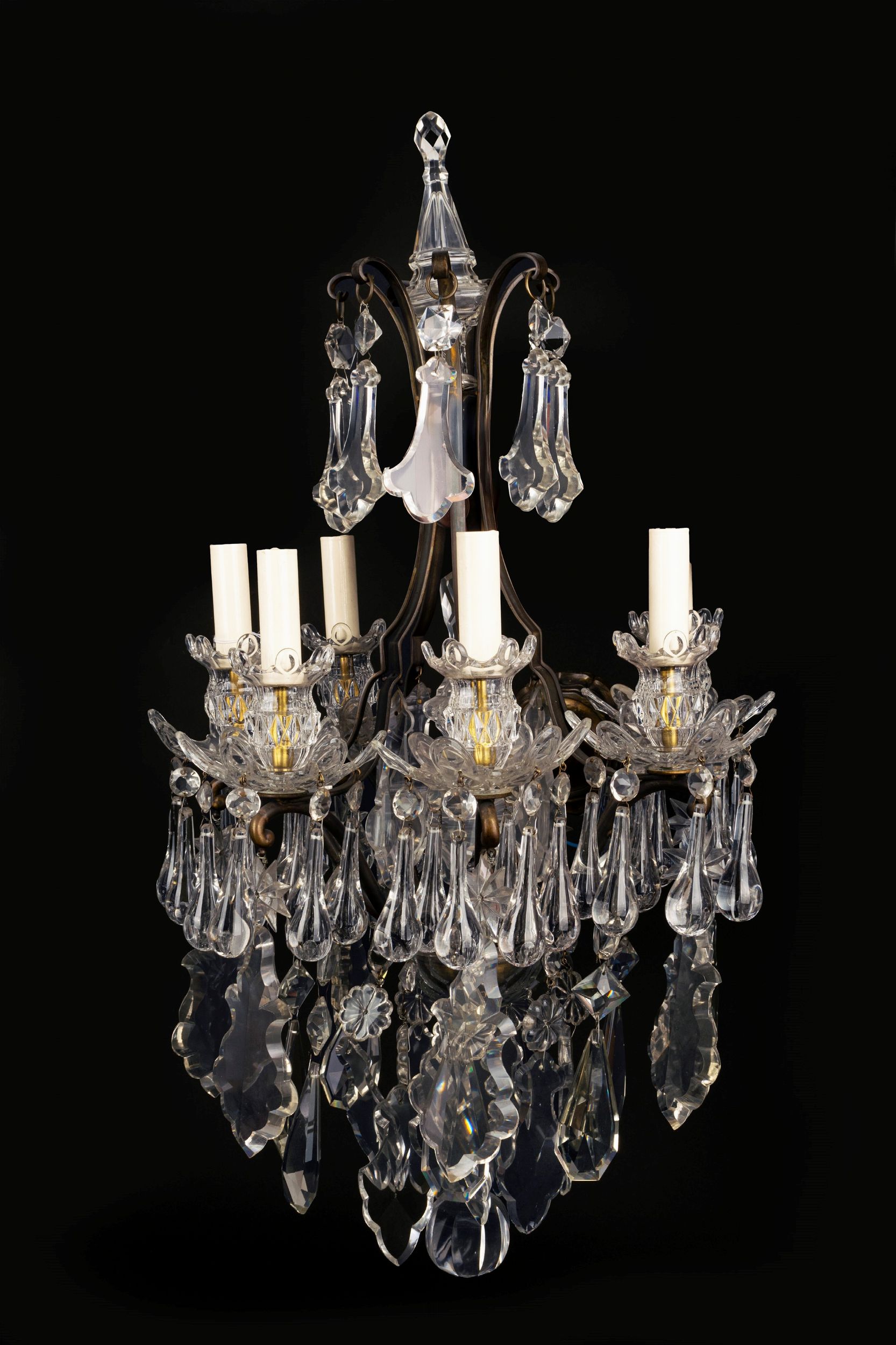 struttura a cesto decorata da pendenti in cristallo a goccia sferica, sfaccetta, sagomata e fiori, sormontata da elemento architettonico a pinnacolo