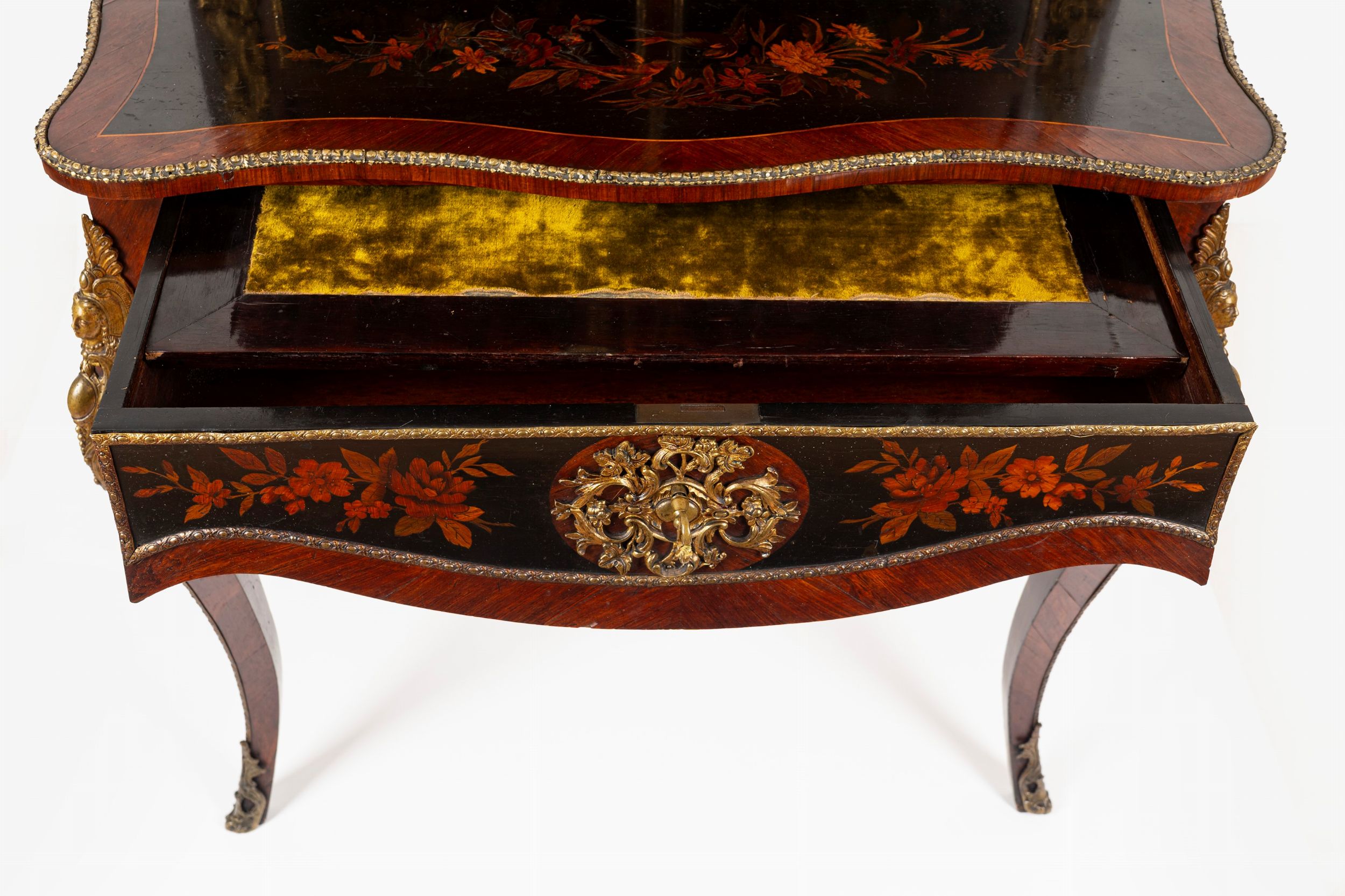 lastronato, filettato e intarsiato a motivi floreali. Parte inferiore ad un cassetto nella fascia, parte superiore a due cassetti e due ante celanti ripiano. Applicazioni, profili e finali a vasi biansati dorati