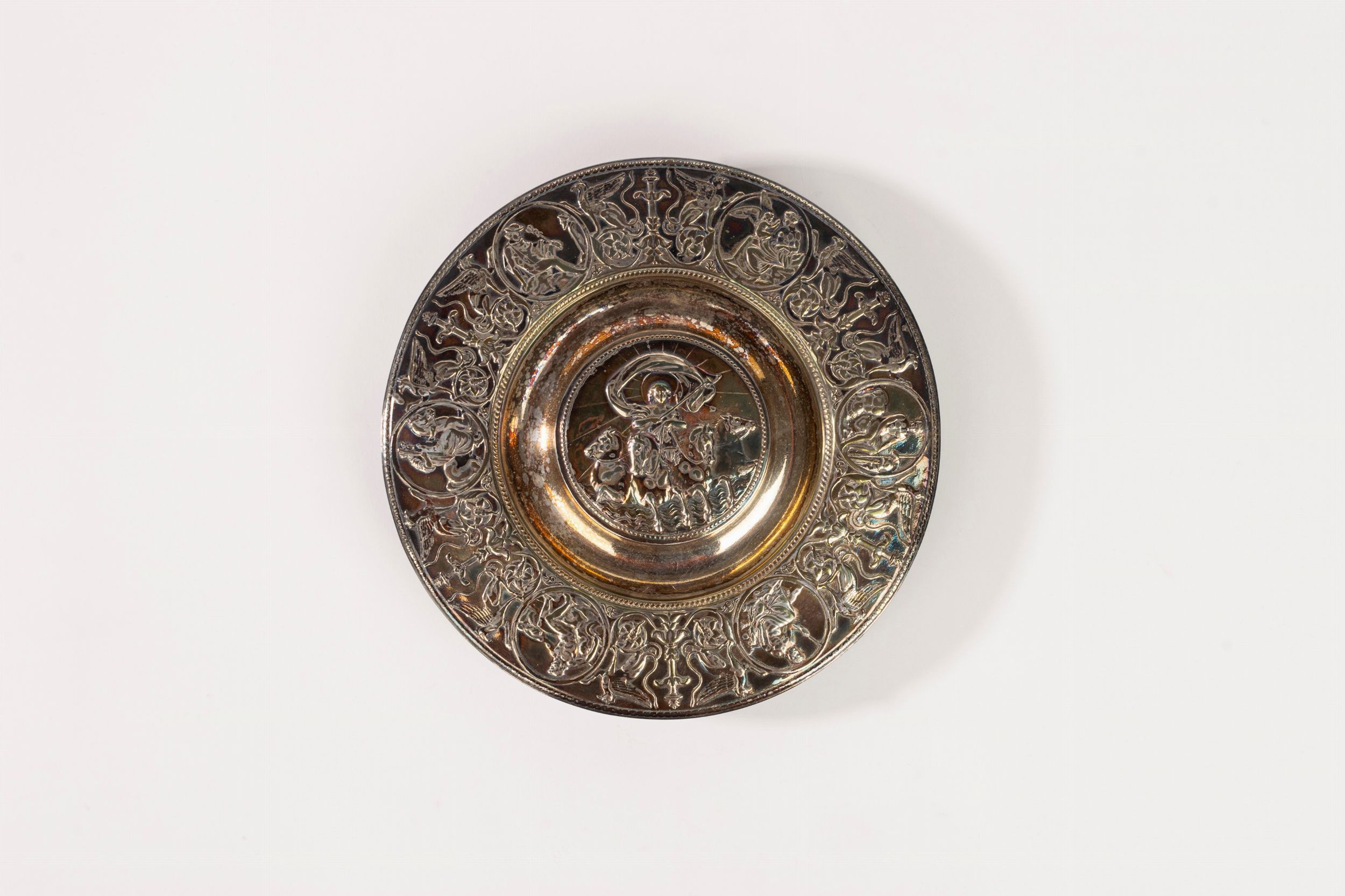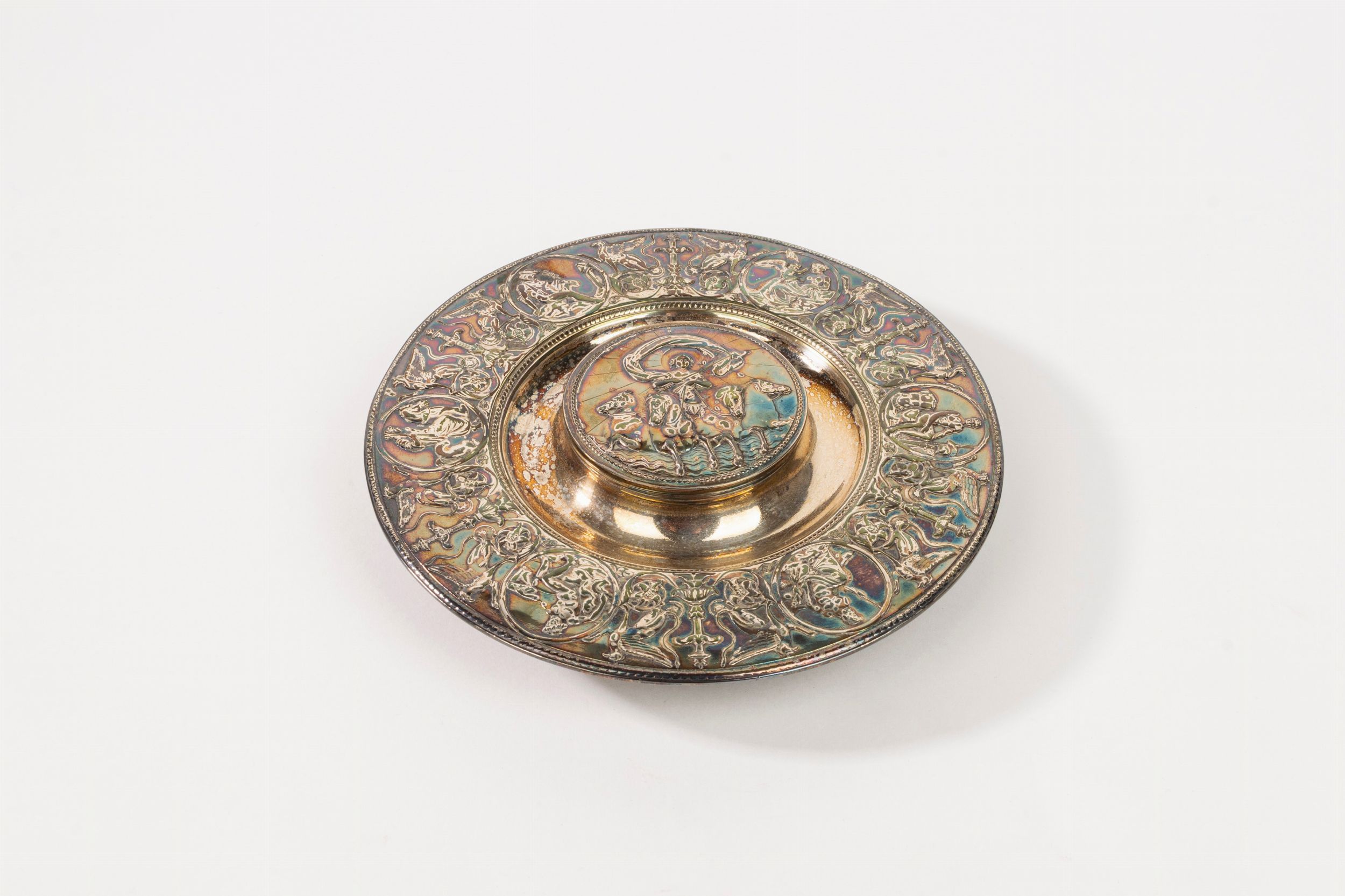 il coperchio sbalzato con Apollo che guida il carro del Sole e sulla tesa motivi a grottesche e divinità entro clipei
