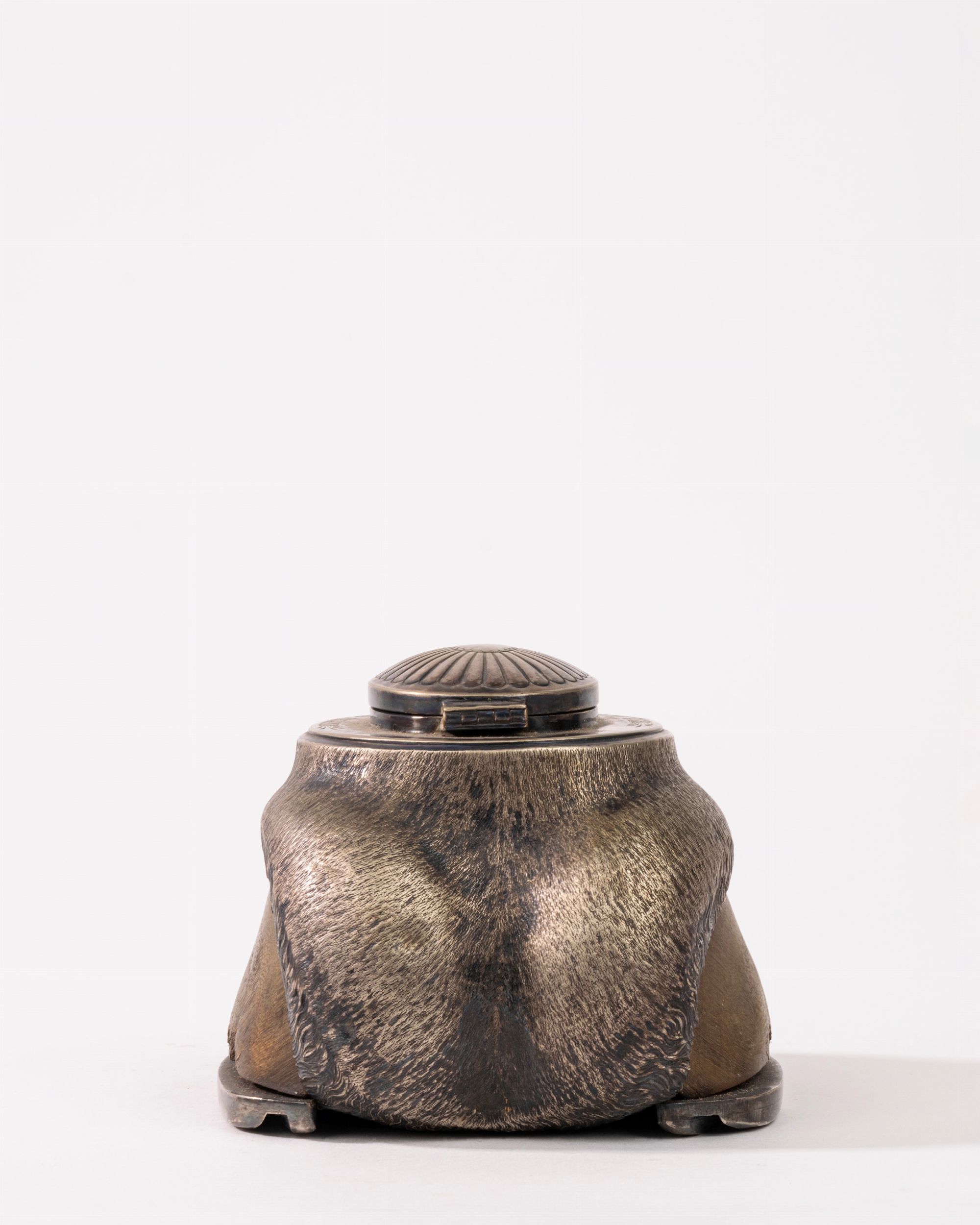 Calamaio in zoccolo di cavallo e metallo argentato. Inghilterra, secolo XIX