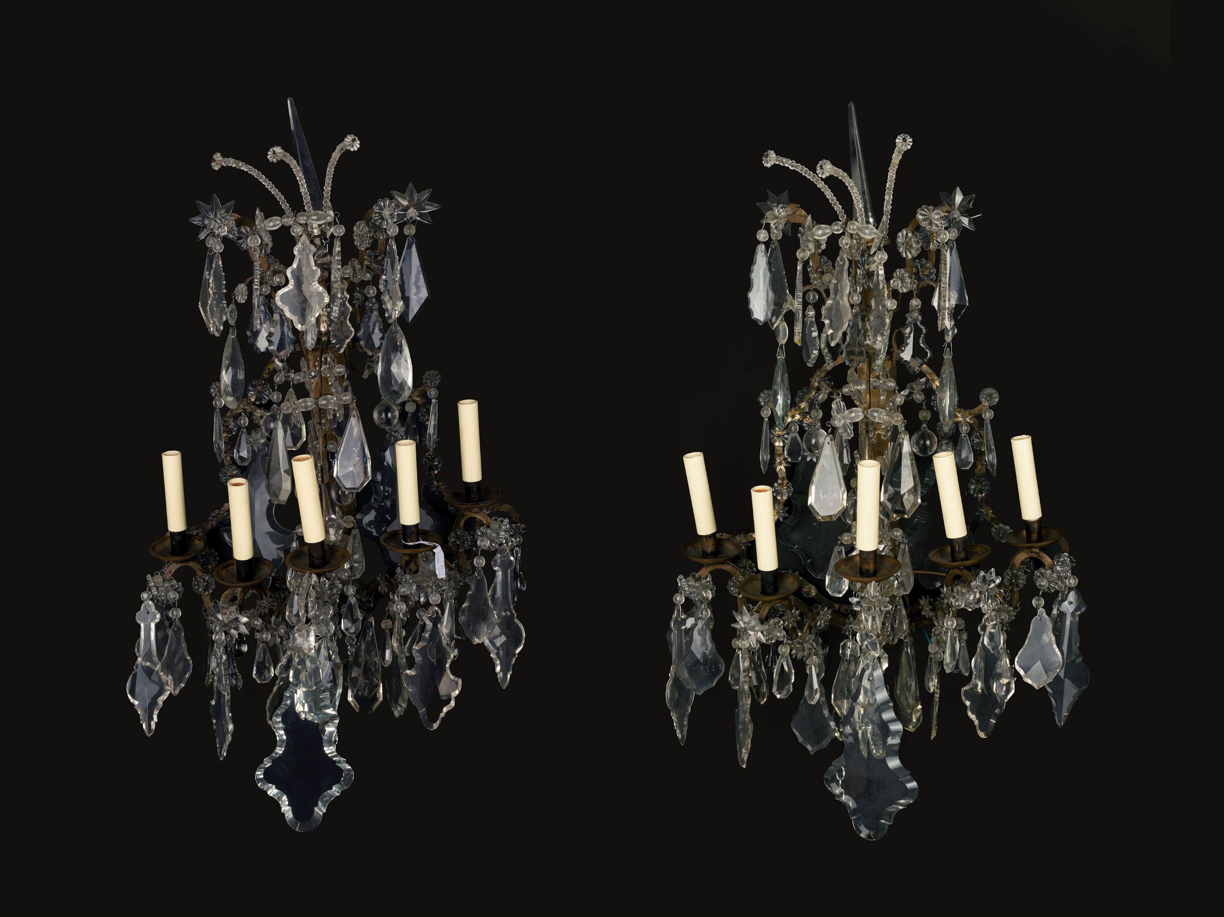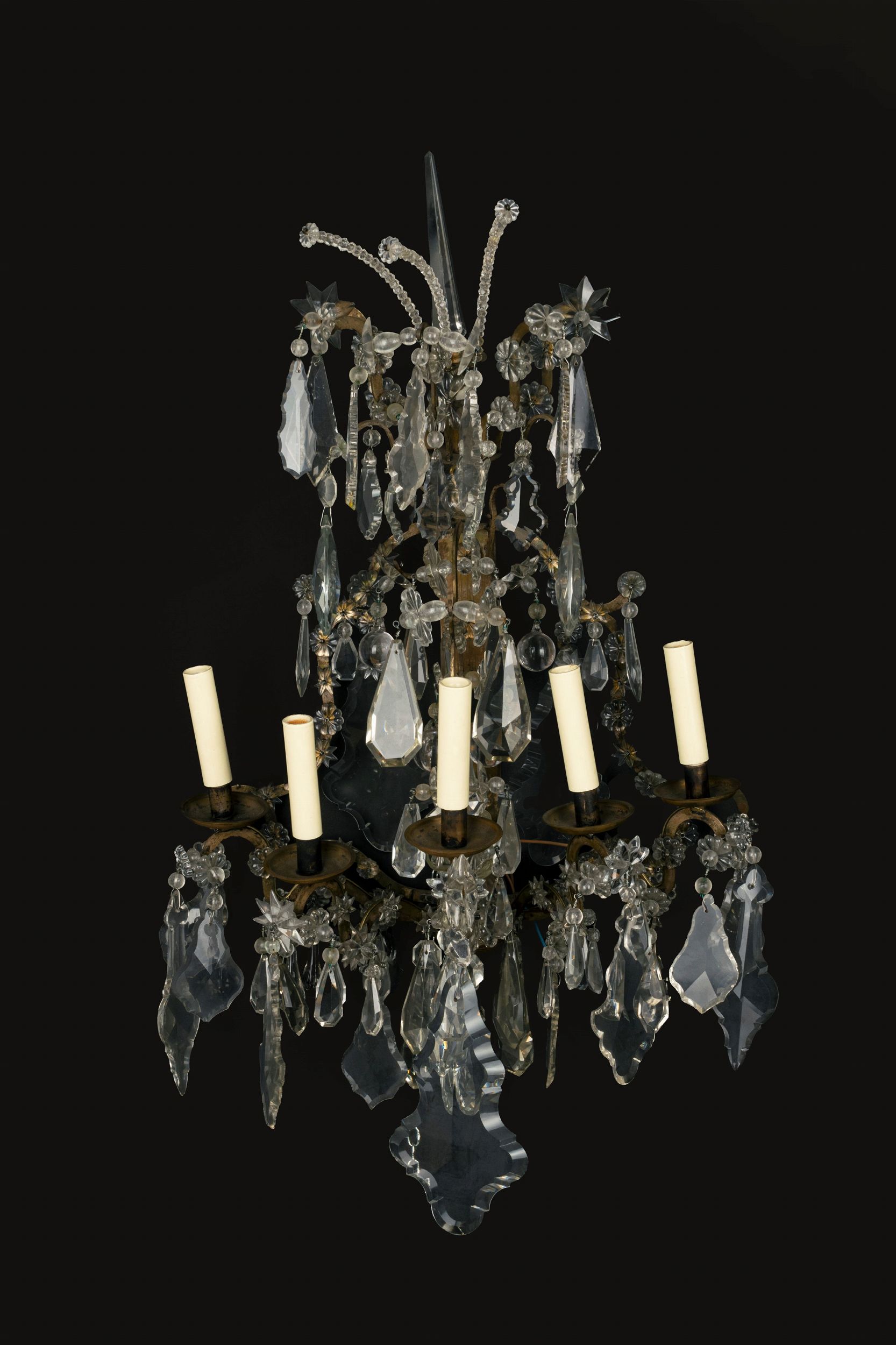 decorati da pendenti in cristallo a gocce sfaccettate, sagomate e fiori, la struttura ornata da due elementi troncopiramidali (mancanze)