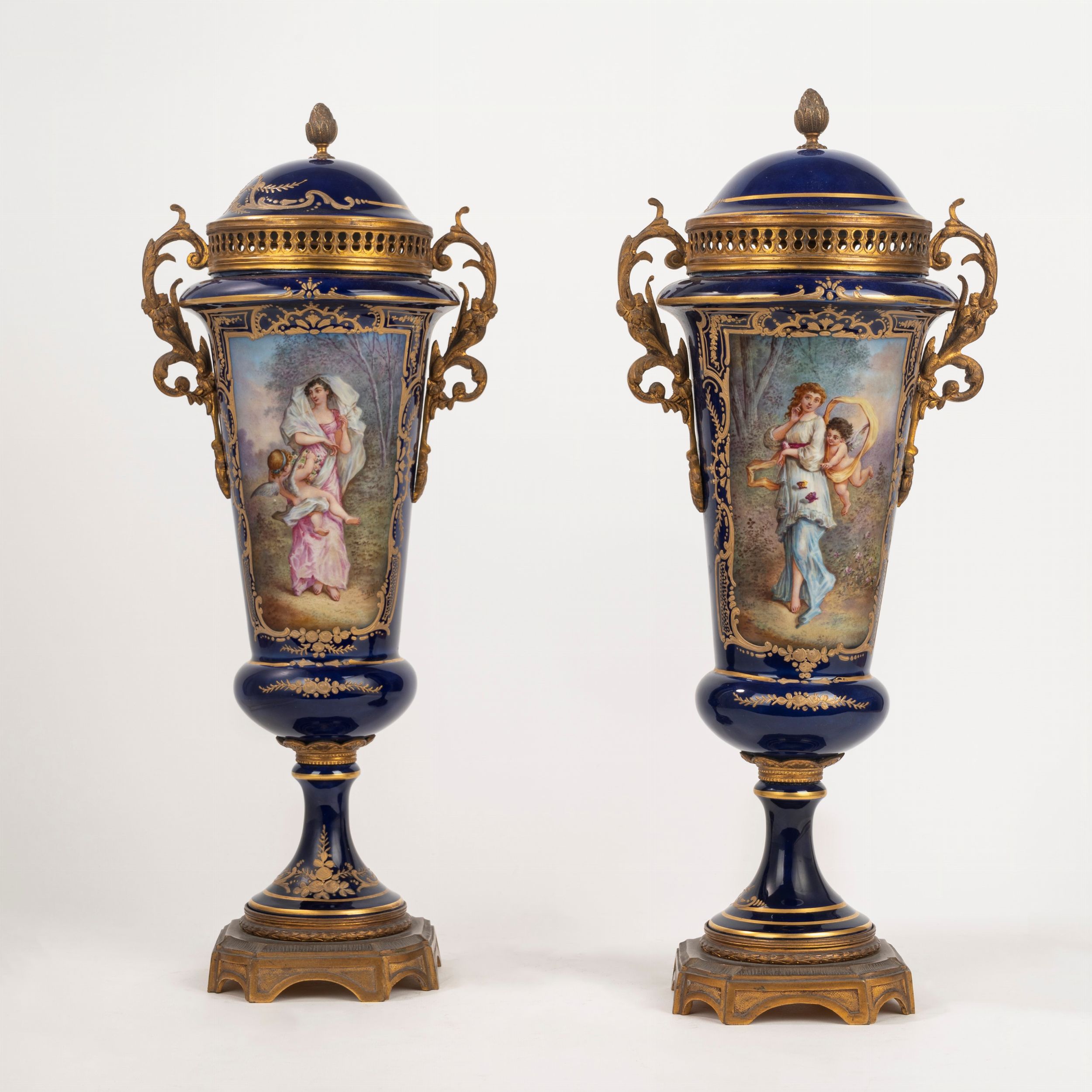 Coppia di vasi pot-pourri biansati con coperchi in porcellana di Sèvres con guarnizioni [..]