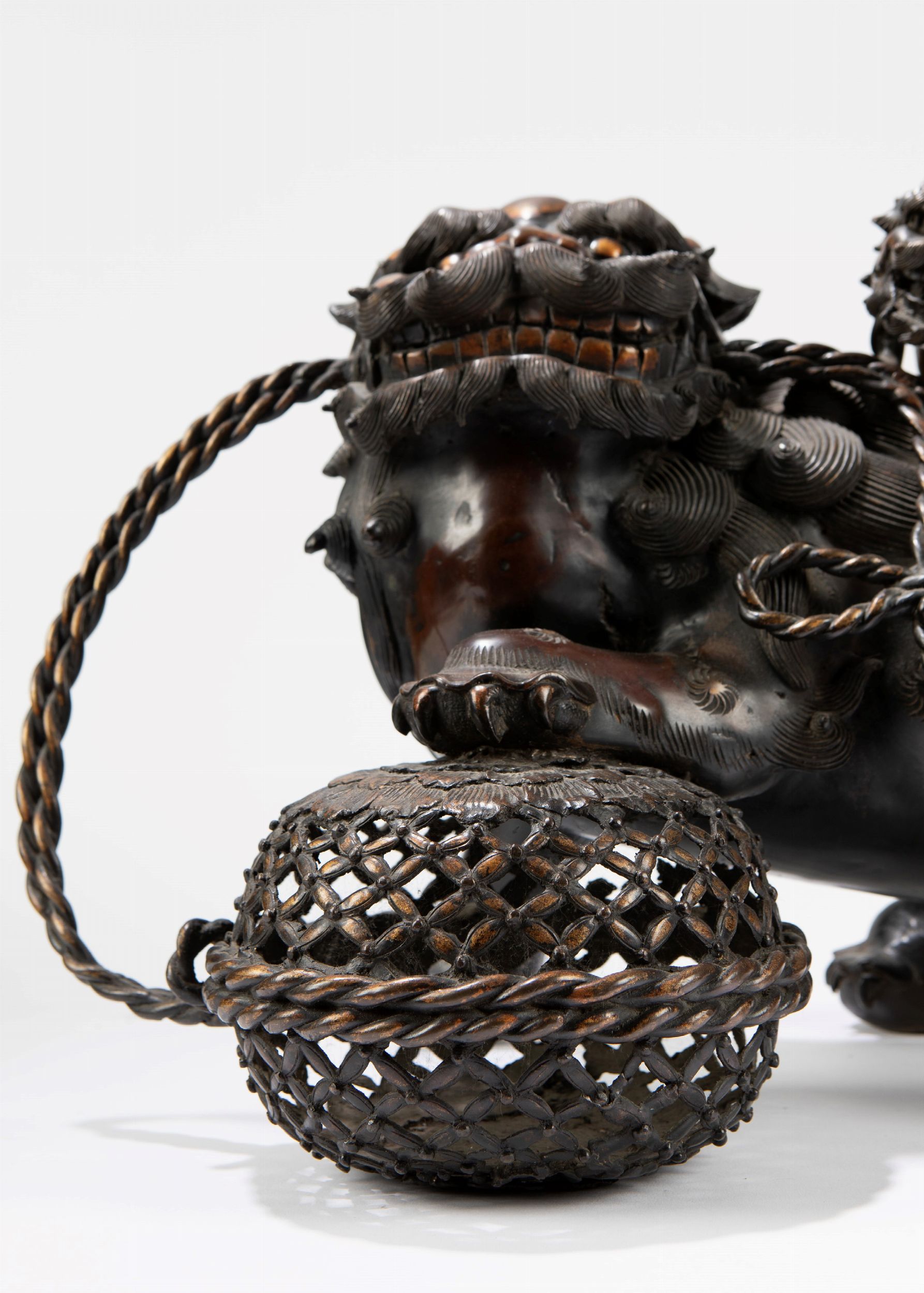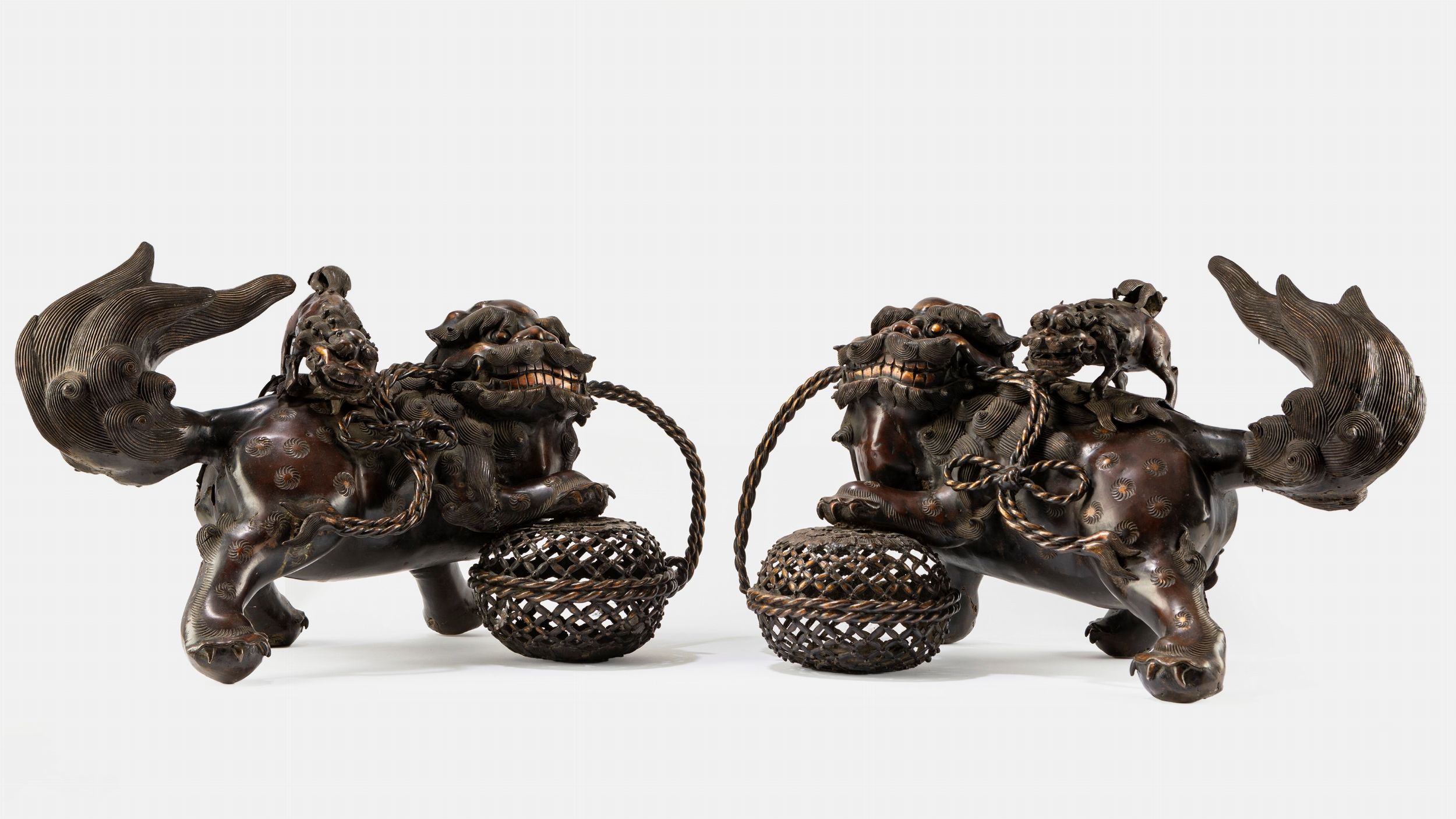 h cm 36 x l cm 72 Giappone, secolo XIX a foggia di leoni buddisti con mascelle potenti e un'espressione feroce enfatizzata dalle folte sopracciglia; la criniera ricca di ciocche arricciate, il corpo, decorato con fiori stilizzati, termina con grandi code rivolte verso l'alto, entrambi poggiano la zampa sinistra su una grande palla di broccato, mentre tengono tra le fauci un fiocco di corda ad esso collegato; sono sormontati sul dorso da due coperchi a guisa di cuccioli di leone (difetti) 石湾窑陶瓷凋塑六件,印度,19世纪