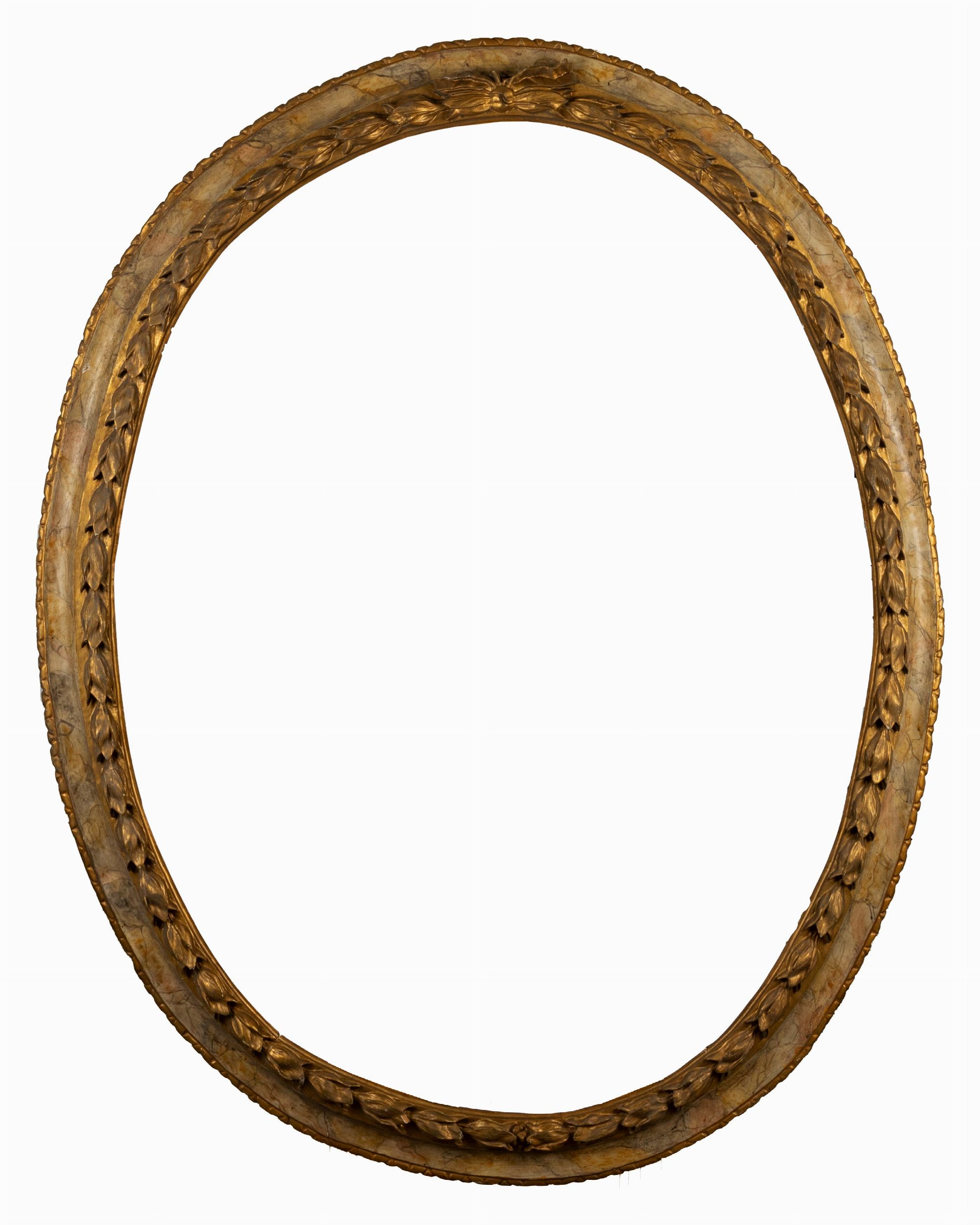 Grande cornice ovale in legno intagliato e parzialmente dorato. Secolo XIX
