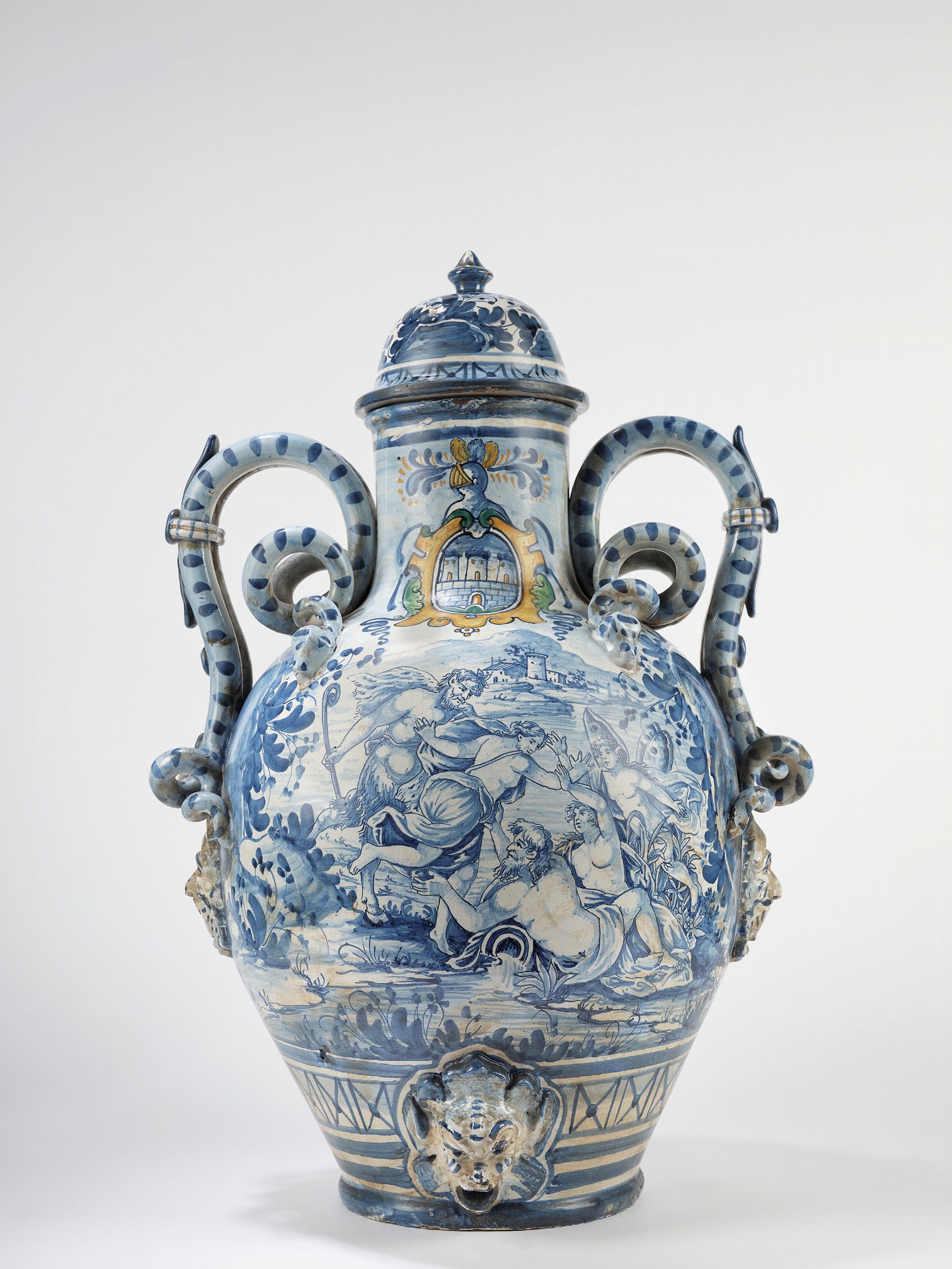 h tot cm 75 secolo XIX anse a serpenti con mascherone all'attacco, fronte decorato nei toni del blu cobalto a scena mitologica sormontata da stemma araldico in policromia, retro a paesaggio (restauri)