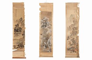 Cina, secolo XX Raffiguranti paesaggi montani con pagode, alberi e fiumi (difetti e strappi)